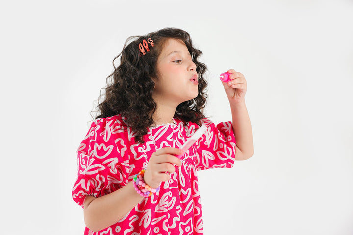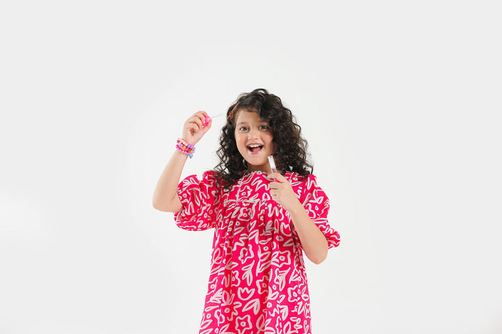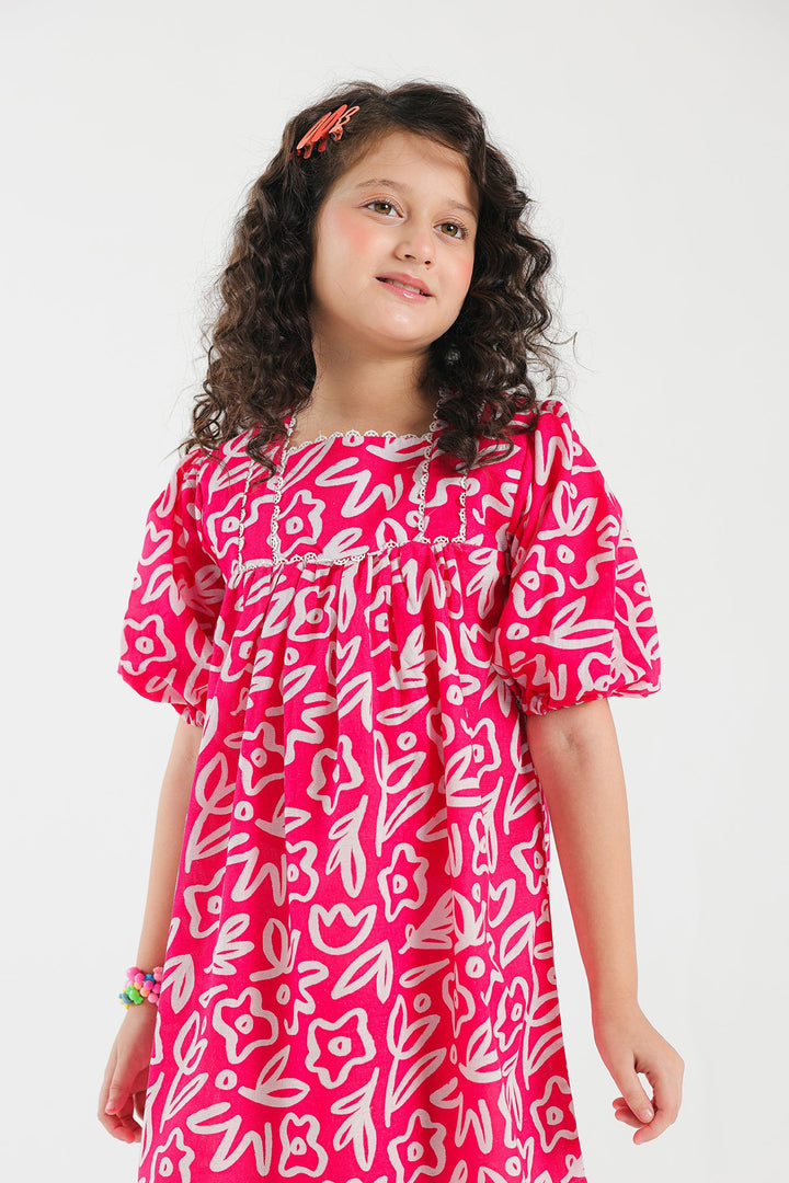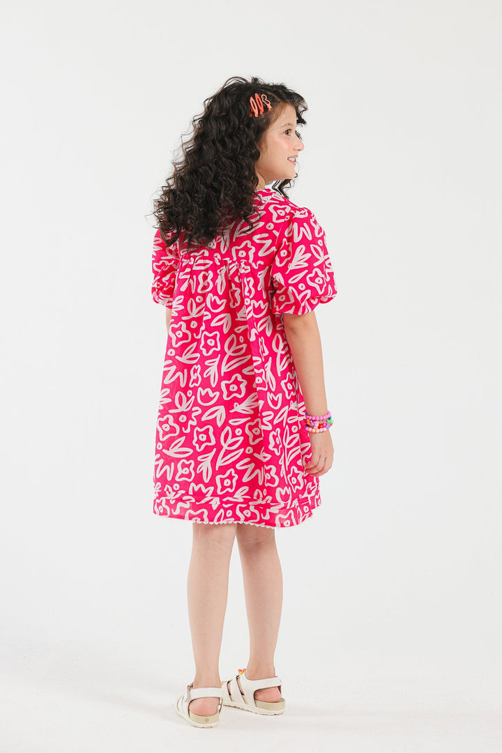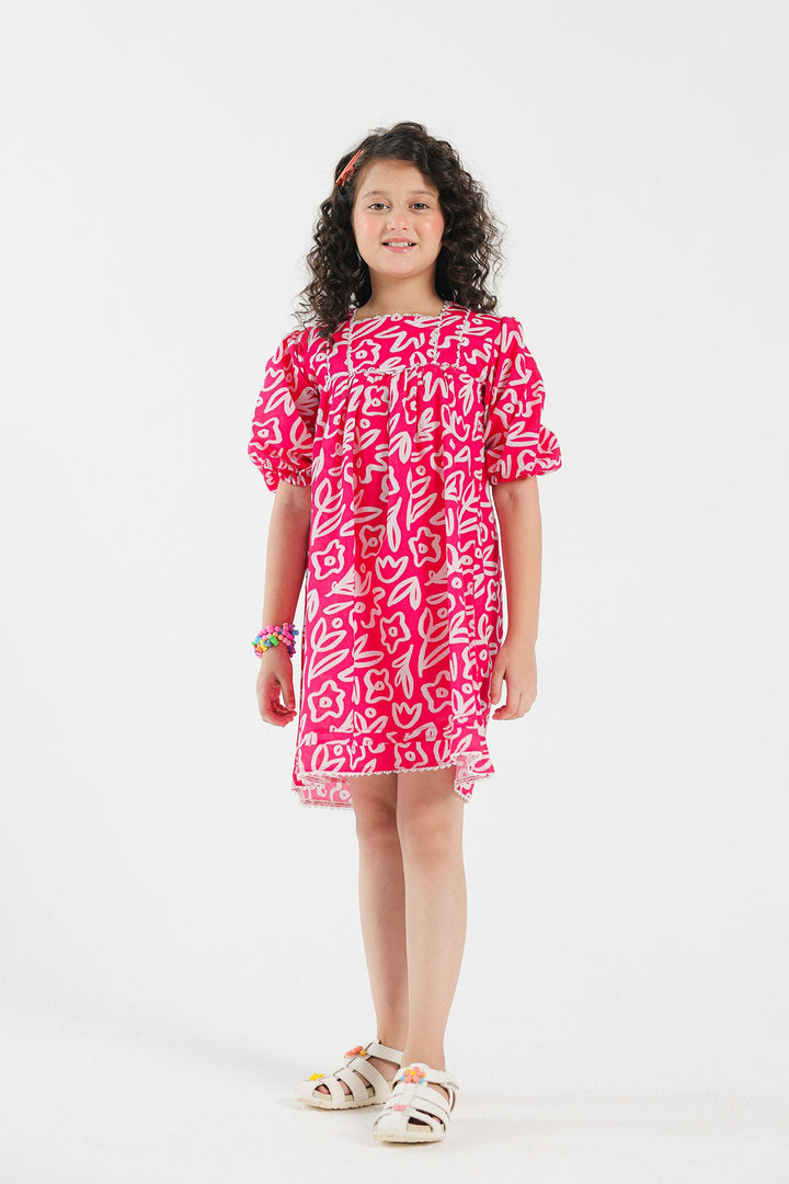 This graceful dress is an elegant choice for kids fashion. Its appealing fuchsia canvas is enriched with captivating prints illustrating floral designs in mesmerizing hues layered on a contemporary silhouette with gathers and elasticated sleeves opening. A must-have for little girls and is perfect for summer parties.