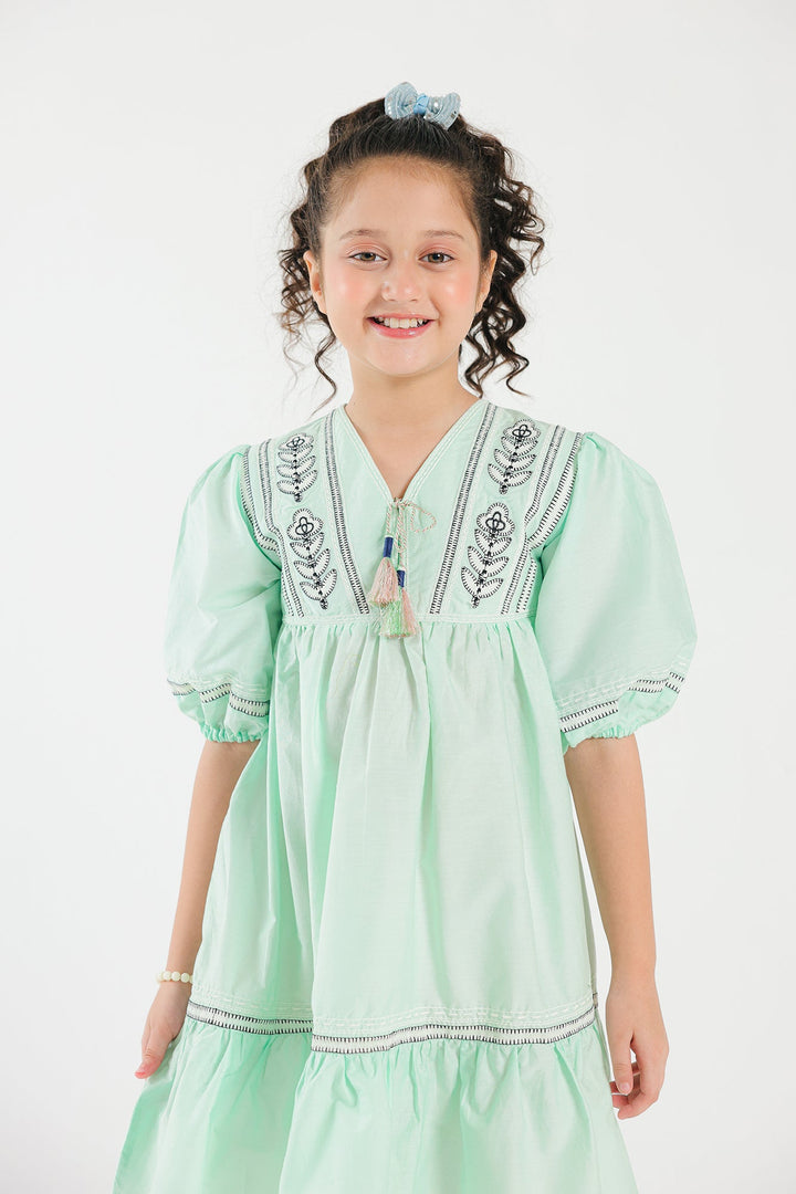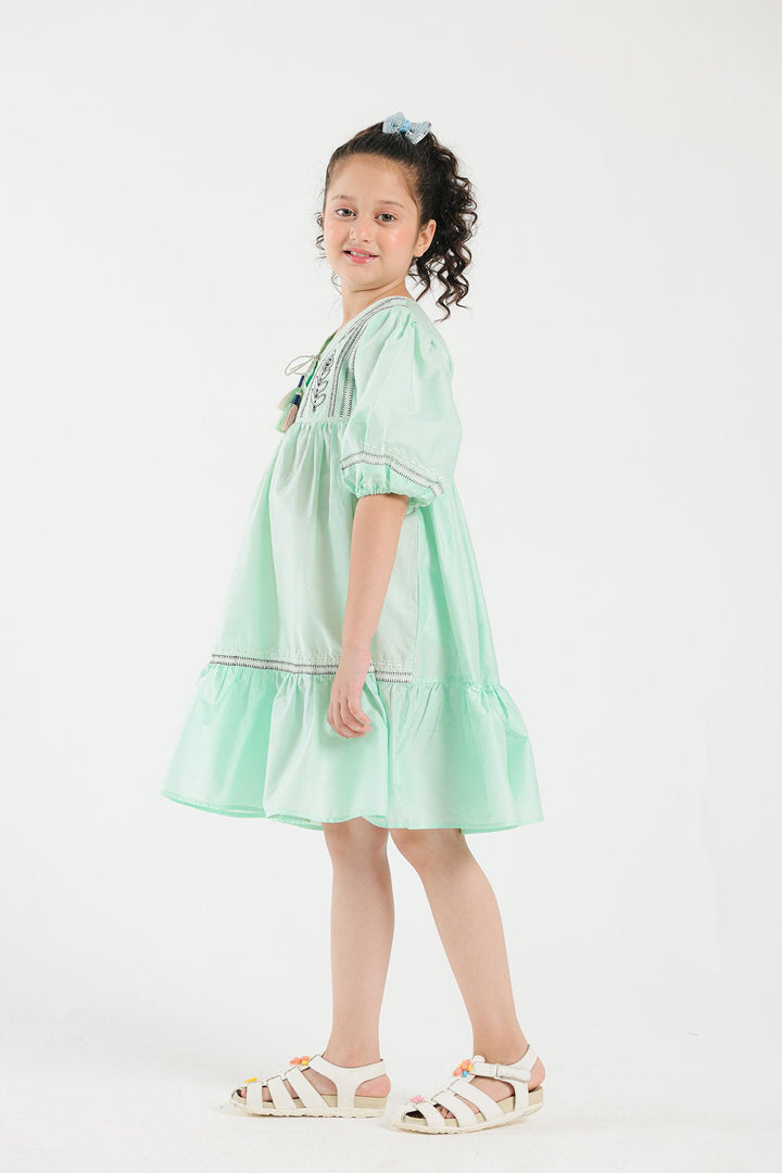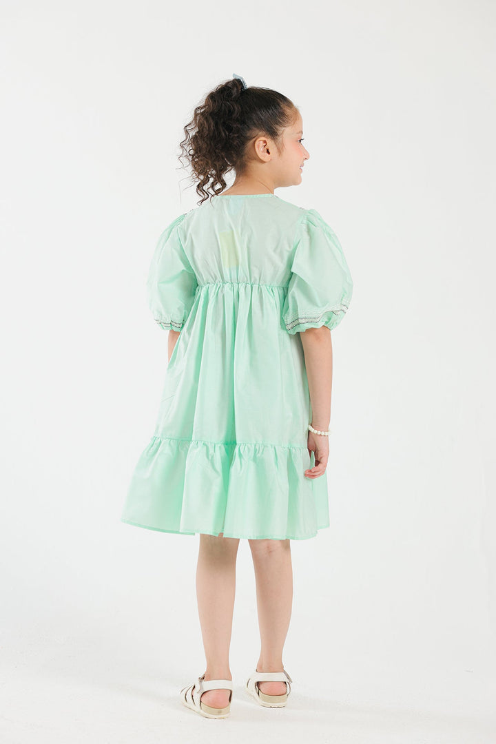 This dress features a light sea green shade adorned with intricate embroidery, adding a touch of elegance to its playful design. The dress has puffed sleeves and a tiered silhouette adorned with gathers offering a charming and comfortable fit. Perfect for any special occasion or a delightful day out, this dress effortlessly combines style and comfort for a standout look.