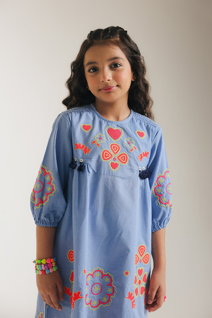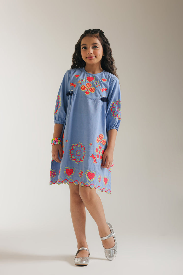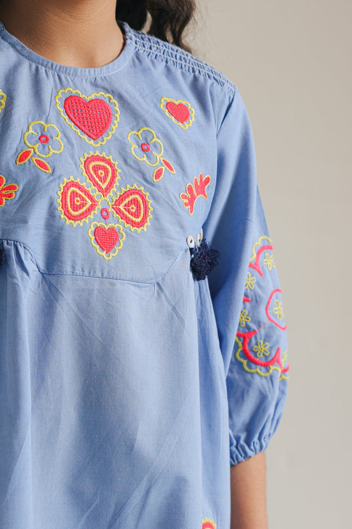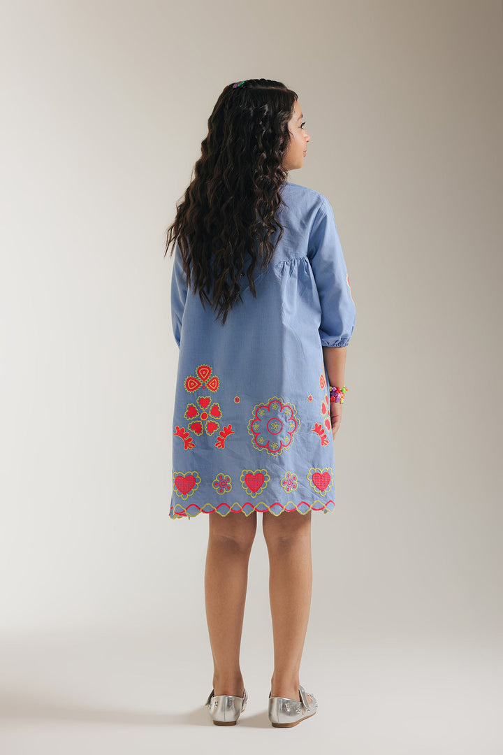 This stylish blue dress with playful floral embroidery in shades of red and yellow will add a touch of fun and flair in your little one’s wardrobe. The scalloped hem adds a touch of whimsy. The dress features a comfortable, relaxed fit and three-quarter length sleeves, making it perfect for a variety of occasions.