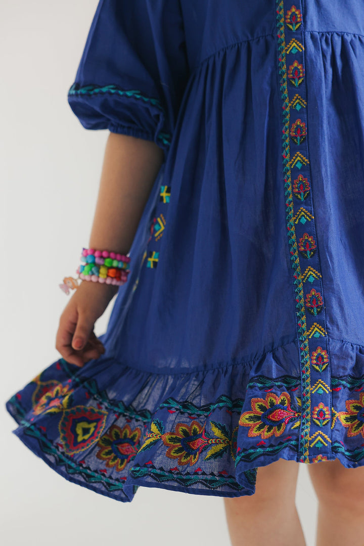 This elegant dress features vibrant cobalt fabric and intricate geometric embroidery in mesmerizing hues. Its contemporary silhouette makes it perfect for fun parties, adding class to your look this season.