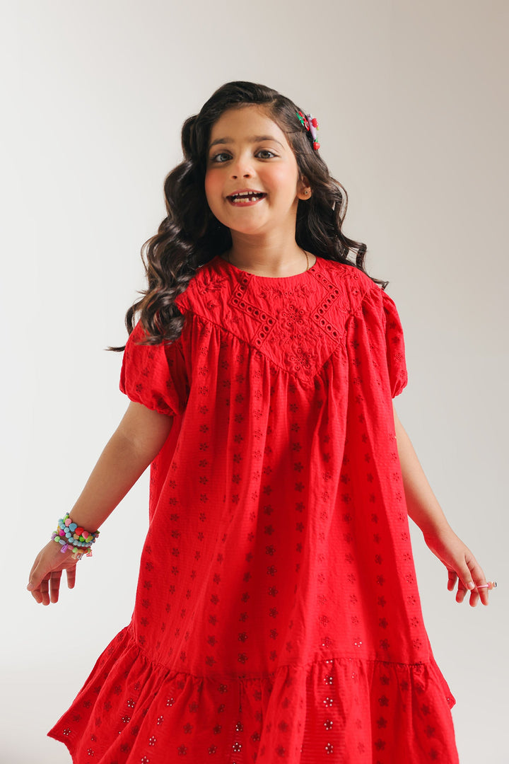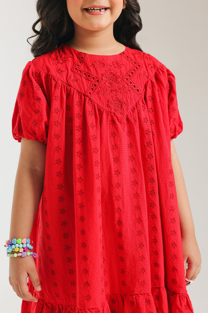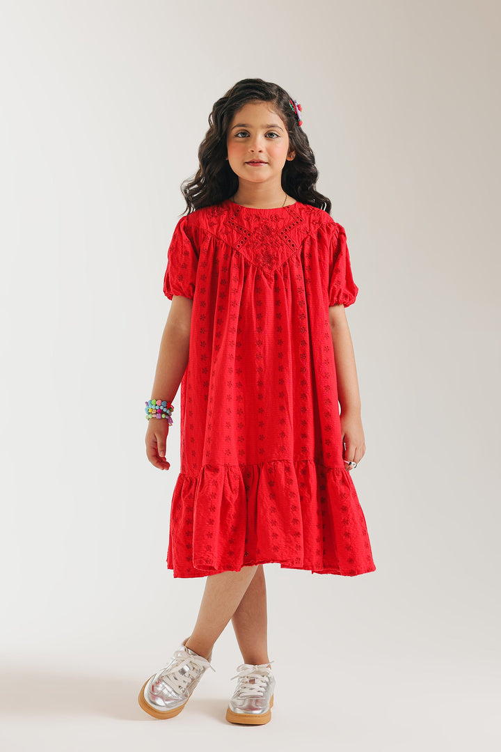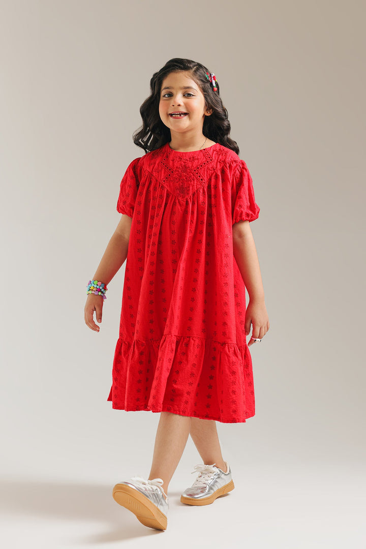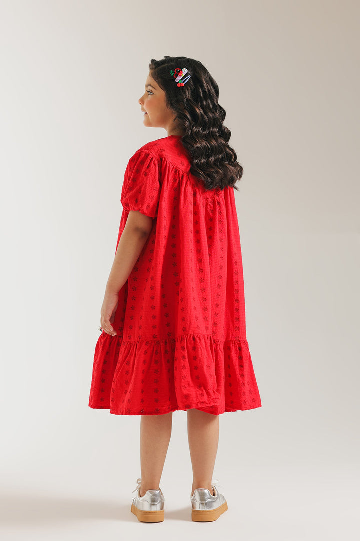 Dress her in vibrant charm with this adorable and comfortable red dress! This cheerful dress features a playful textured fabric with subtle patterns and a delightful tiered skirt, creating a fun and flowy silhouette. With its relaxed short sleeves and round neckline, it's perfect for her everyday adventures, playdates, or adding a joyful and stylish splash of color to her look.