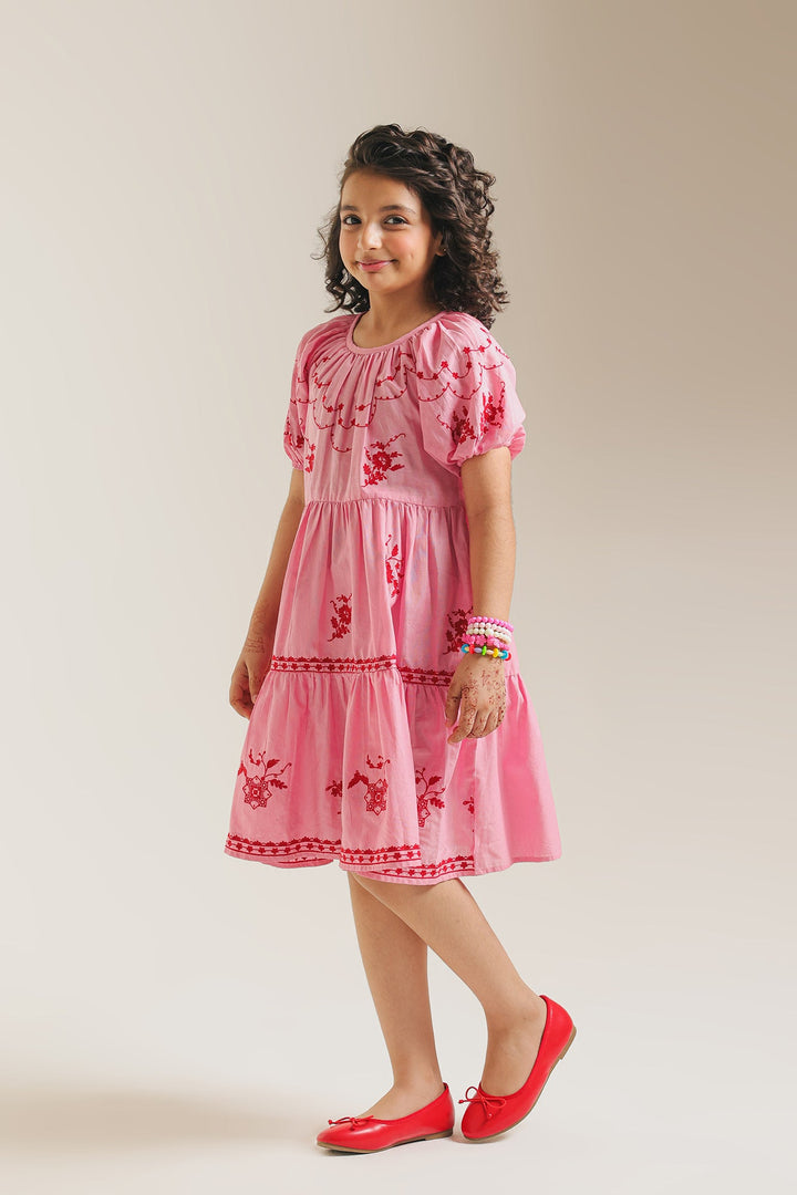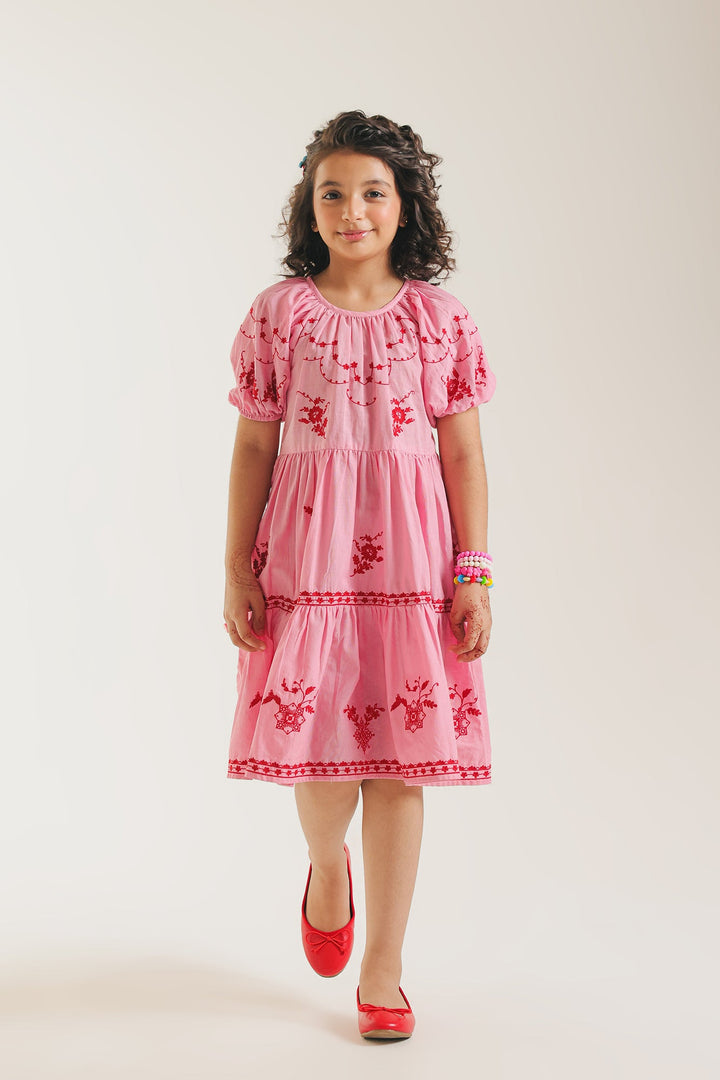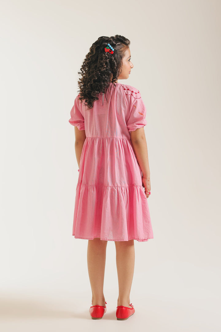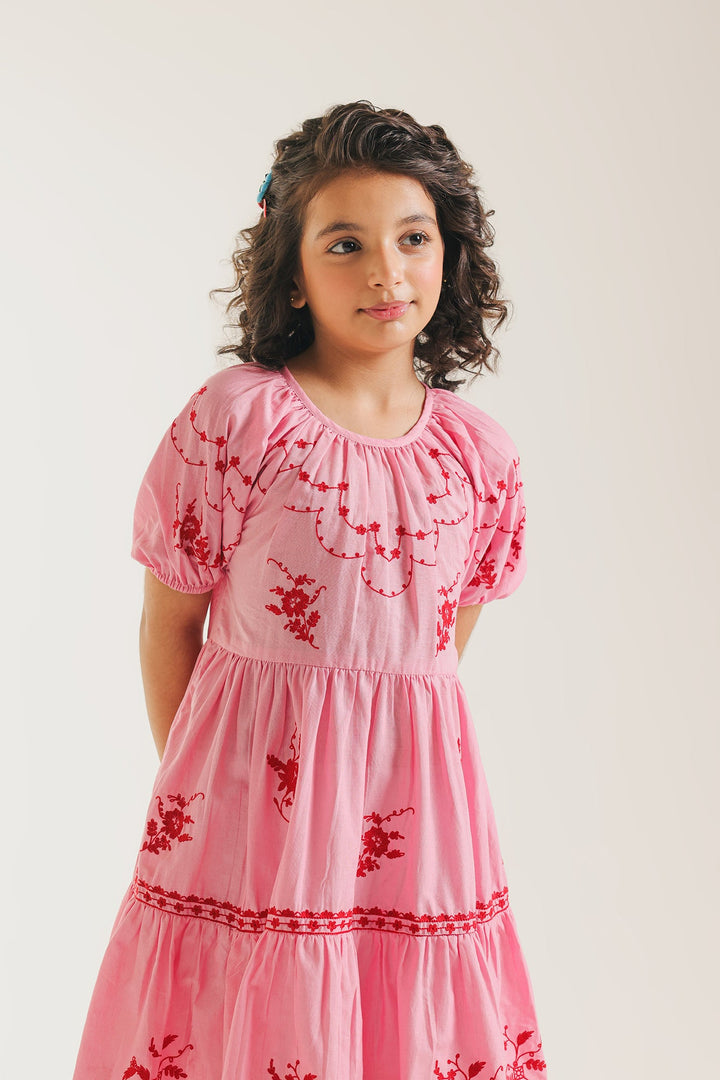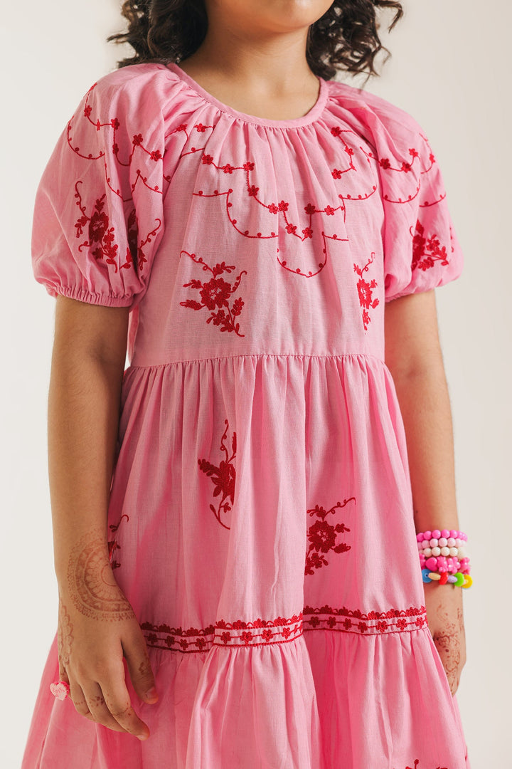 Let her twirl into a world of delight with our enchanting Pink Embroidered Tiered Dress! Crafted from soft, breathable cotton, this charming dress features intricate red floral embroidery that dances across the bodice and tiered skirt. The comfortable, relaxed fit and puff sleeves make it perfect for playful days and special occasions alike, ensuring she feels as good as she looks.