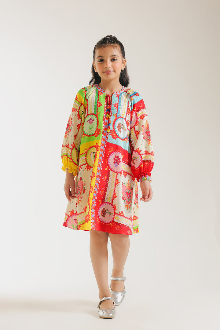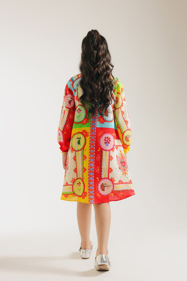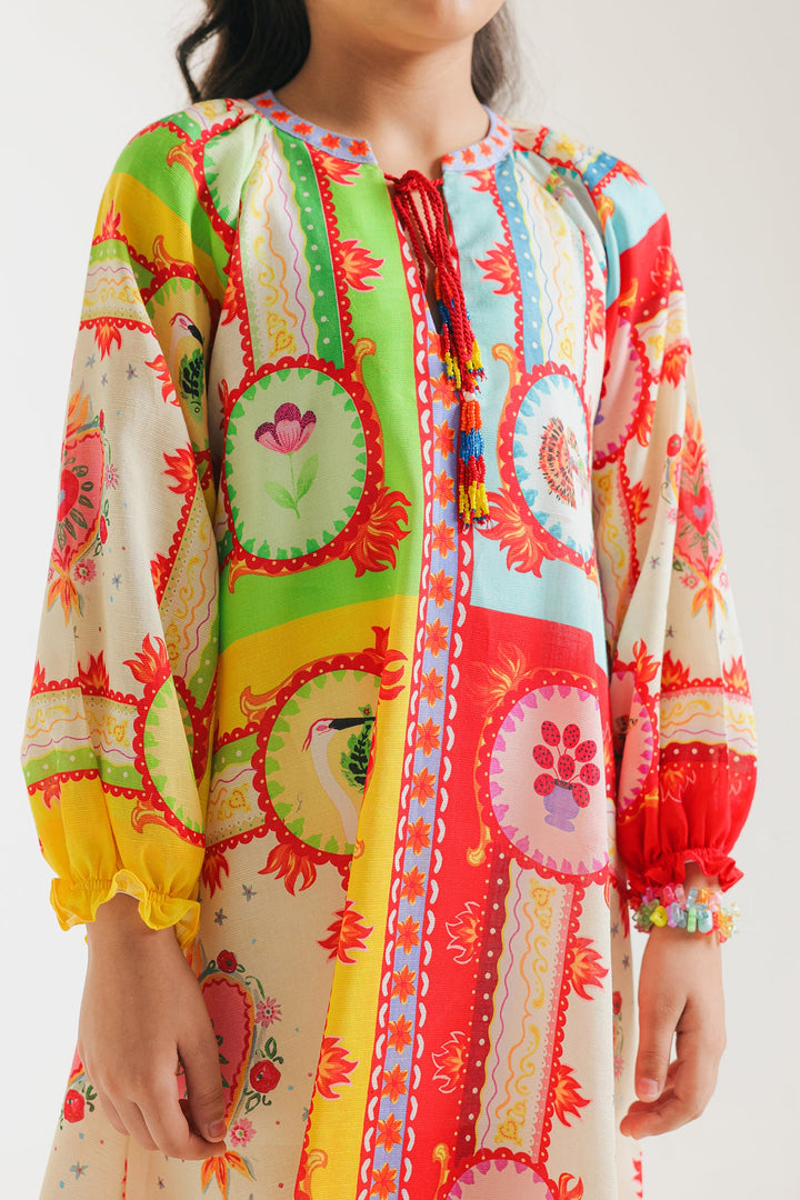 The dress is perfect for girls, offering both style and comfort for any occasion. Its round neckline with dori and beaded tassles as well as the vibrant abstract illustrations, add a playful touch to the sophisticated dress. Made with high-quality materials, this is a essential piece for your girl's wardrobe.