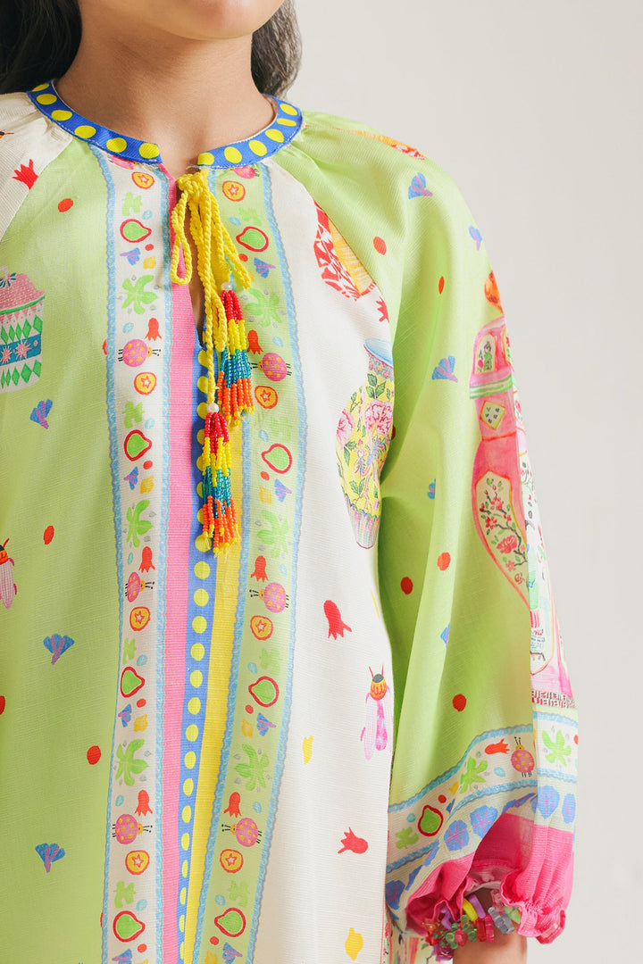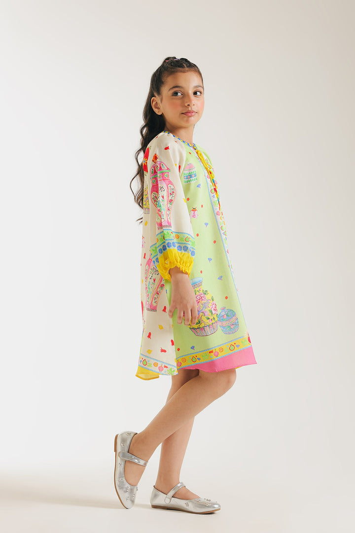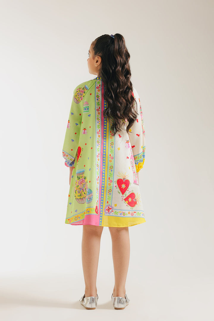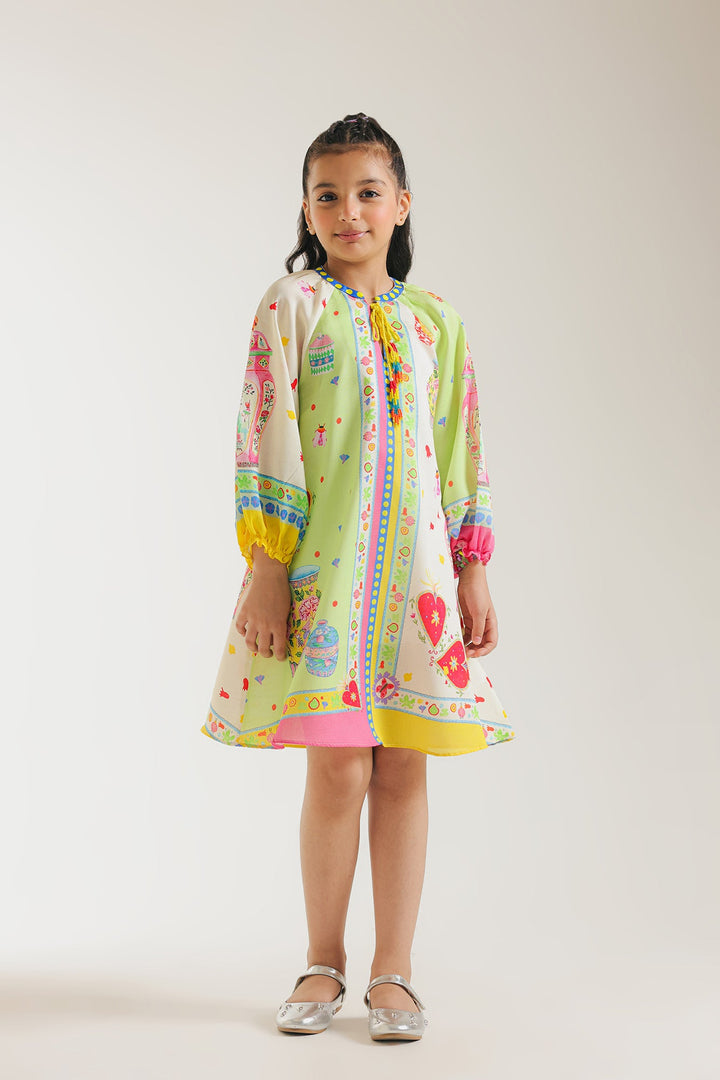 The dress is perfect for girls, offering both style and comfort for any occasion. Its round neckline with dori and beaded tassles as well as the vibrant abstract illustrations, add a playful touch to the sophisticated dress. Made with high-quality materials, this is a essential piece for your girl's wardrobe.