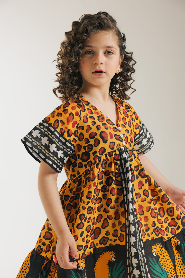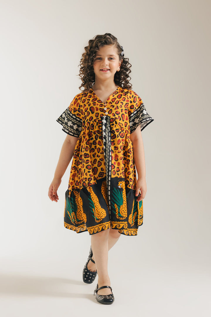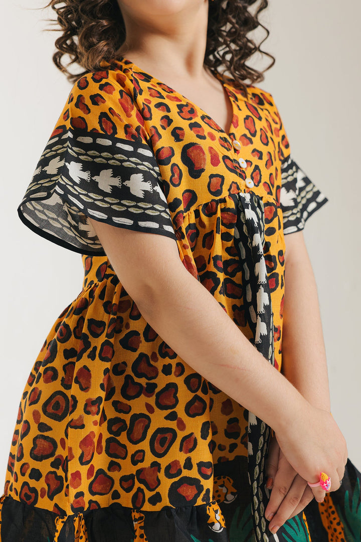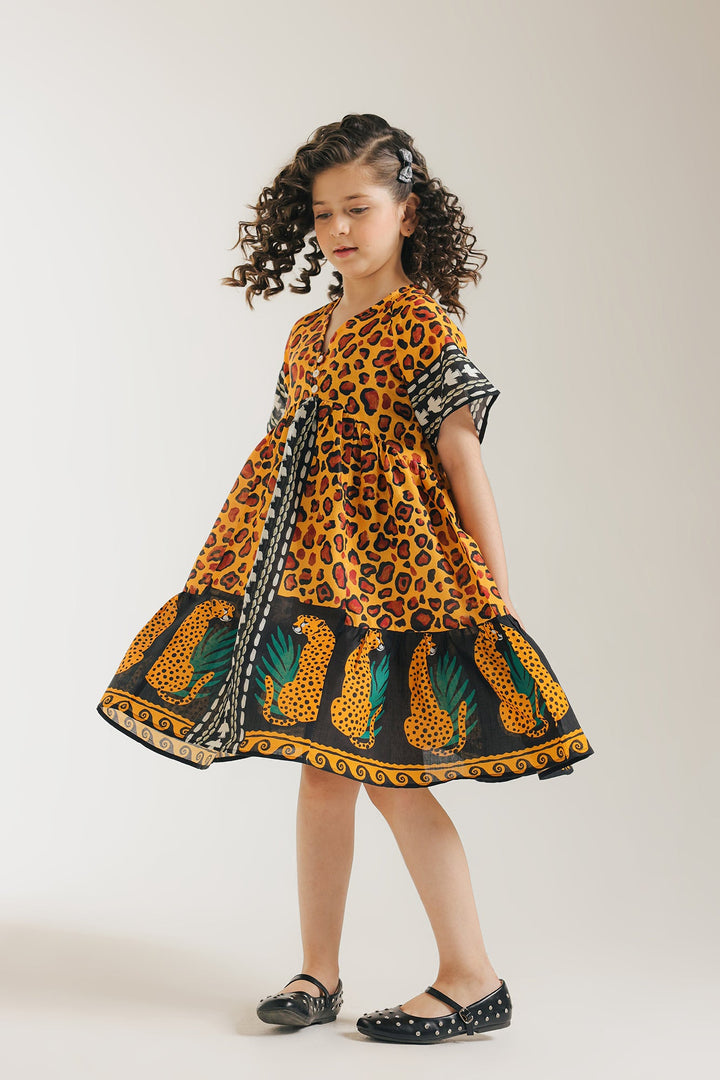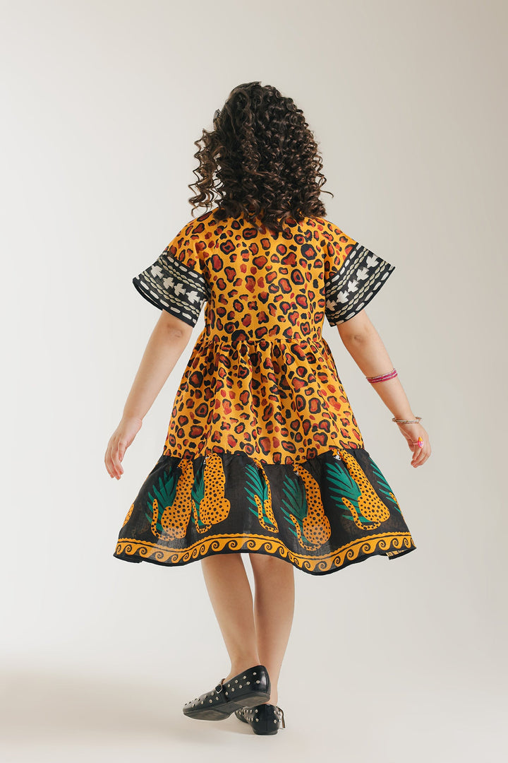 This vibrant and eye-catching dress features a playful leopard print on the bodice transitioning into a skirt with a bold jungle scene, showcasing stylized cheetahs and geometric patterns. The short sleeves and flared silhouette make it perfect for twirling and exploring.