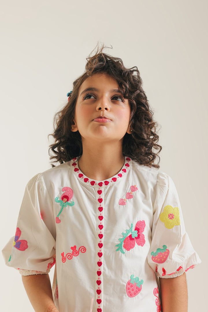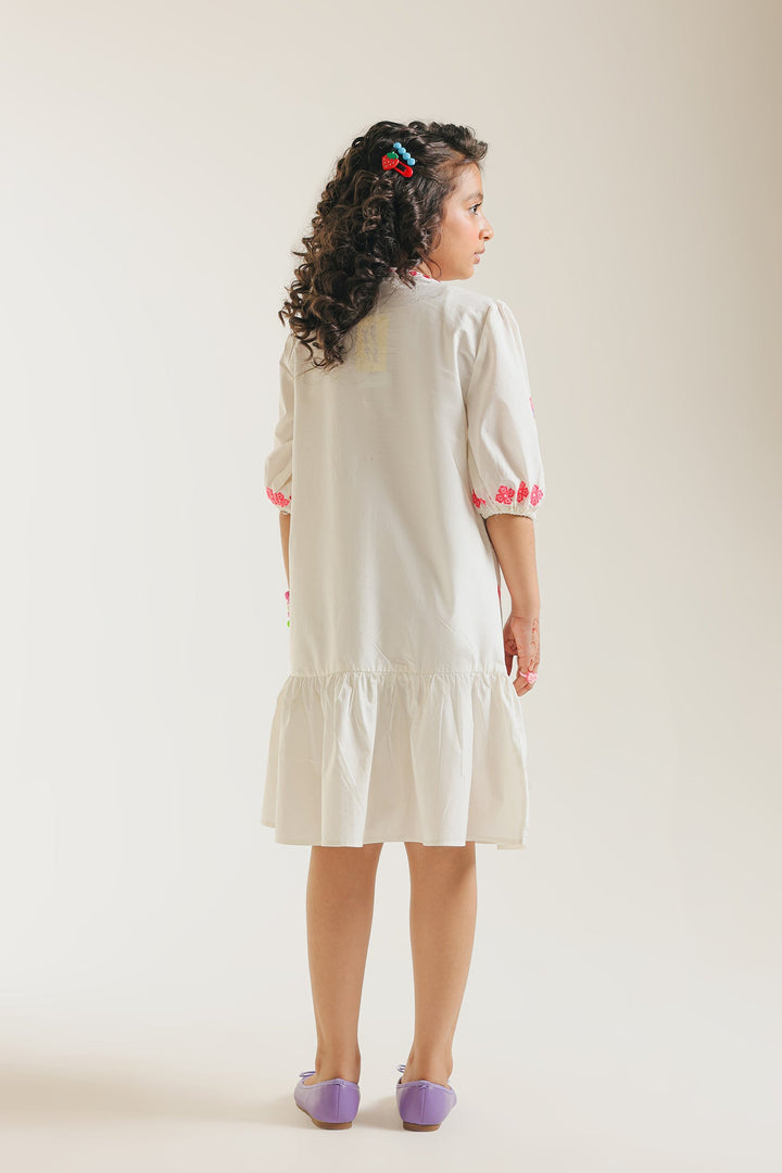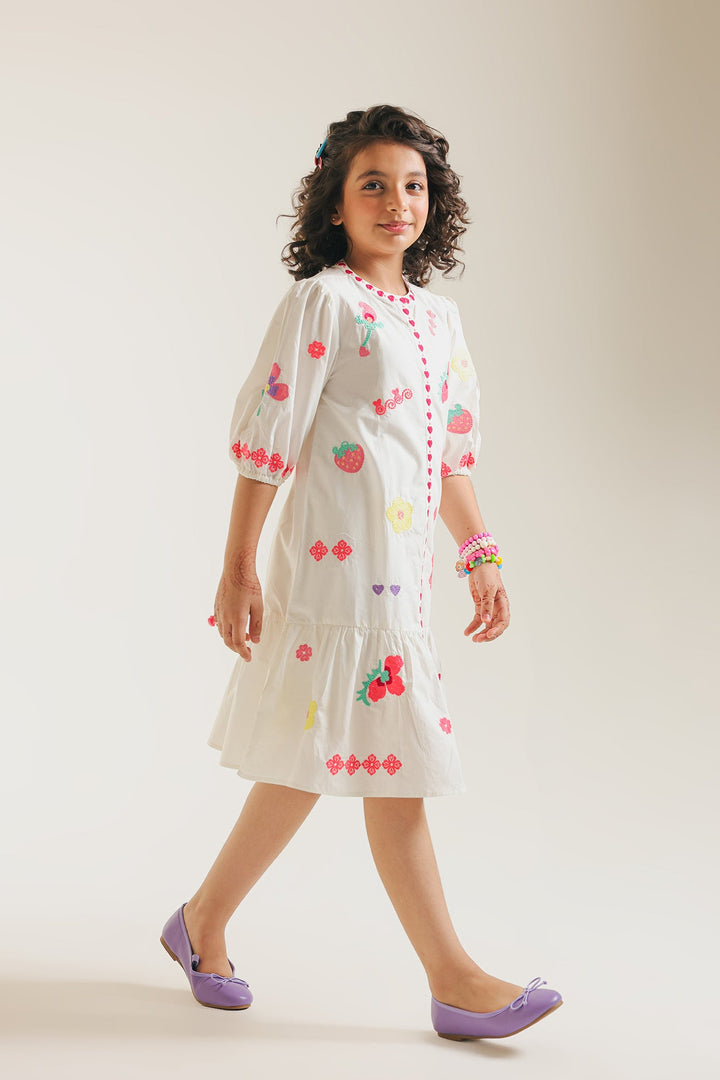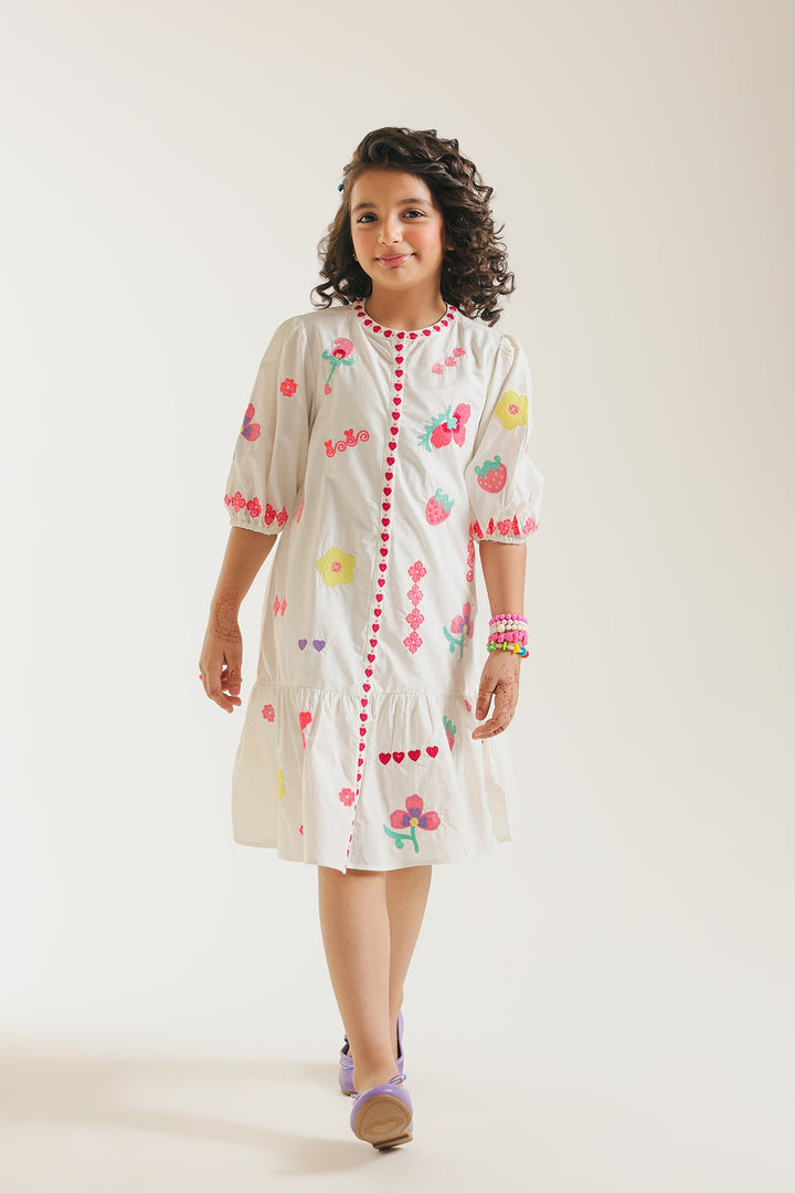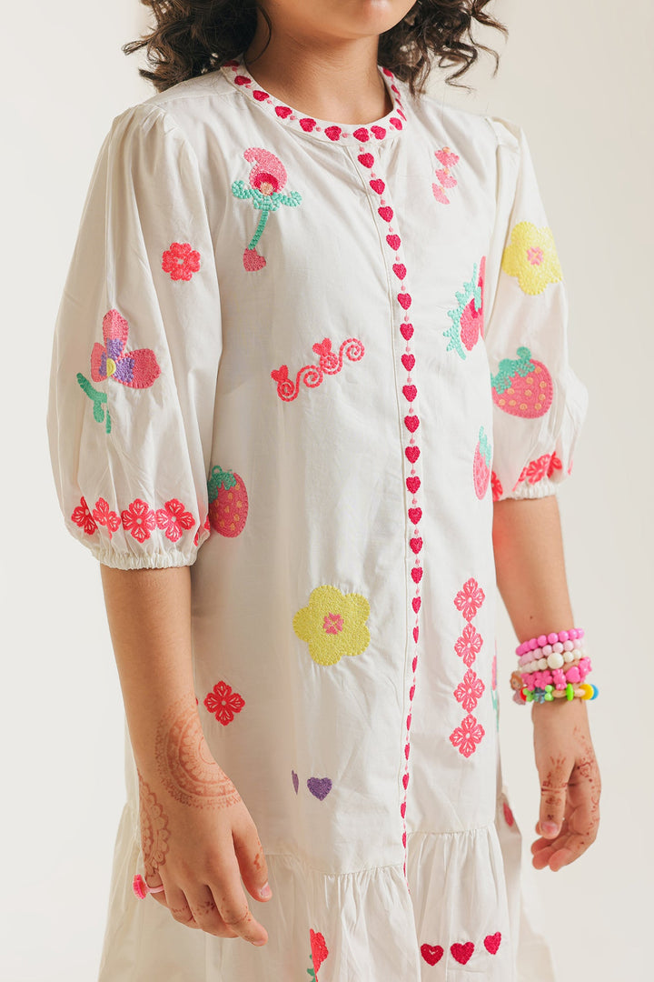Bring a burst of joy to her wardrobe with this playful white embroidered dress. The crisp white cotton dress features an adorable array of vibrant embroidery in pink, green, and yellow, showcasing delightful motifs like strawberries, flowers, and cheerful hearts. A decorative central seam, highlighted with charming pink heart-shaped embroidery runs down the front. This sweet detail is complemented by playful pink ruffle accents along the side seams and the tiered hem. The comfortable three-quarter puffed sleeves finish this whimsical and stylish design. Perfect for sunny days, parties, or simply adding a touch of cheerful charm to her everyday adventures.