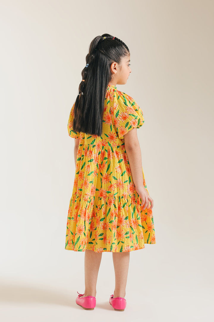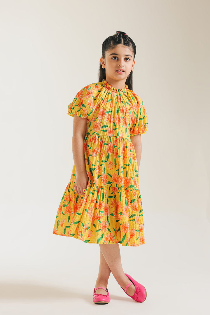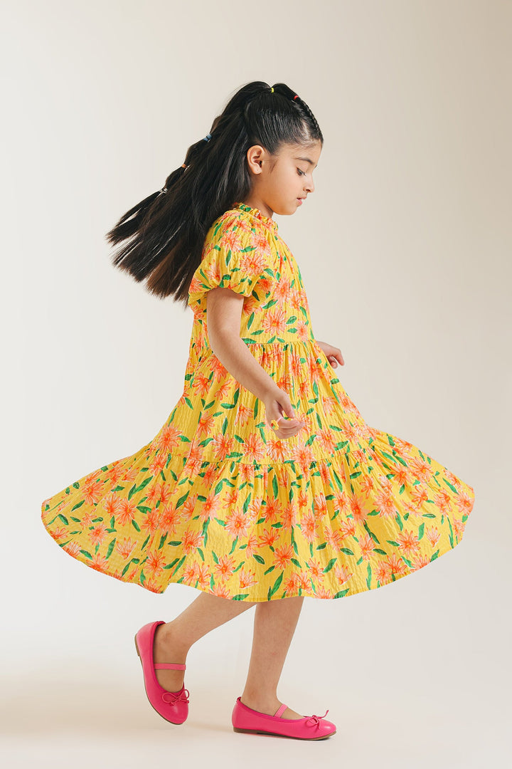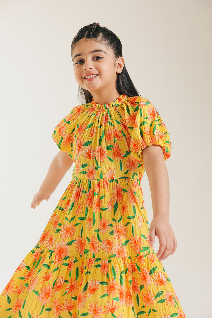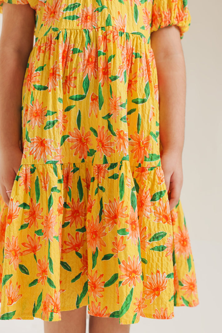 Bring a burst of joyful energy to her wardrobe with this enchanting yellow dress, a true celebration of summer's warmth! Adorned with a vibrant floral print featuring striking orange blossoms and green foliage, this dress is designed to capture attention. The comfortable smocked bodice and tiered skirt create a charming, flowy silhouette, ensuring she stays cool and happy. Perfect for playful days, garden parties, or adding a cheerful splash to any occasion.