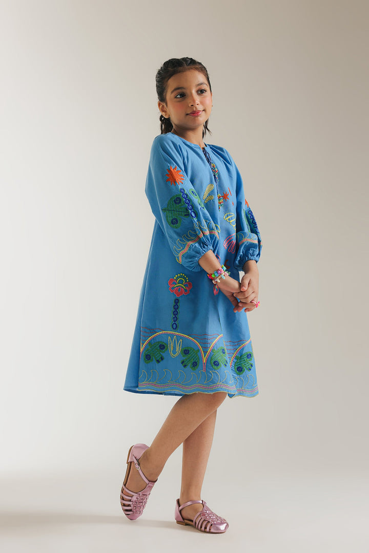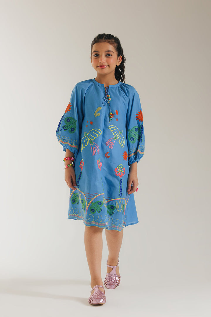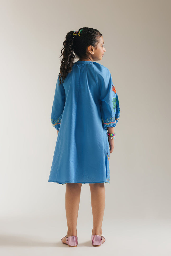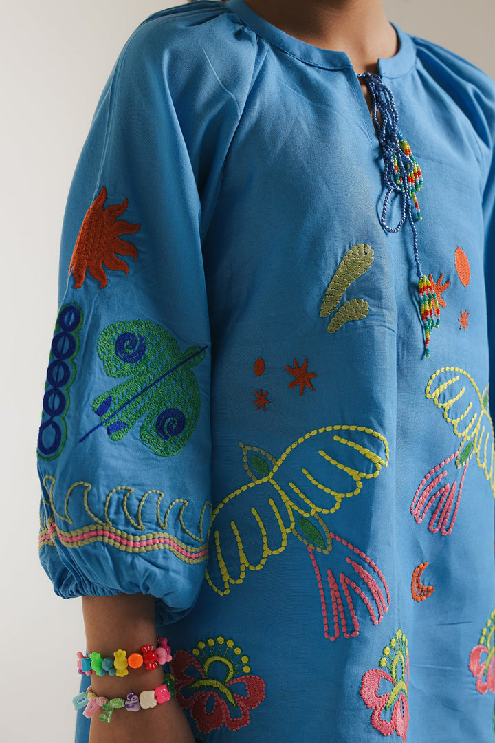 This charming blue dress is a delightful addition to any wardrobe. The soft blue fabric provides a lovely backdrop for the colorful and eye-catching embroidery that adorns the dress. Featuring a comfortable silhouette and playful details, this dress is perfect for adding whimsical touch to any occasion. The dress features a round neckline and short sleeves.