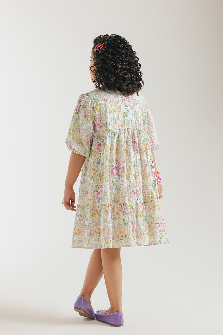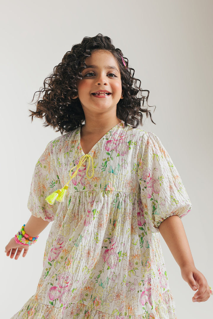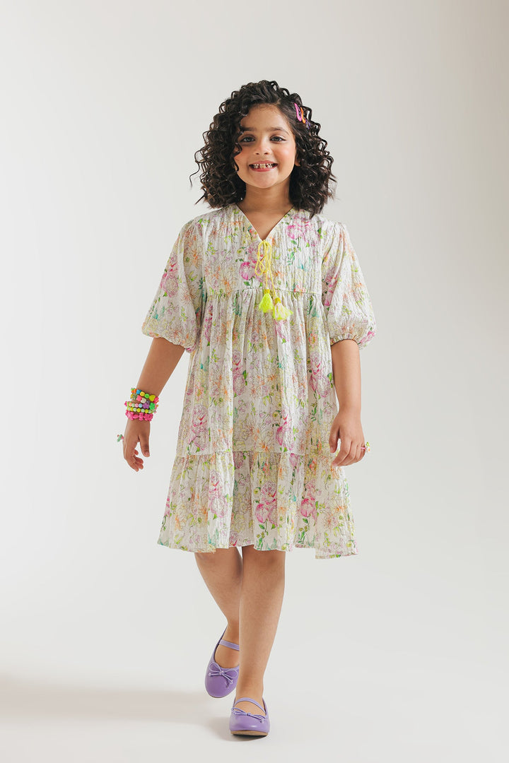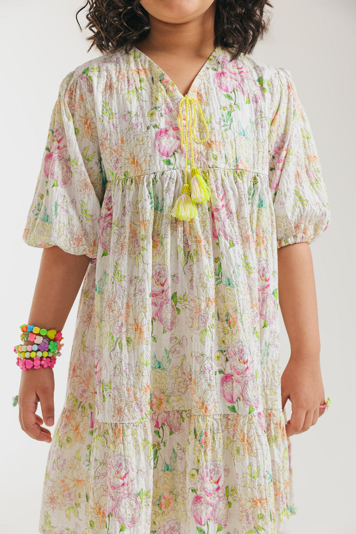 Let your little one twirl in delightful charm with this white tiered dress, adorned with a delicate and colorful floral print! This short-sleeved dress features a charming V-neckline with playful yellow tassels, adding a touch of whimsy. The fabric is graced with an all-over pattern of soft pink, green, and yellow blossoms, creating a fresh and lovely look. Its comfortable tiered design allows for freedom of movement, perfect for sunny days and playful adventures. This dress is ideal for casual outings, family gatherings, or adding a distinctive and cheerful flair to your child's wardrobe.