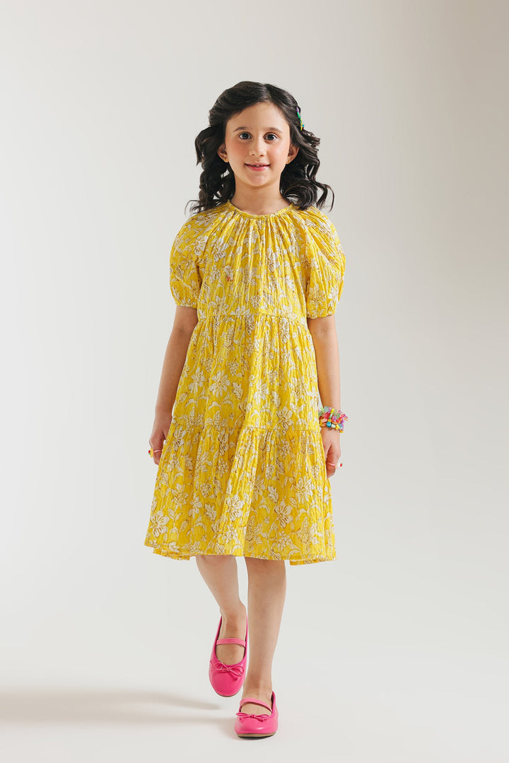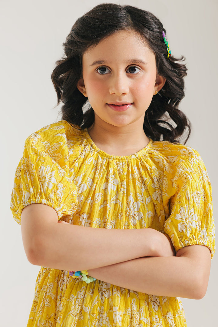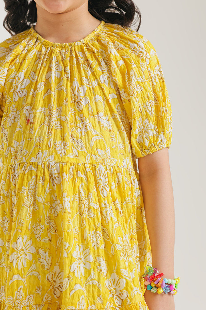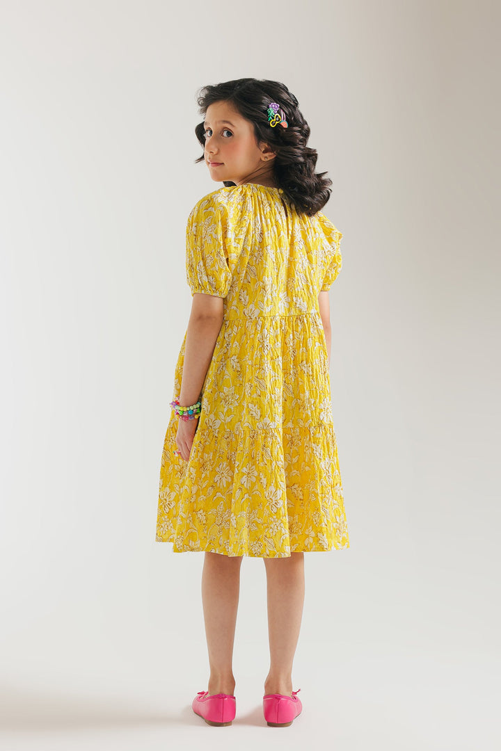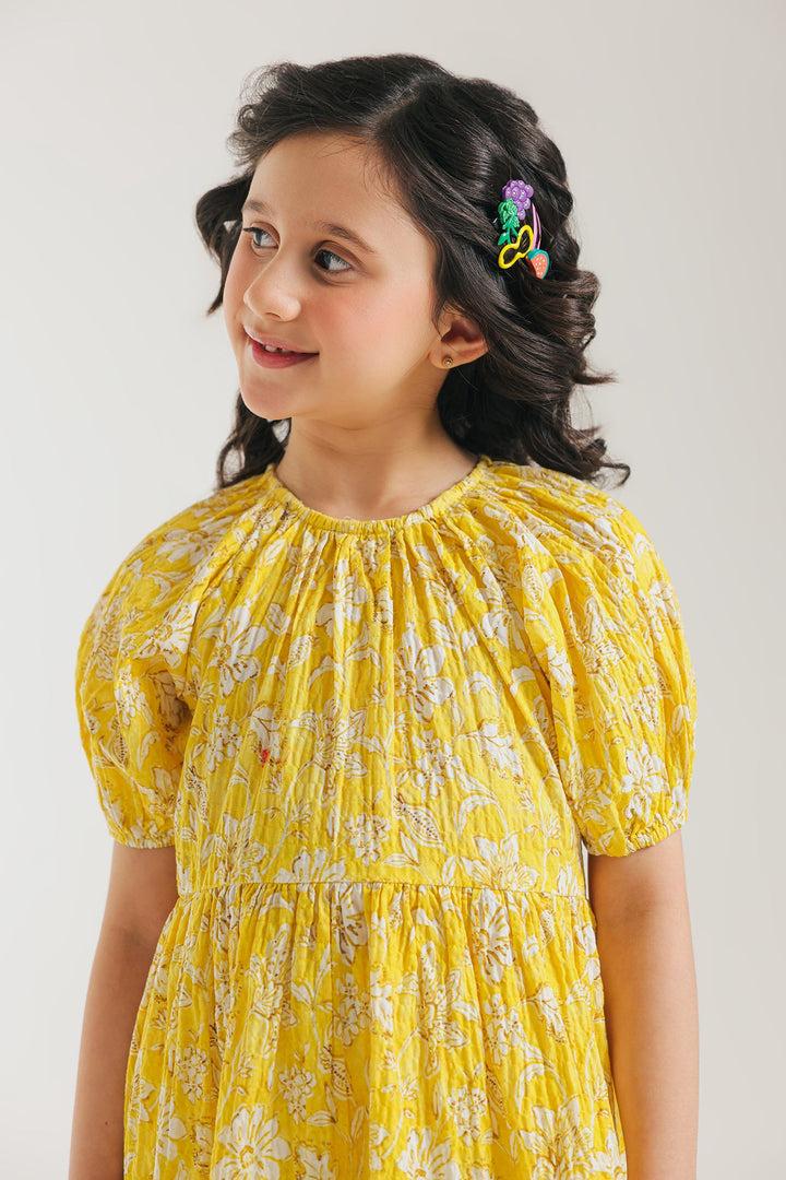 Brighten your little one's day with this charming yellow dress, a sunny embrace of playful floral patterns! This delightful dress features a sweet rounded neckline with gentle gathers, leading to voluminous puffed sleeves that end in comfortable elasticated cuffs. The vibrant yellow fabric is adorned with a delicate white floral print, creating a fresh and cheerful aesthetic. Its relaxed fit and tiered skirt ensure comfortable movement and adorable twirls. This dress is perfect for playdates, casual outings, or adding a distinctive and joyful flair to your child's wardrobe.