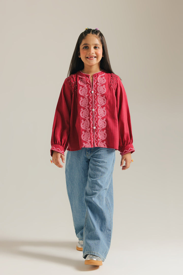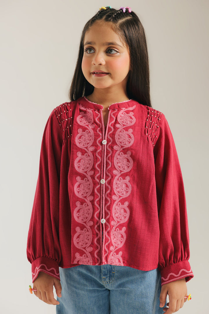 Embrace vibrant, folk-inspired style with this striking deep pink embroidered top. This charming, short-length top is rendered in a beautiful raspberry pink fabric. The central feature is the exquisite tone-on-tone embroidery in a lighter pink, showcasing bold, stylized floral and geometric patterns running down the front. The design includes a gentle round neck with gathering and full, voluminous sleeves that gather at the shoulder and wrist. Finished with a button-front placket, this blouse is perfect for pairing with jeans or trousers for a cozy yet fashionable statement.
