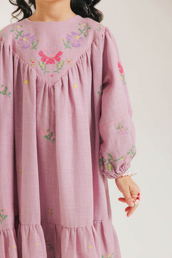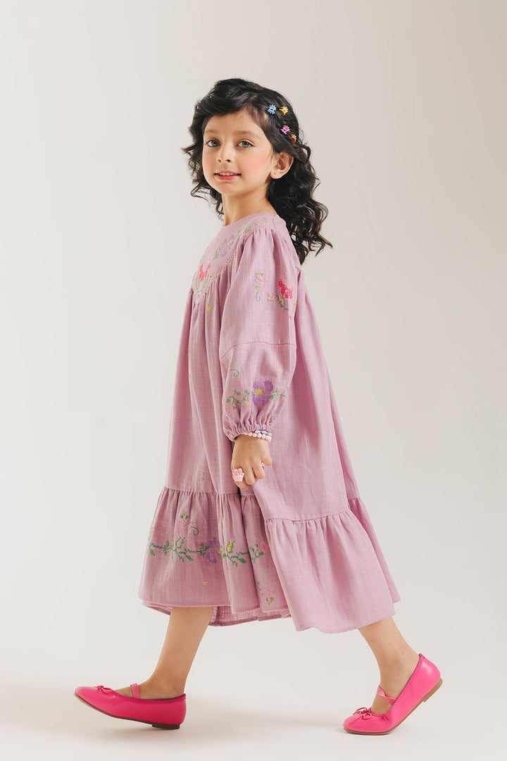 Bring whimsical charm to her closet with this gorgeous pink embroidered dress. This long-sleeved, midi-length dress is crafted from a soft, flowing mauve/dusty rose fabric. It features beautiful embroidered floral motifs in shades of green, yellow, and purple, concentrated around the gathered V-yoke neckline and the tiered ruffle section near the hem. The design includes comfortable, full balloon sleeves cinched at the wrist with a small elastic cuff. This dress embodies a sweet, bohemian-inspired style, perfect for any special occasion or stylish day out.