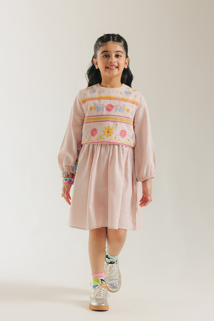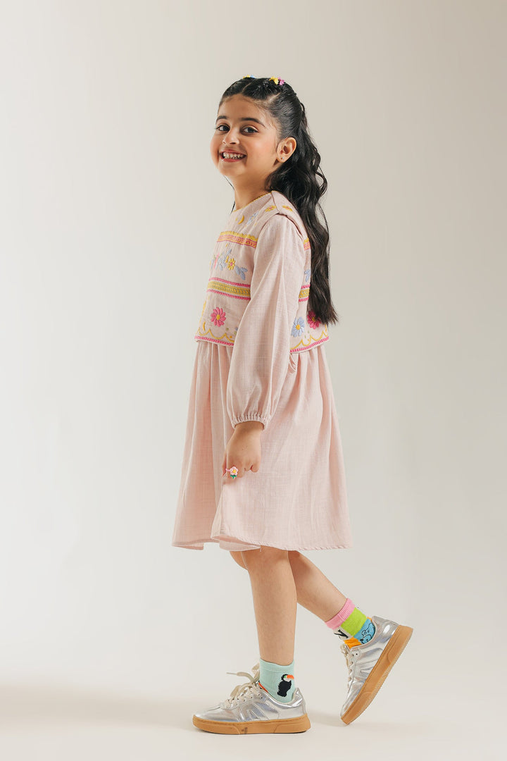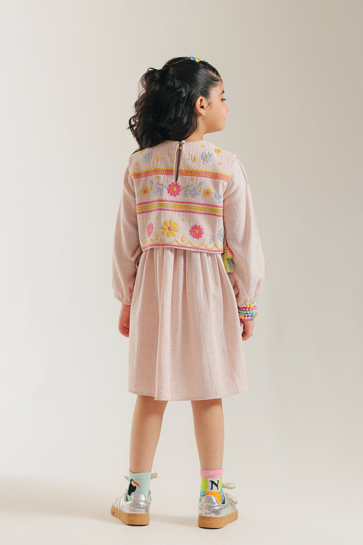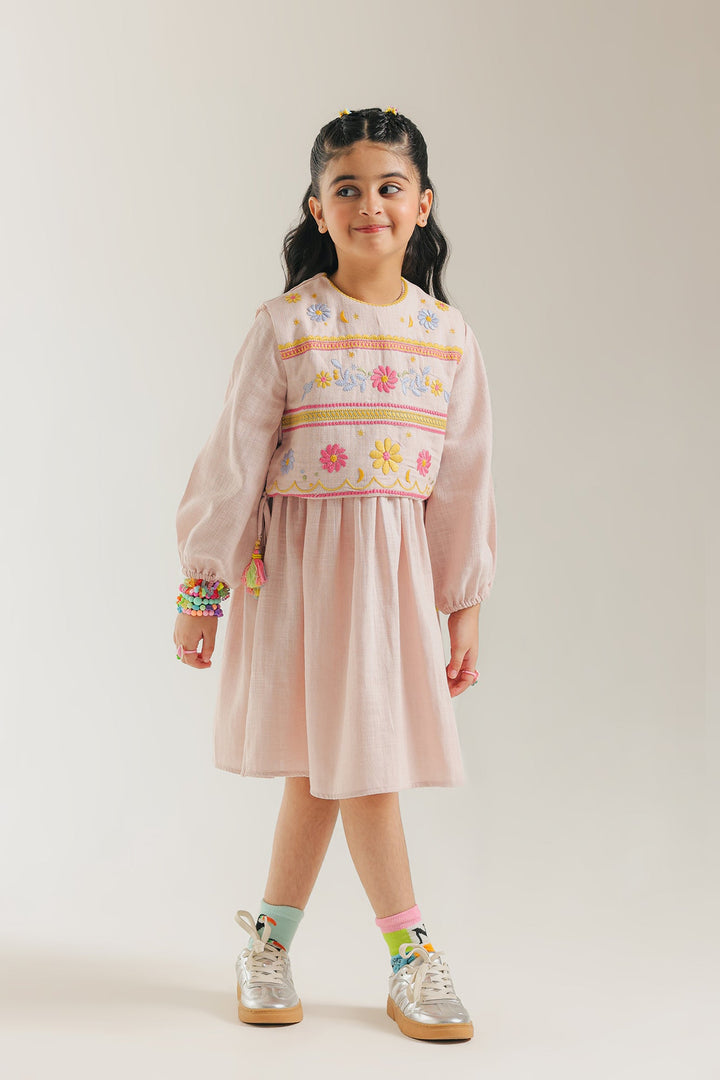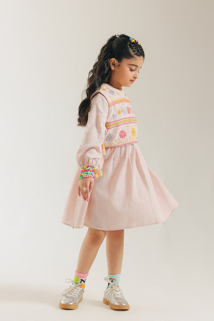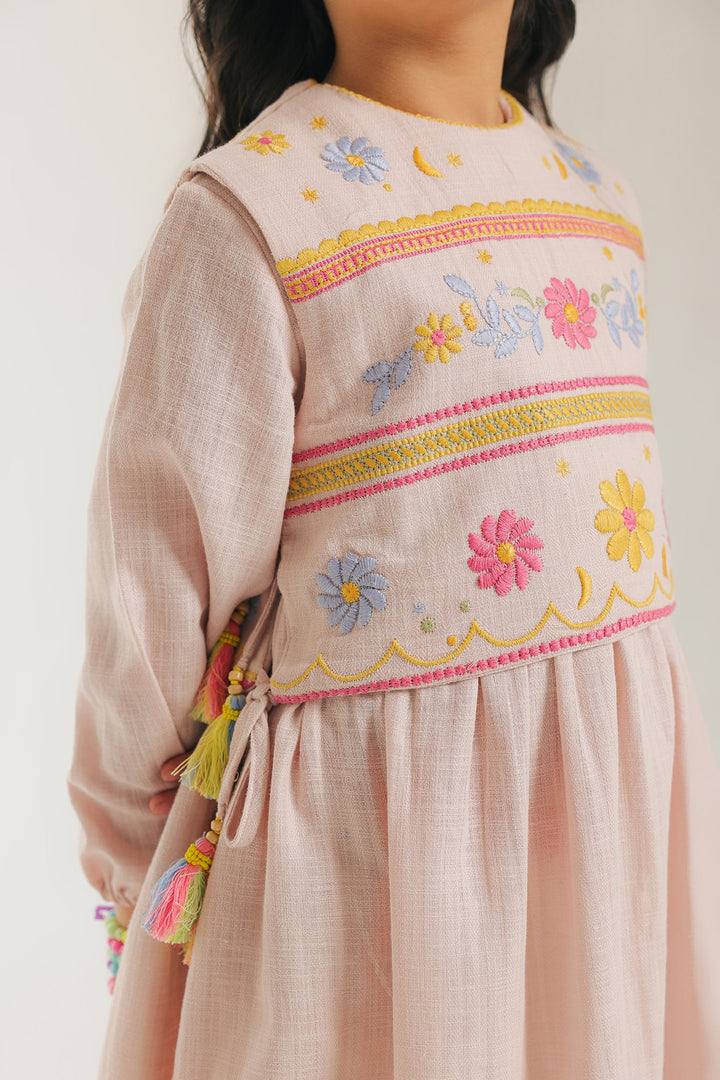 Bring joyful charm to her style with this delightful dress and a waistcoat. The dress is crafted in a soft blush pink with a flowing skirt. The dress is layered underneath a waistcoat adorned with vibrant, folk-inspired embroidery featuring flowers and geometric patterns in cheerful shades of yellow, pink, and blue. Short sleeves and playful tassel ties at the waist complete this look, making it a perfect blend of comfort and eye-catching detail for your little girl's adventures.
