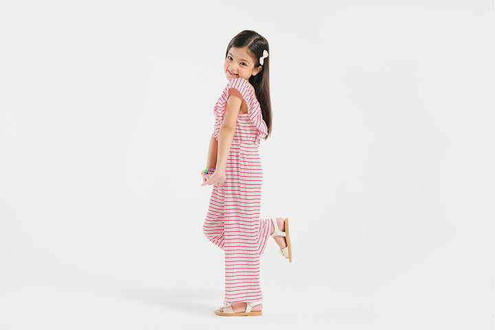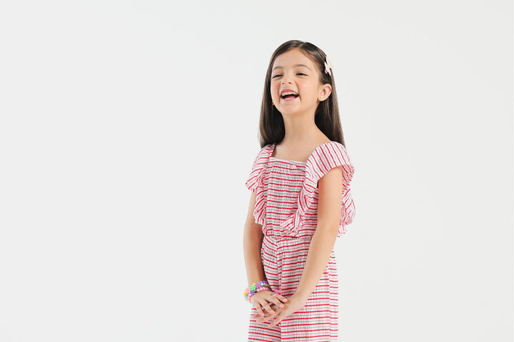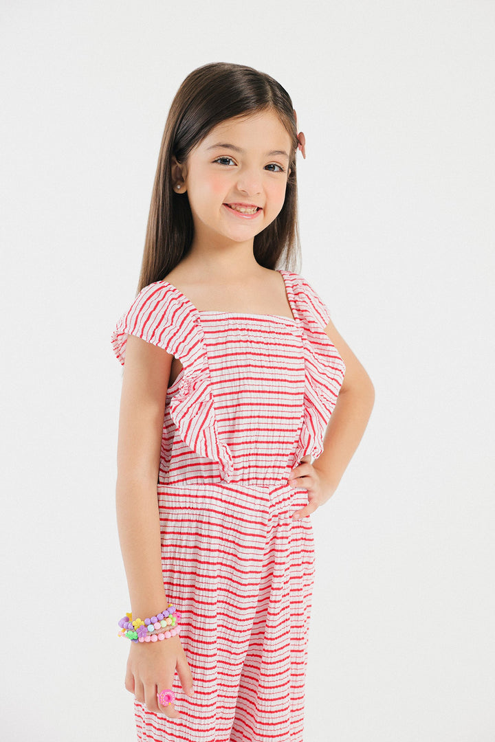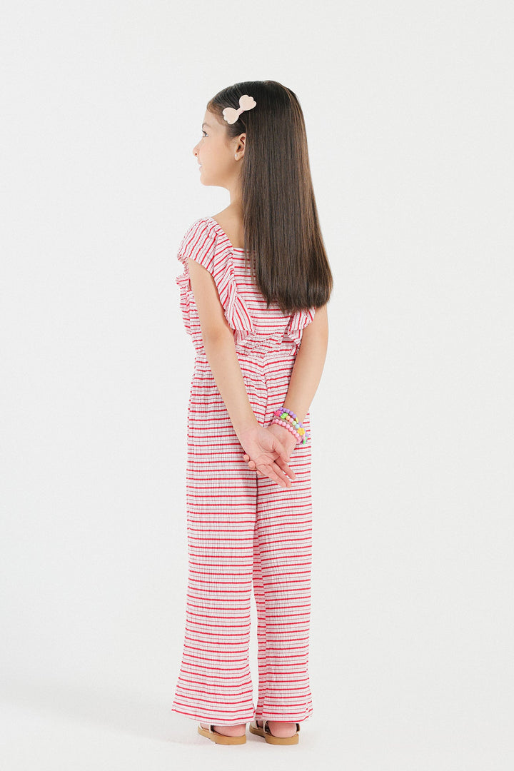 This radiant jumpsuit is perfect for the stylish girl. The elegant and trendy design features an attractive striped canvas adorned with crinkle fabric. Crafted in a contemporary silhouette with frills at shoulders, this trendy jumpsuit is a must have outfit to style this happening season.