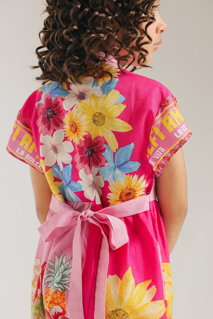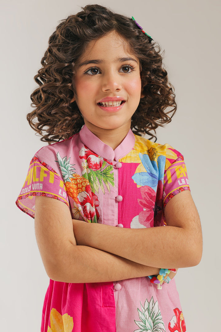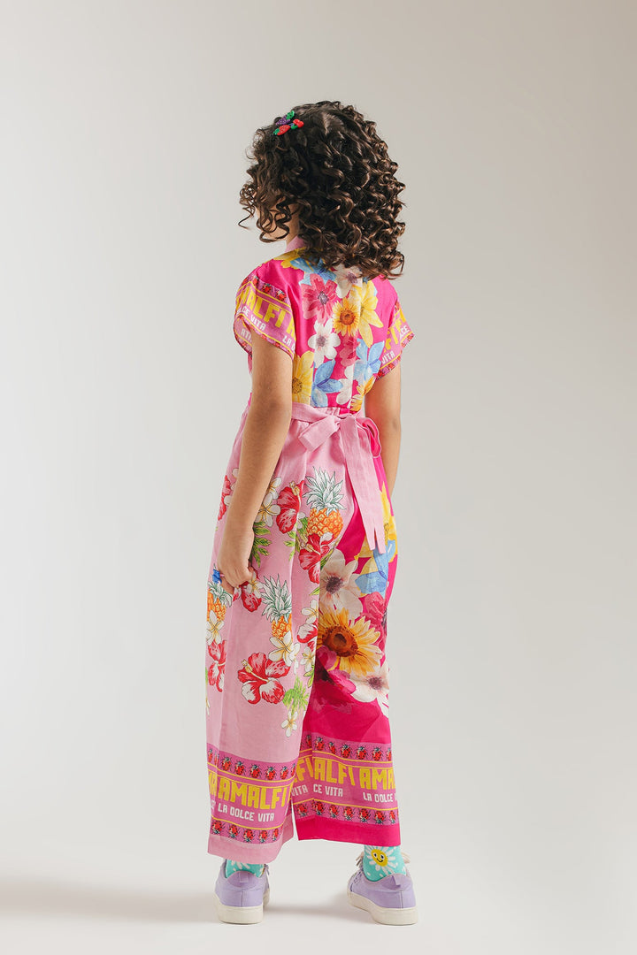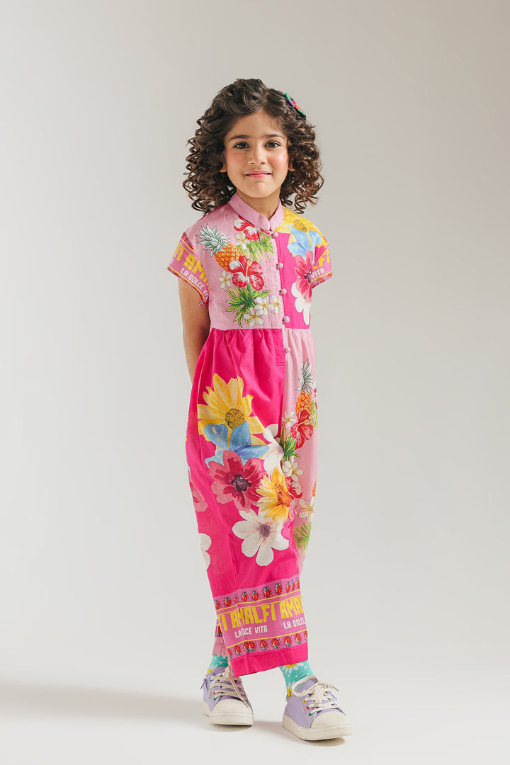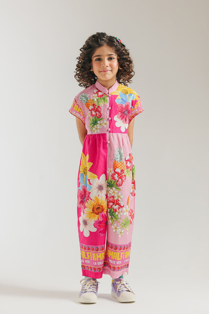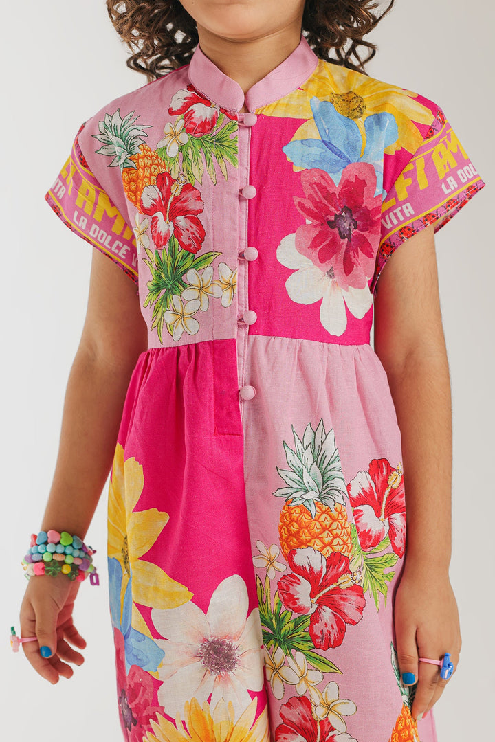 Let your little one shine in this vibrant and playful printed jumpsuit, a burst of color and fun for any occasion! This captivating one-piece features a cheerful fusion of bright pink and an eye-catching tropical floral and fruit print in shades of yellow, blue, orange, and green. The design boasts a ban neckline and a comfortable, relaxed fit that allows for endless adventures. Perfect for summer outings, playdates, or adding a distinctive and joyful flair to your child's style.