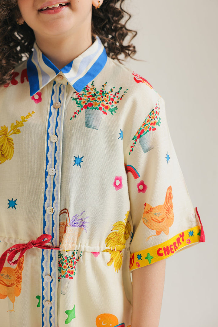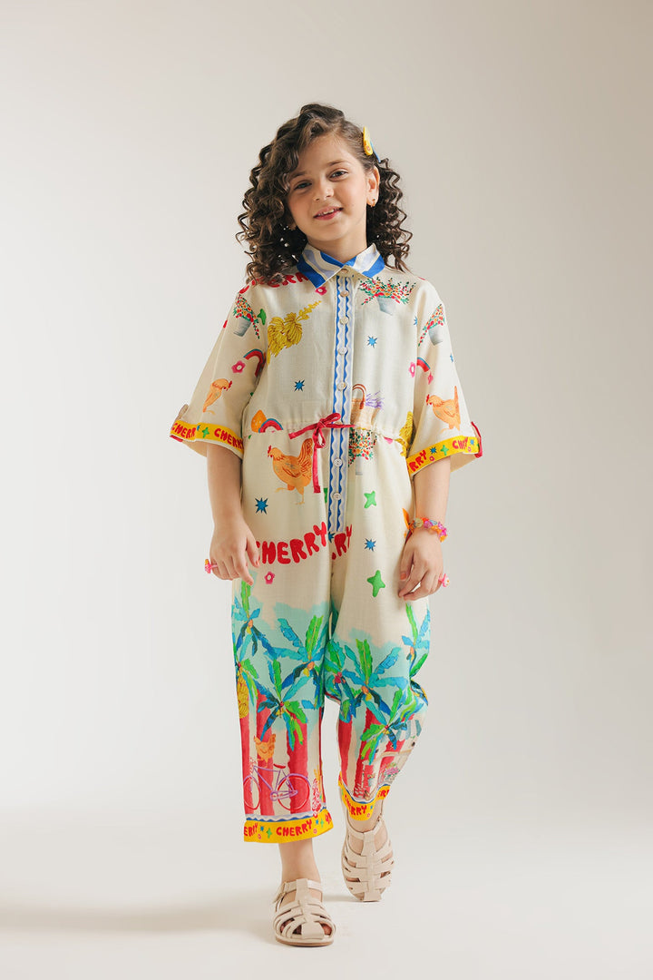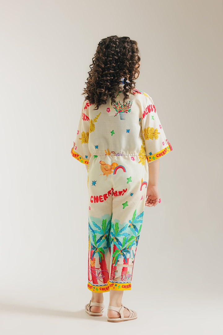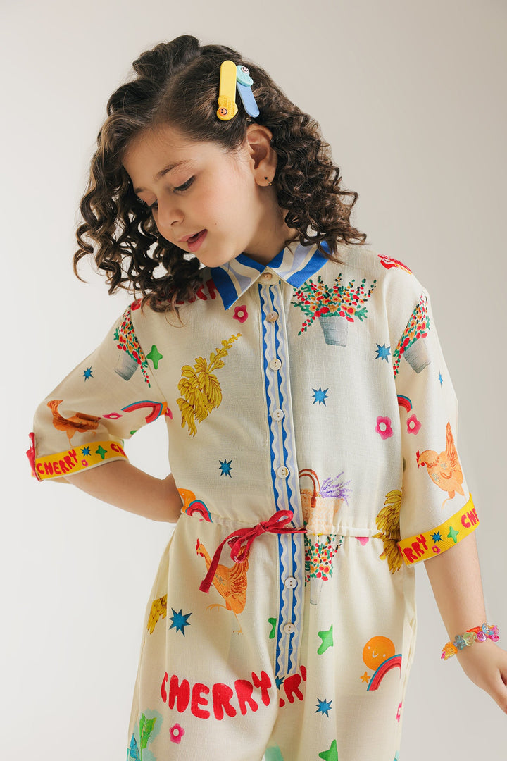 Add a touch of style to your girl's wardrobe with this trendy jumpsuit. The collar neck and drawstrings around the waist provide a playful touch to the sophisticated silhouette. Made with high-quality materials and featuring vibrant abstract illustrations, this jumpsuit offers both fashion and comfort for any occasion.