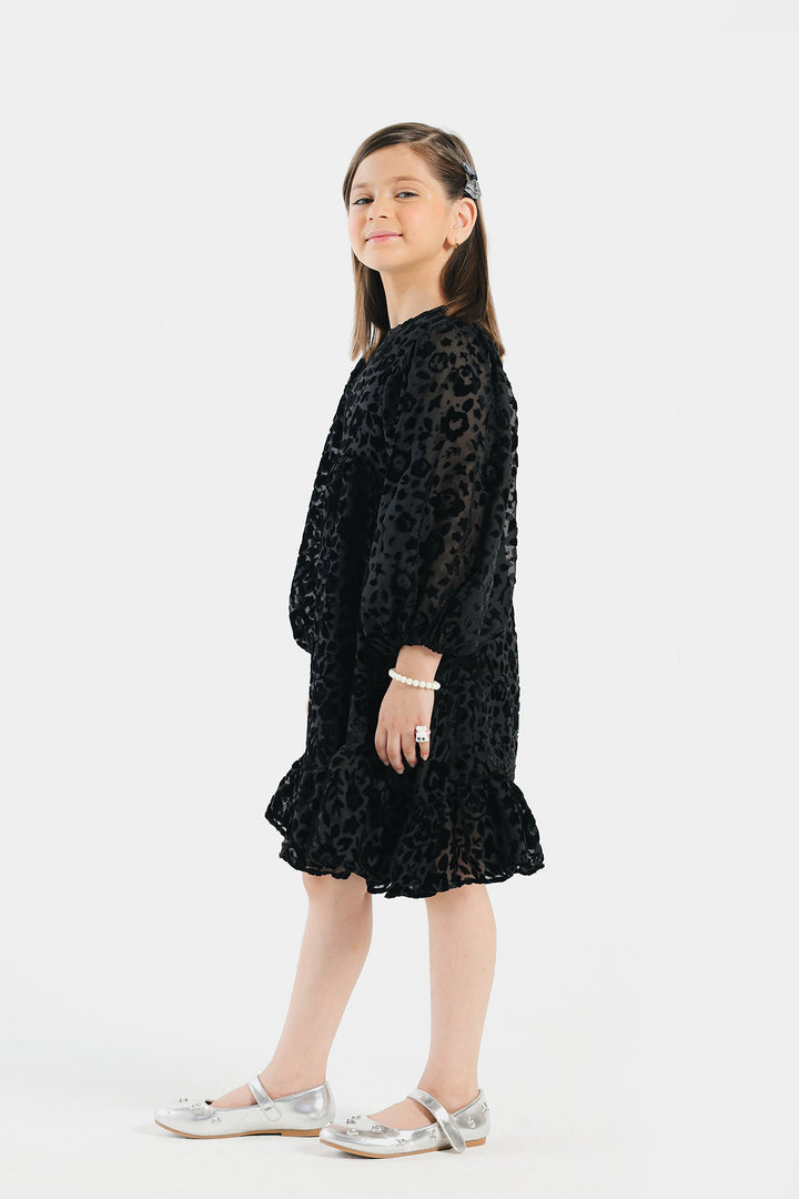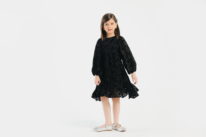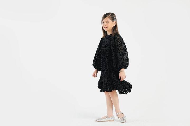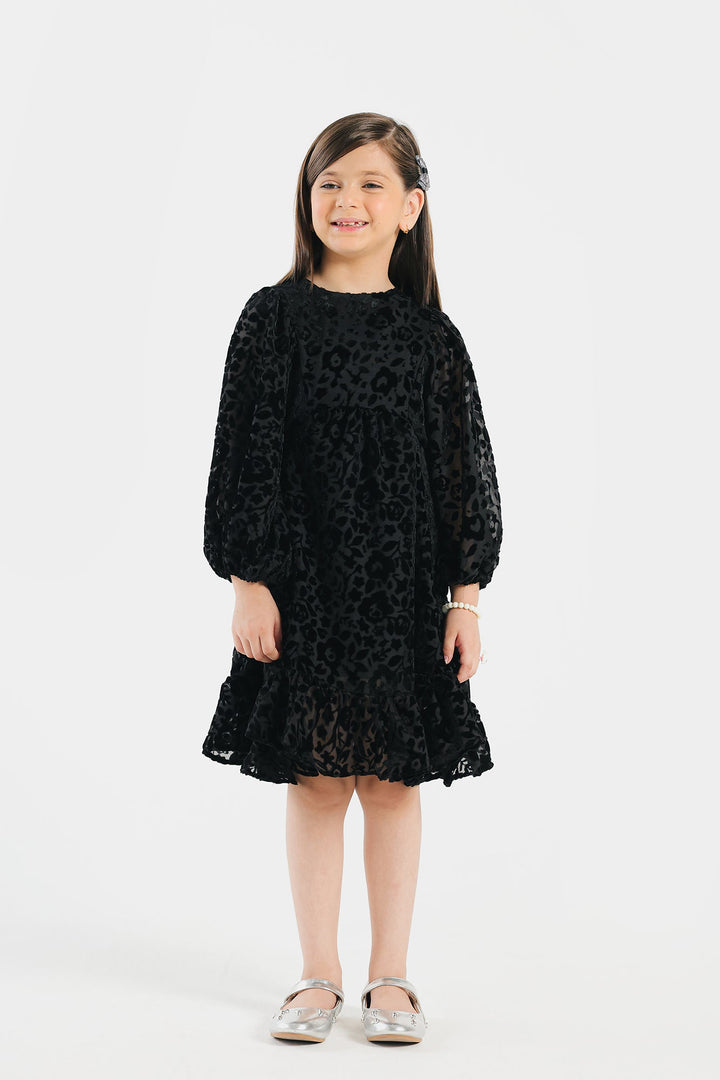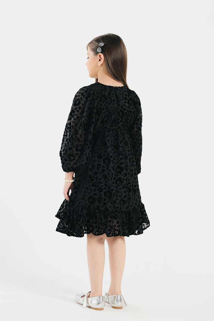 A graceful yet elegant option for fun events, the classy dress is rendered in charming black shade and adorned with beautiful floral designs layered on textured palachi fabric. Crafted in flowing silhouette with gathers below yoke and adorned with elasticated sleeves opening for a contemporary look, this trendy dress comes paired with a sleeveless inner slip and is sure to let your girls look fashionable this season.