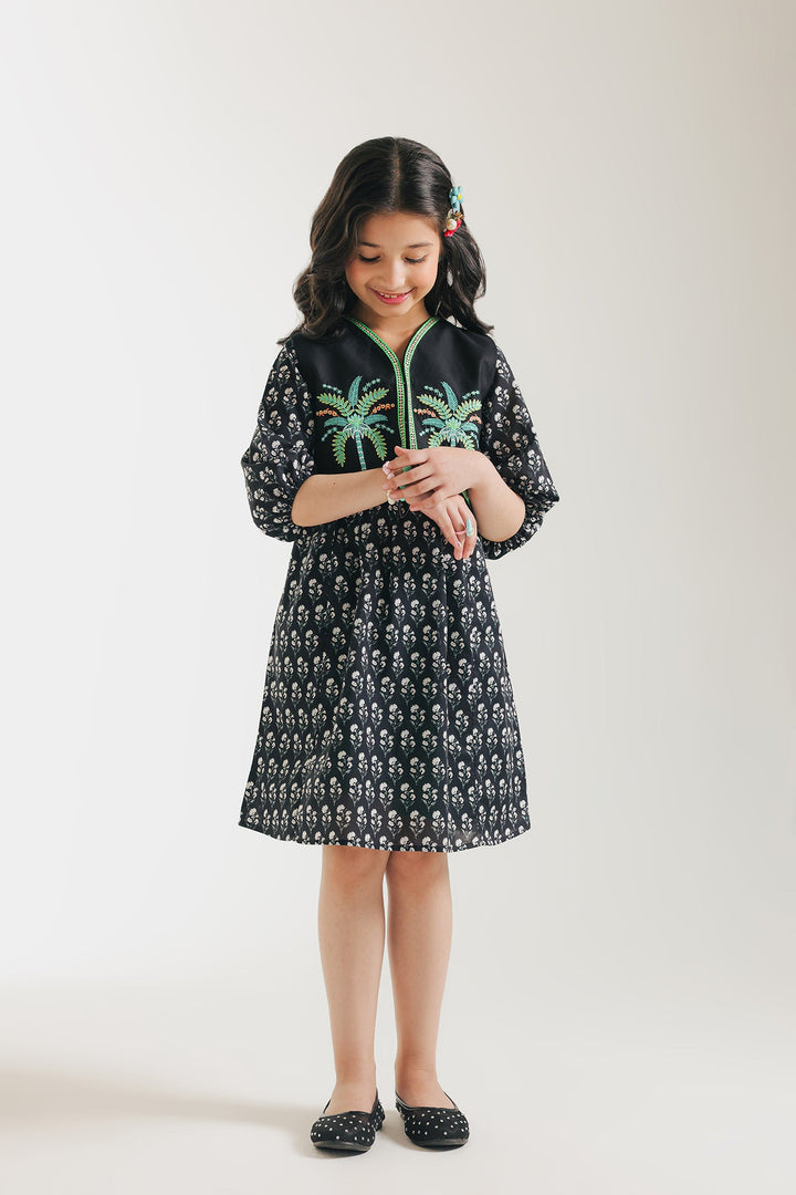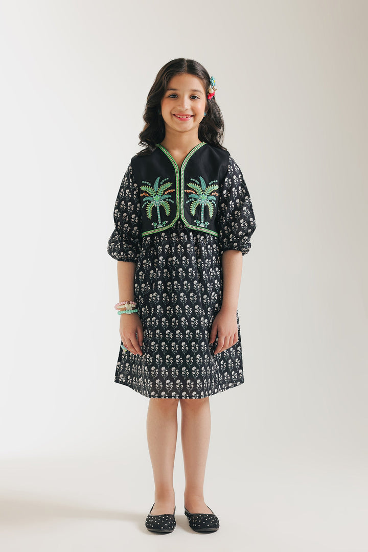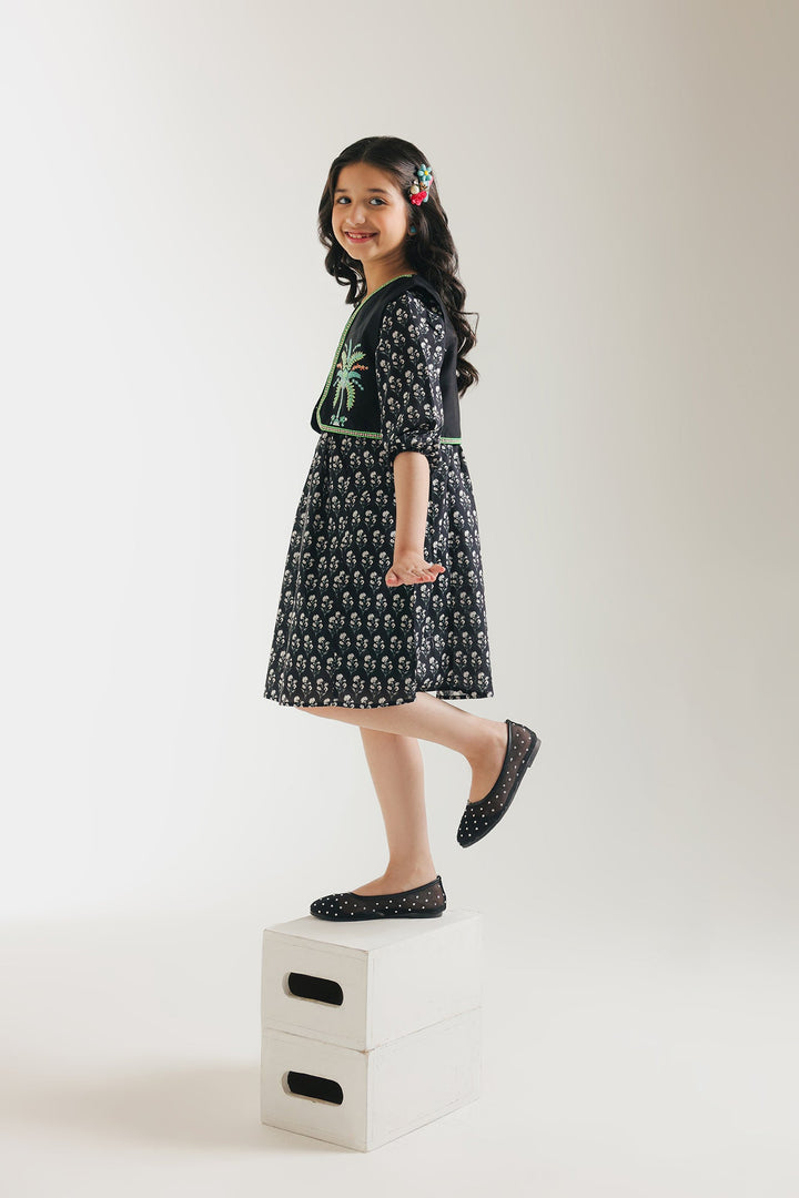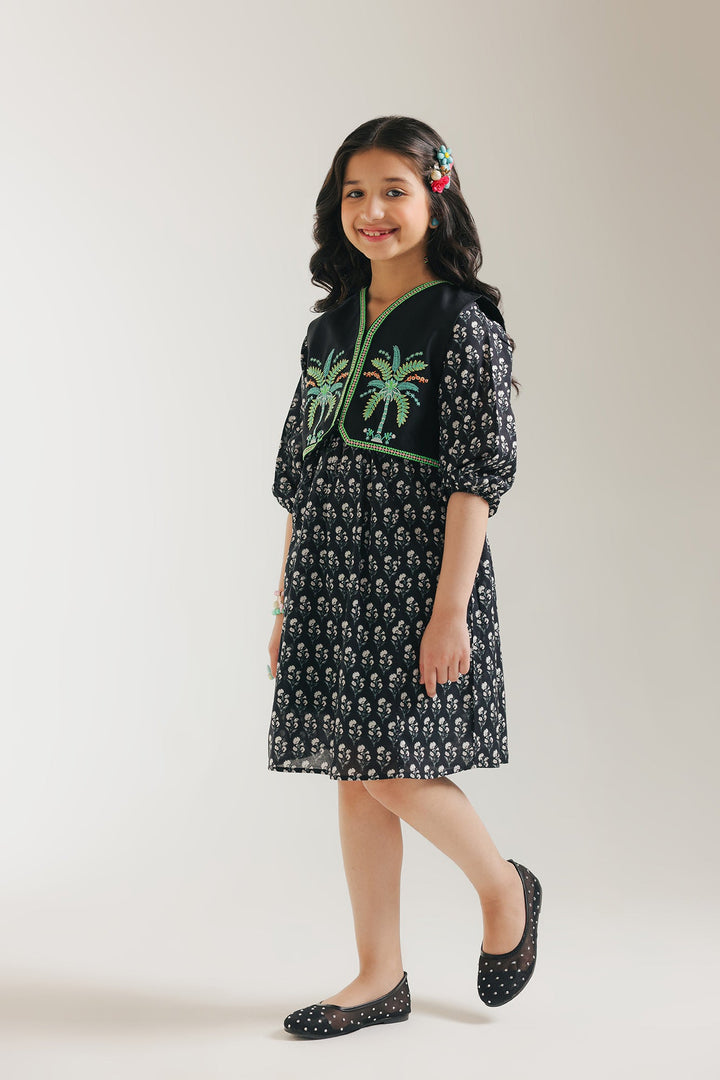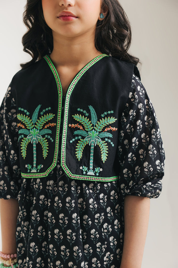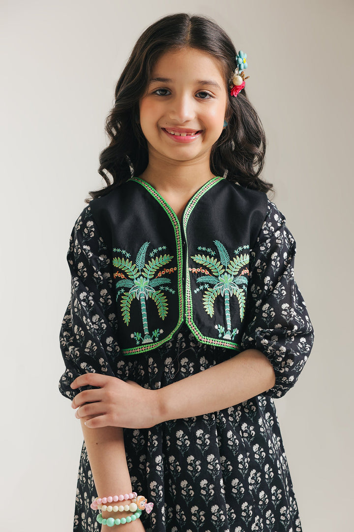 Let her imagination soar in this enchanting two-piece set. The charming dress features a delightful print and sweet flutter sleeves, perfect for twirling and playtime adventures. Layered over it is a beautifully embroidered waistcoat, adding a touch of artisanal flair and a pop of texture.