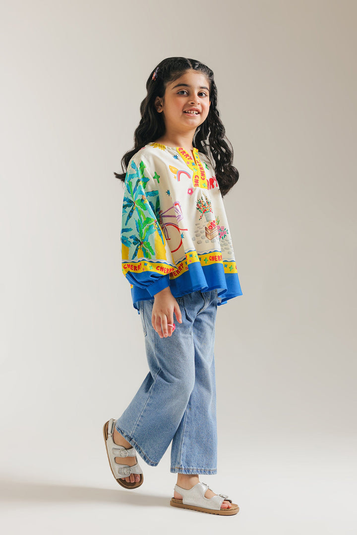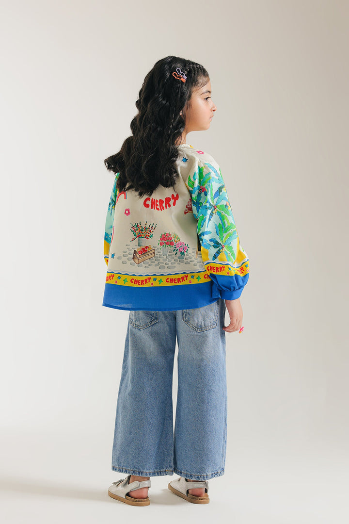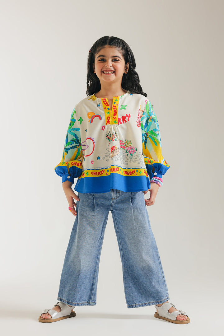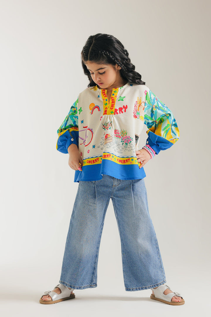 This fun and stylish outfit features a long-sleeved top with a vibrant and playful graphic print, including typography and colorful illustrations. The top has a round neckline and contrasting blue gathered cuffs and hem. Pair it with light wash, wide-leg denim jeans, to complete the look for everyday adventures.