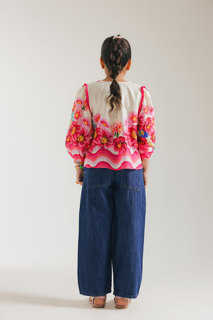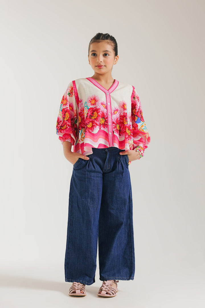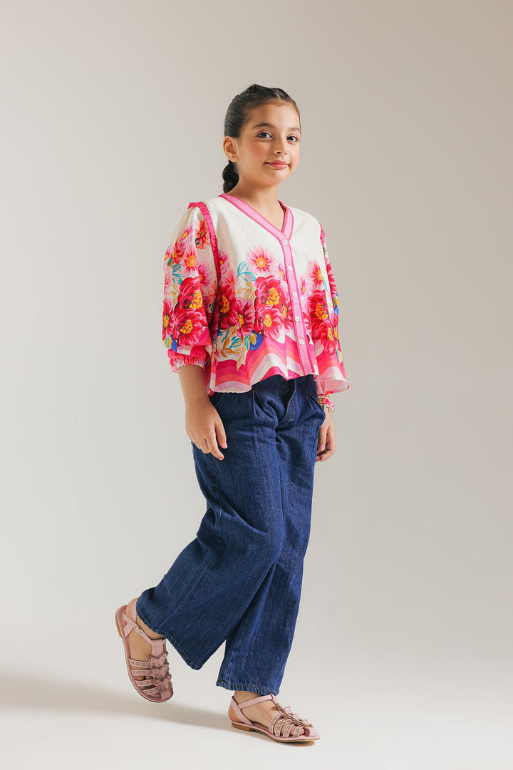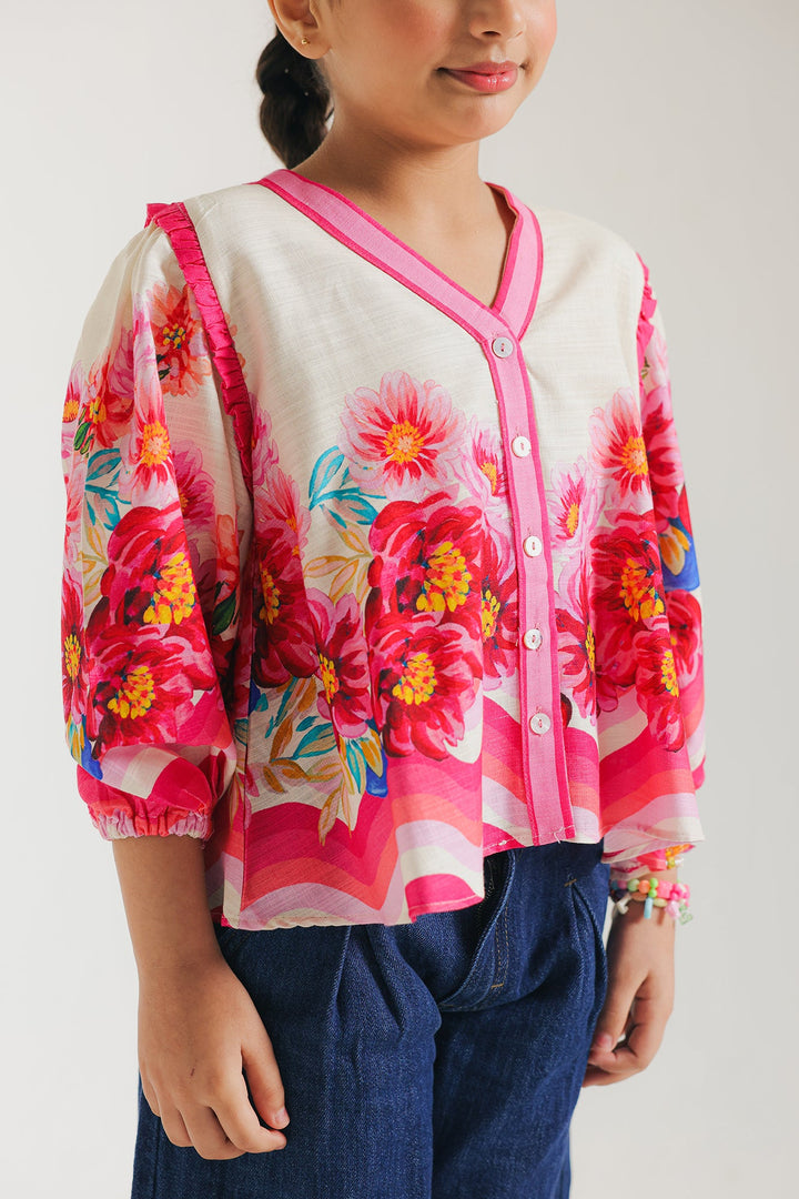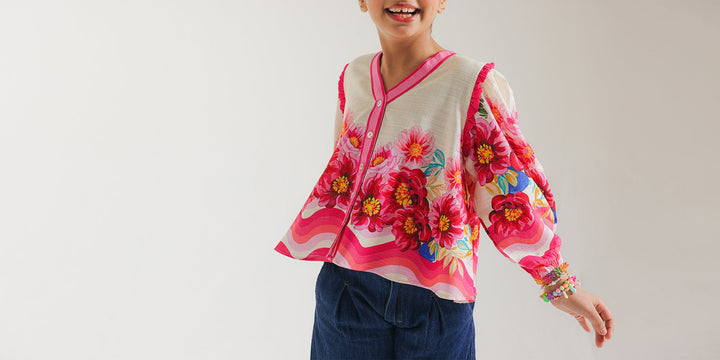 A vibrant, multicolored button down shirt. The shirt features a mix of red, pink, yellow, orange, and blue hues, with floral and curvy stripe patterns throughout. It has a button-down front with decorative buttons, puffed long sleeves with elasticated cuffs, and a loose, comfortable fit, creating a casual yet artistic look.