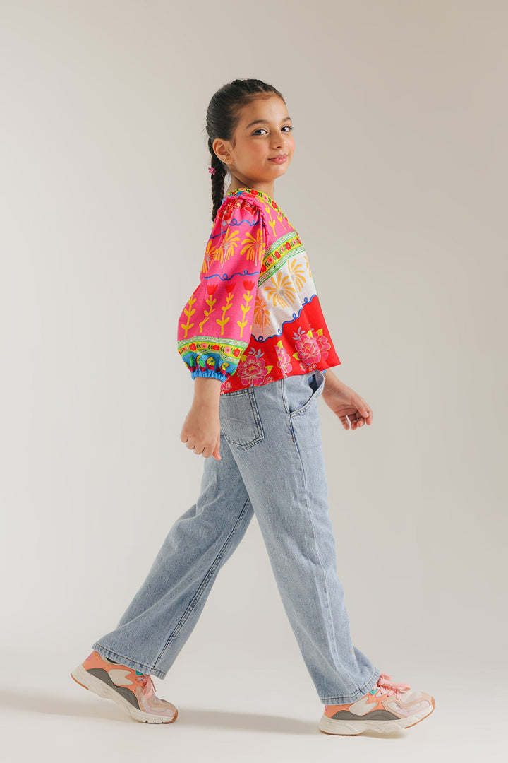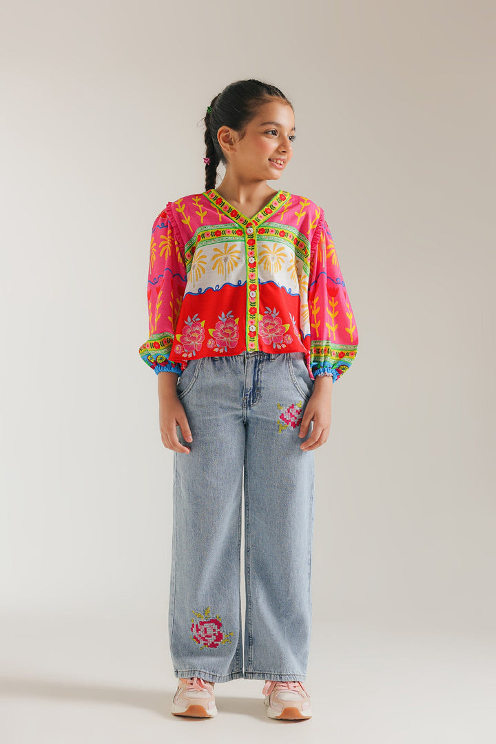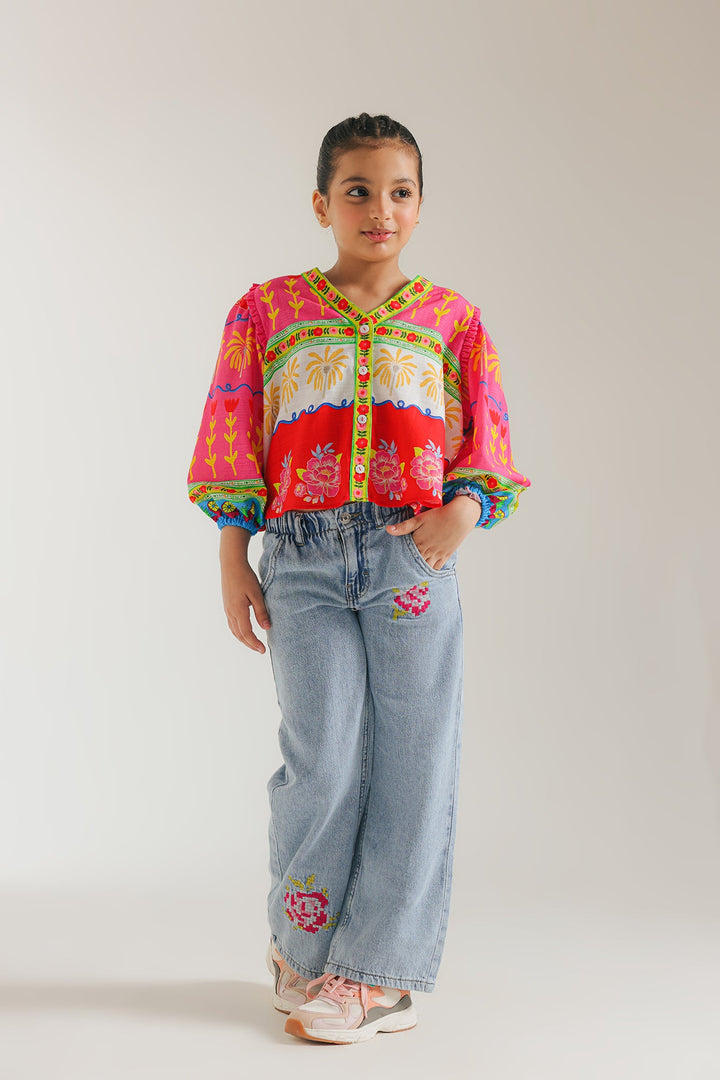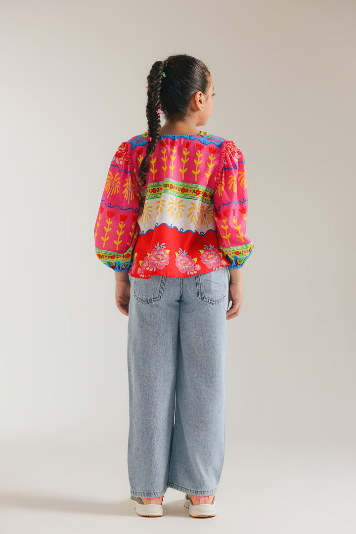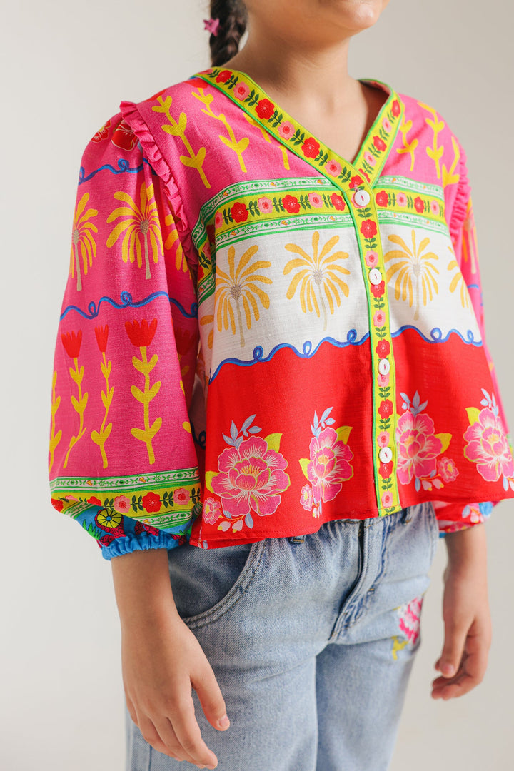 A vibrant, multicolored button down shirt. The shirt features a mix of red, pink, yellow, green, and blue hues, with floral and geometric patterns throughout. It has a button-down front with decorative buttons, puffed long sleeves with elasticated cuffs, and a loose, comfortable fit, creating a casual yet artistic look.