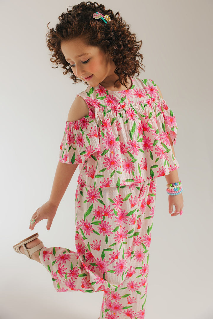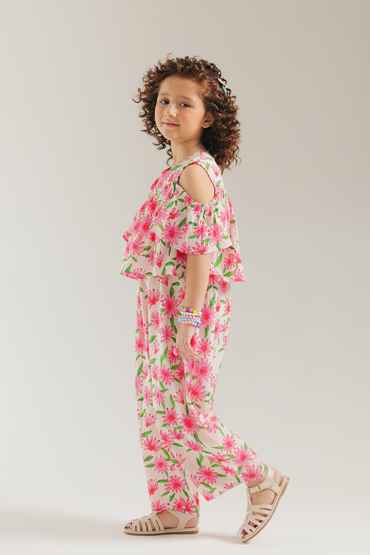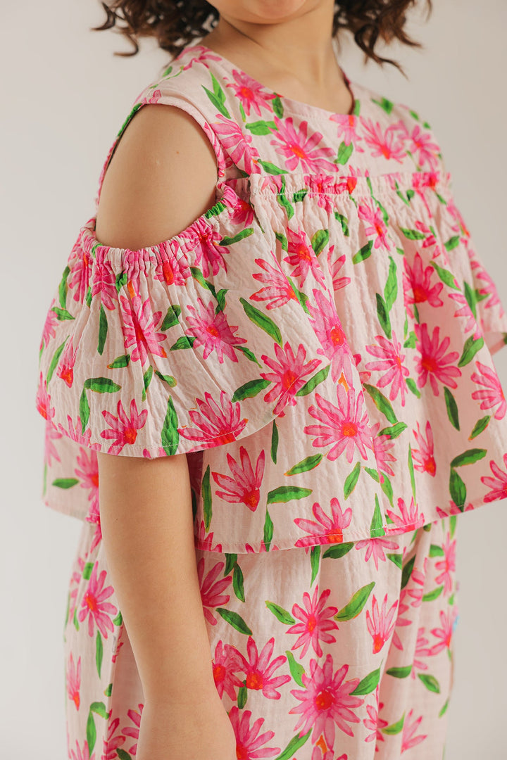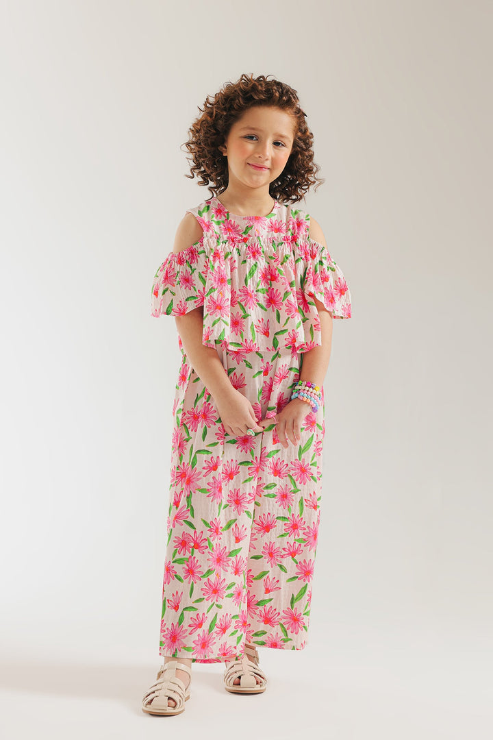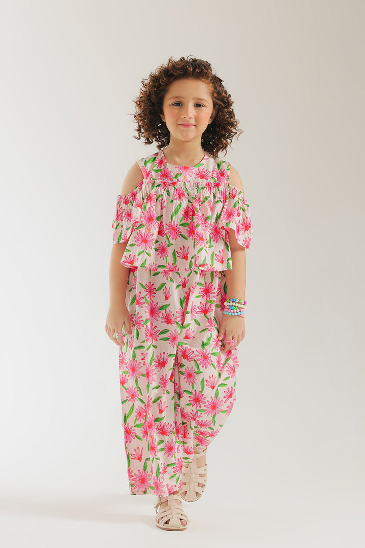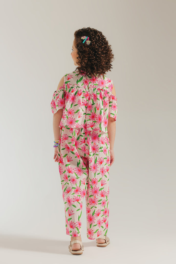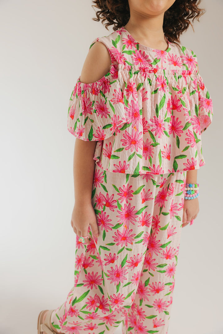 Wrapped in a dream of pink blossoms, this enchanting jumpsuit is a celebration of whimsical style. The soft, flowing fabric is adorned with a delicate all-over floral print in romantic shades of pink and green. Featuring a graceful, gathered yoke with a round neckline and charming cold-shoulder sleeves, it combines a relaxed fit with a touch of playful elegance. The wide, comfortable legs complete this effortlessly chic look, making it the perfect piece for carefree, sunny days.