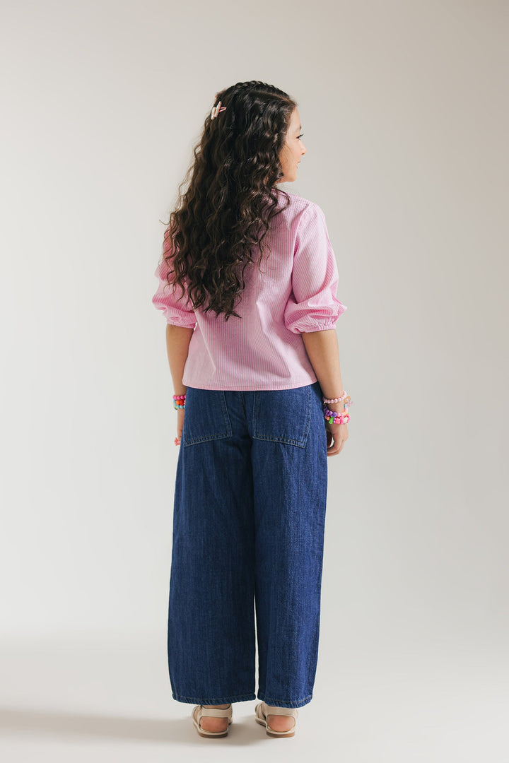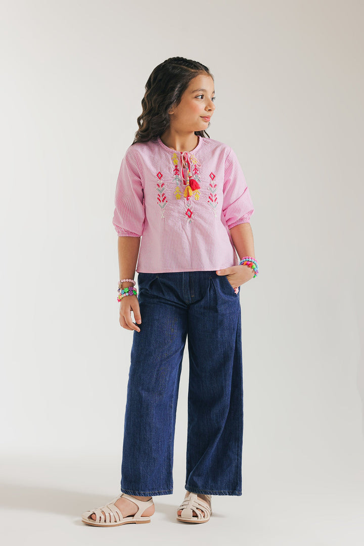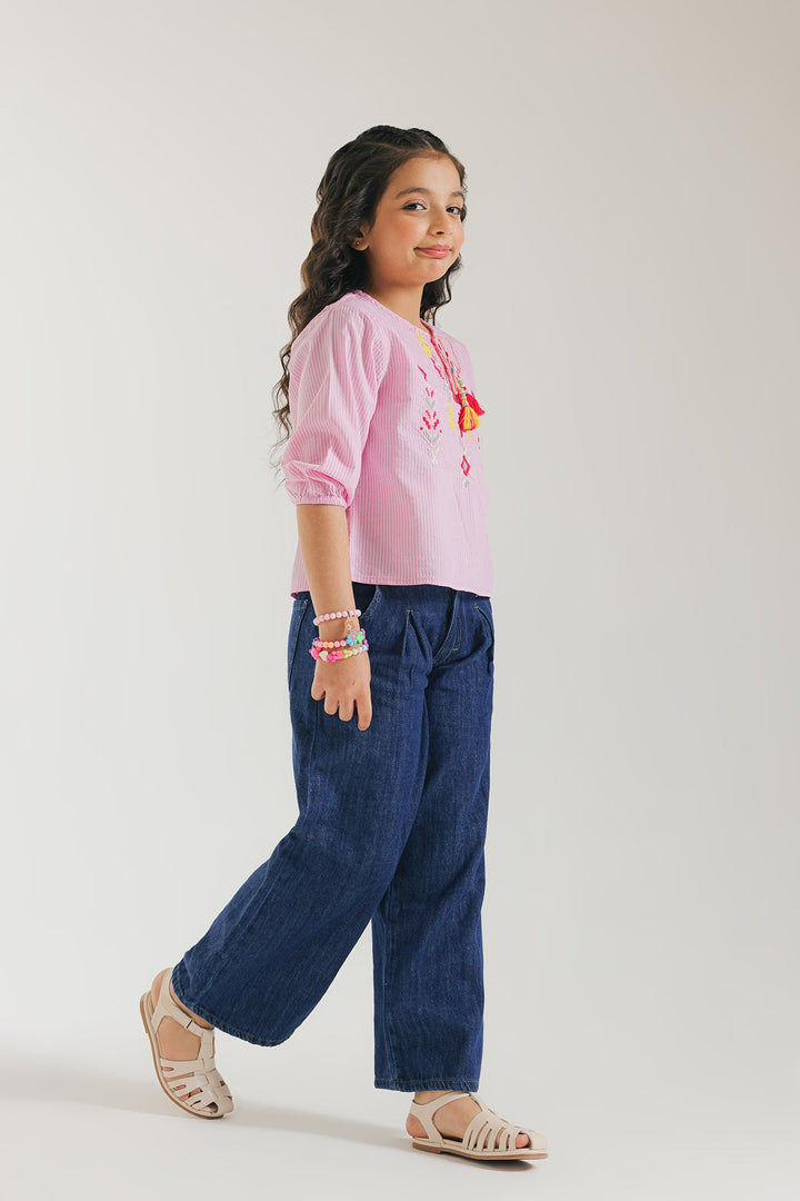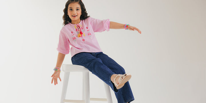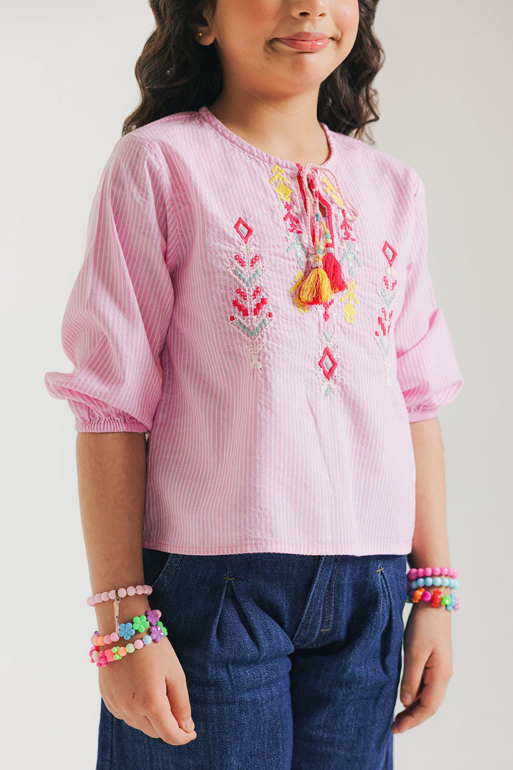 A fascinating composition is portrayed on this graceful top rendered in an appealing pink peacock shade. It is beautifully crafted in a contemporary silhouette and enriched with intricate geometric designs embroidered in vibrant hues. Style this elegant top at fun parties and look classy this season.