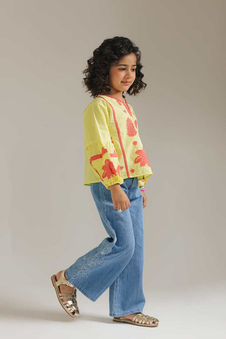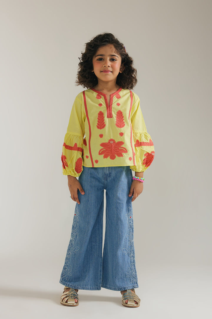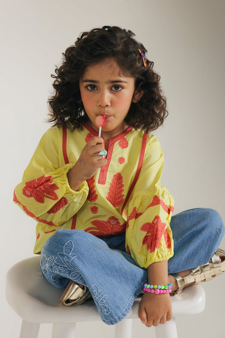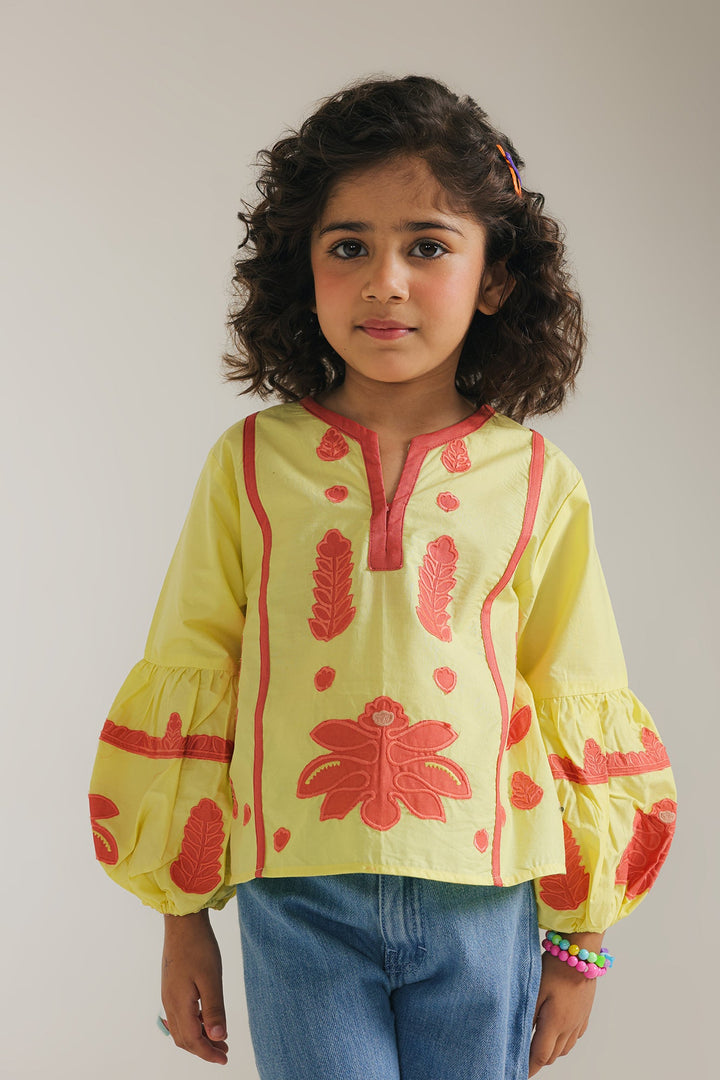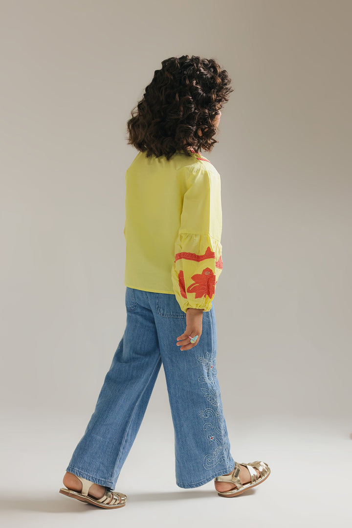 Brighten up any day with this sunny yellow shirt! Playful and chic, it features a vibrant hue, complemented by delicate red floral embroidery. The stylish balloon sleeves add a touch of drama, making it a perfect statement piece for any occasion.