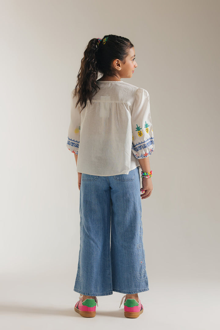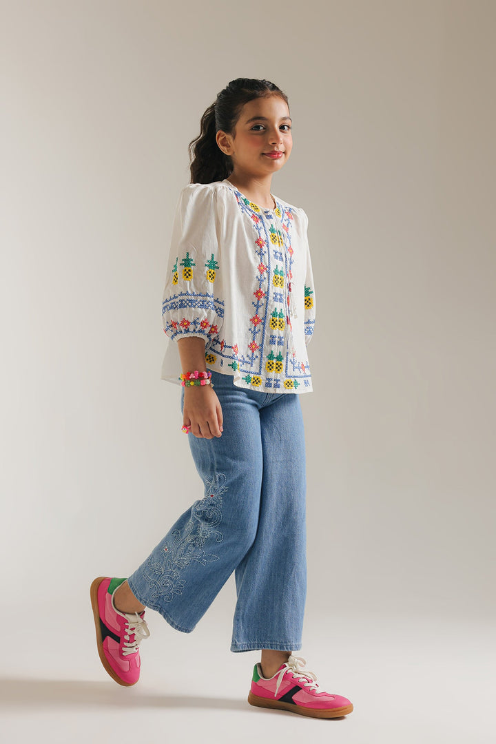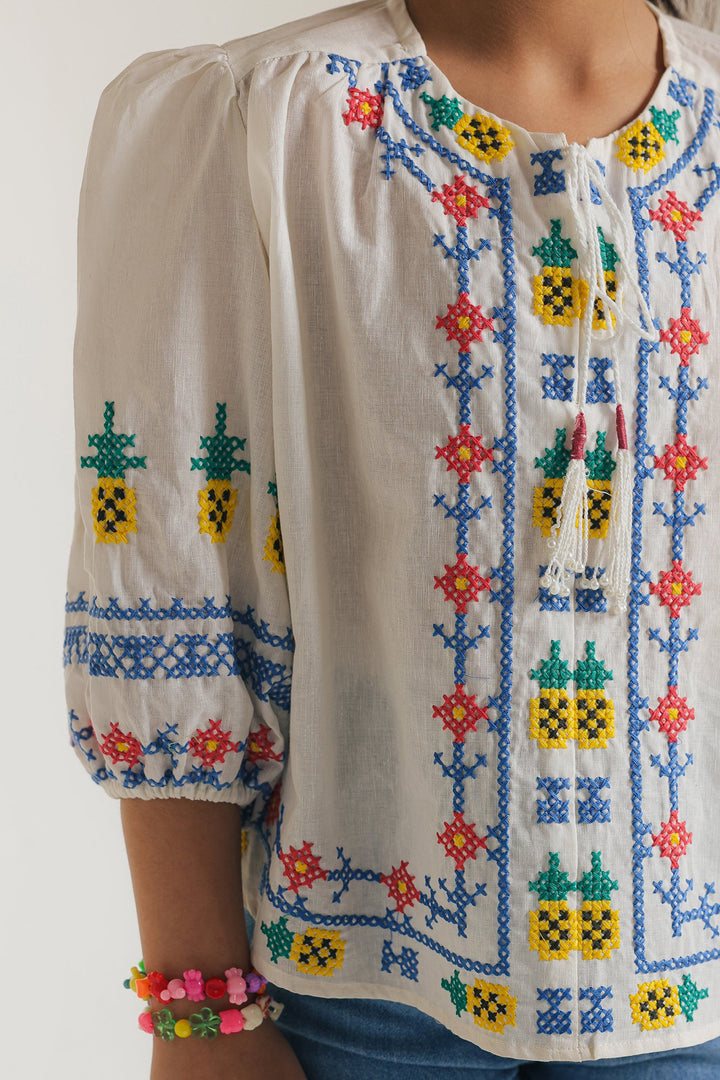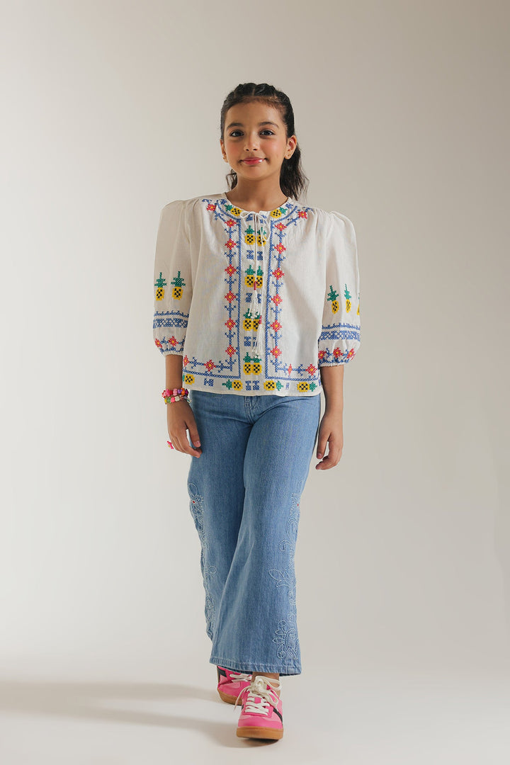 Add a touch of playful charm to your child's wardrobe with this delightful white top. The crisp white fabric provides a perfect backdrop for the vibrant embroidered details that adorn the neckline and sleeves. Cheerful geometric and floral motifs, rendered in a spectrum of bright colors, create a lively and eye-catching design. This comfortable top feature a relaxed fit and three-quarter sleeves, making it ideal for casual occasions.