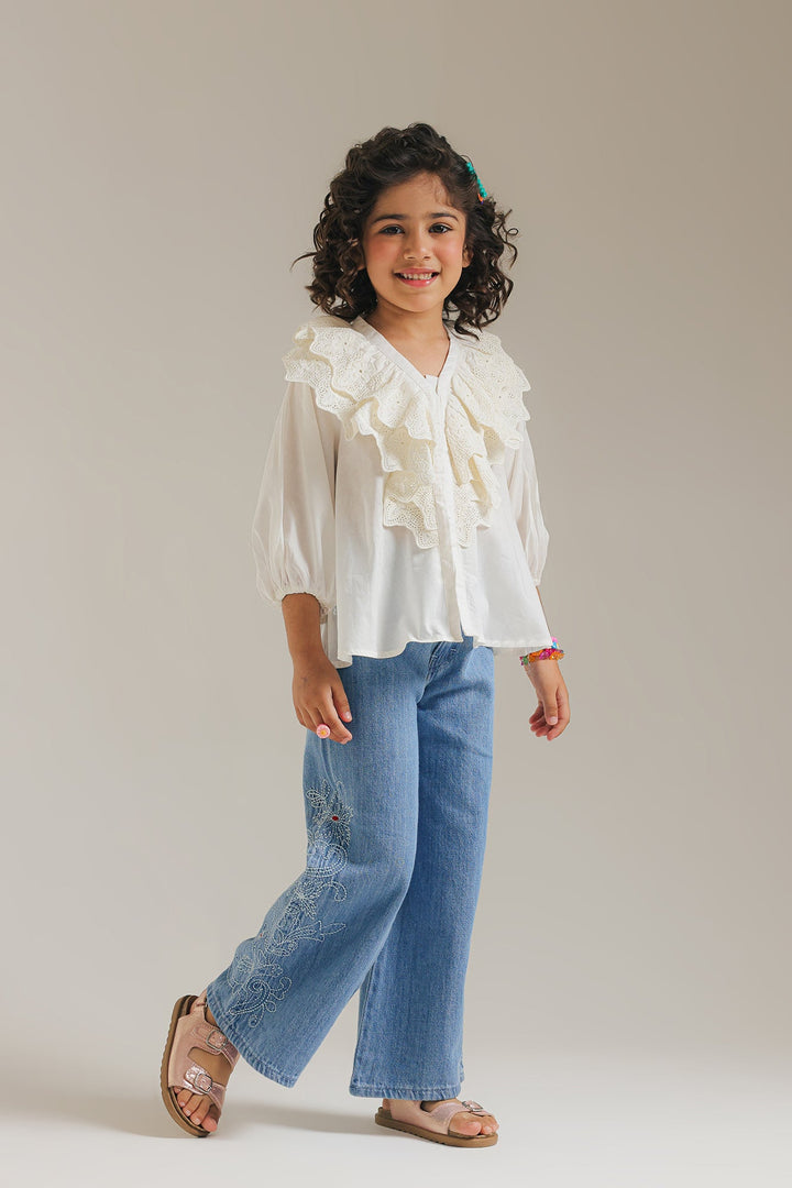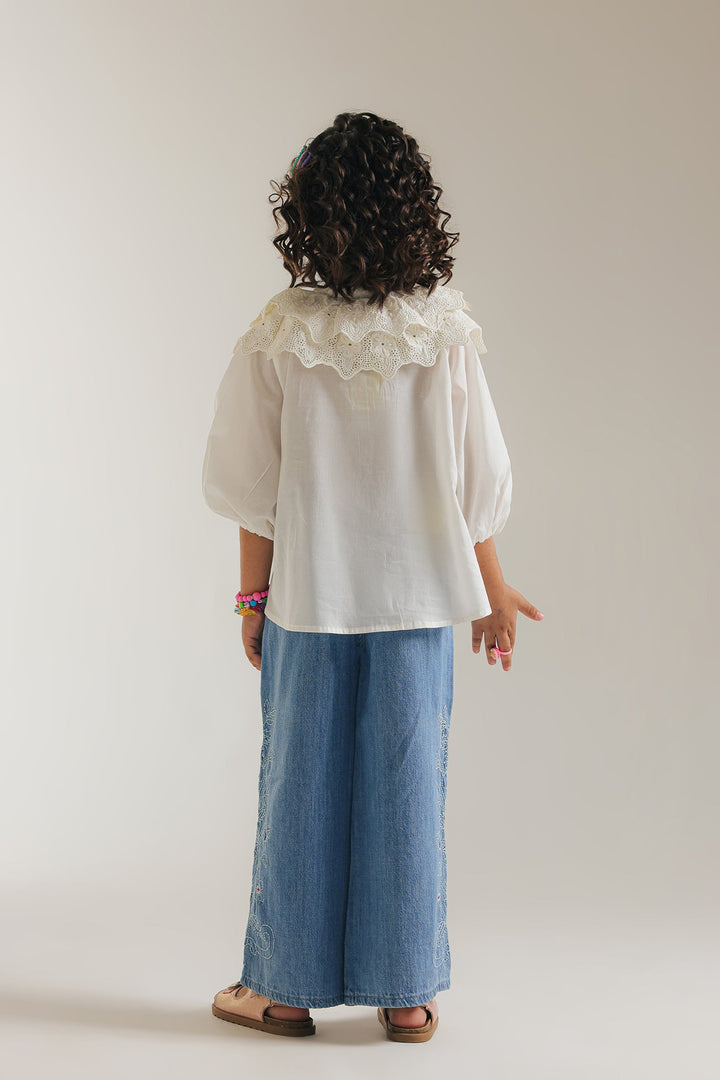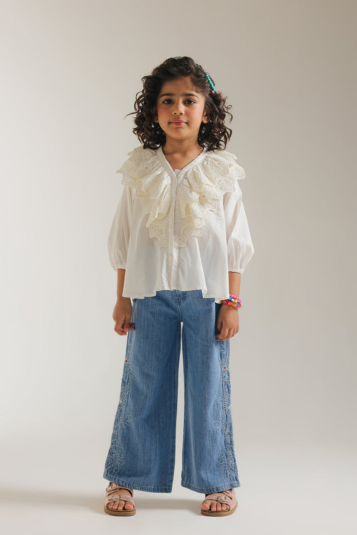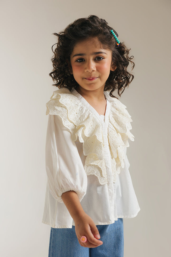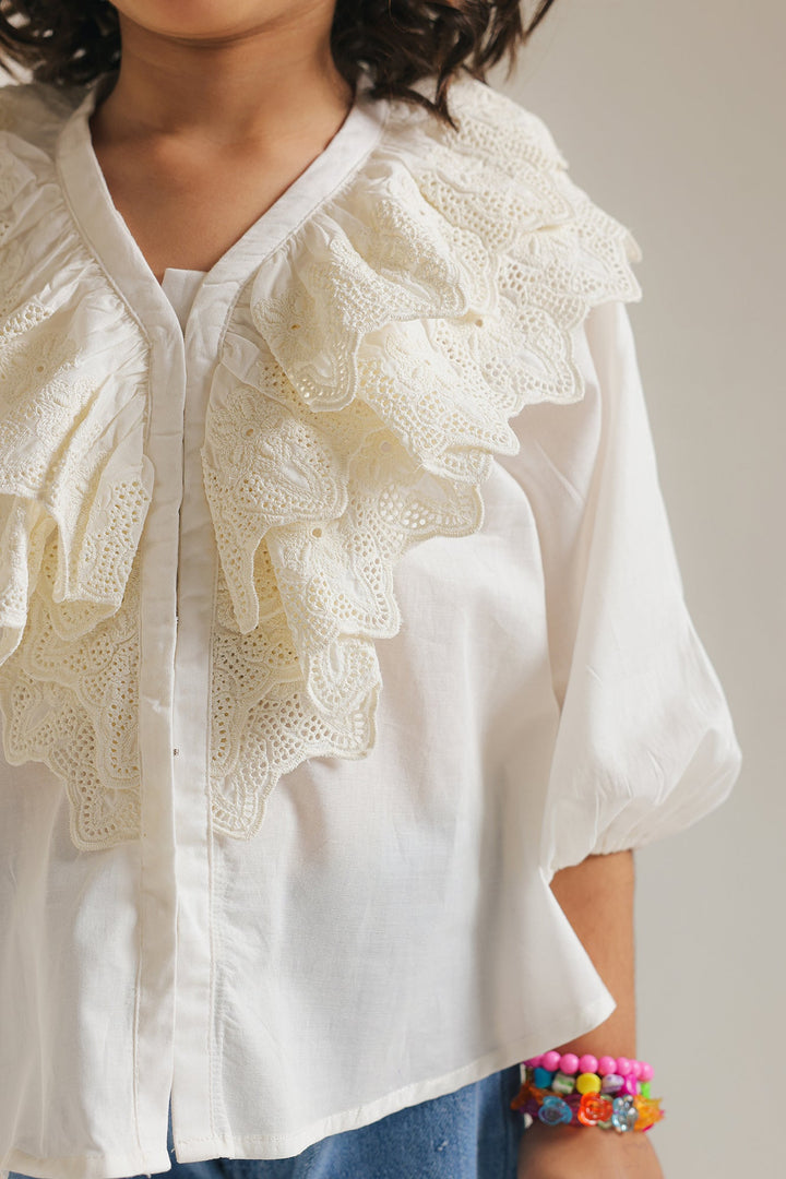Elevate your little one's style with this charming white blouse. The eye-catching ruffled neckline, crafted from delicate lace, adds a touch of vintage-inspired elegance and playful drama. This comfortable blouse features a relaxed fit and gentle puff sleeve, making it perfect for adding a unique flair to any outfit.