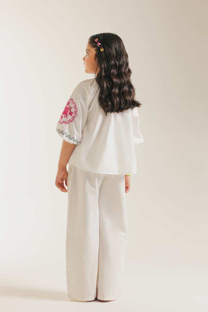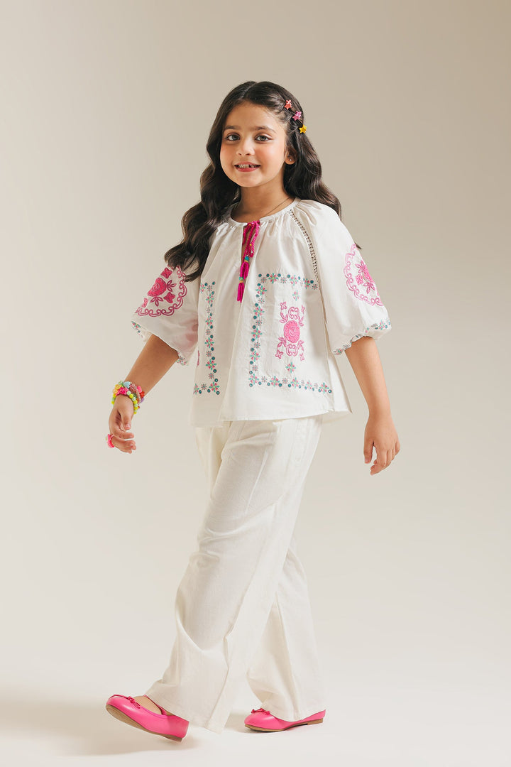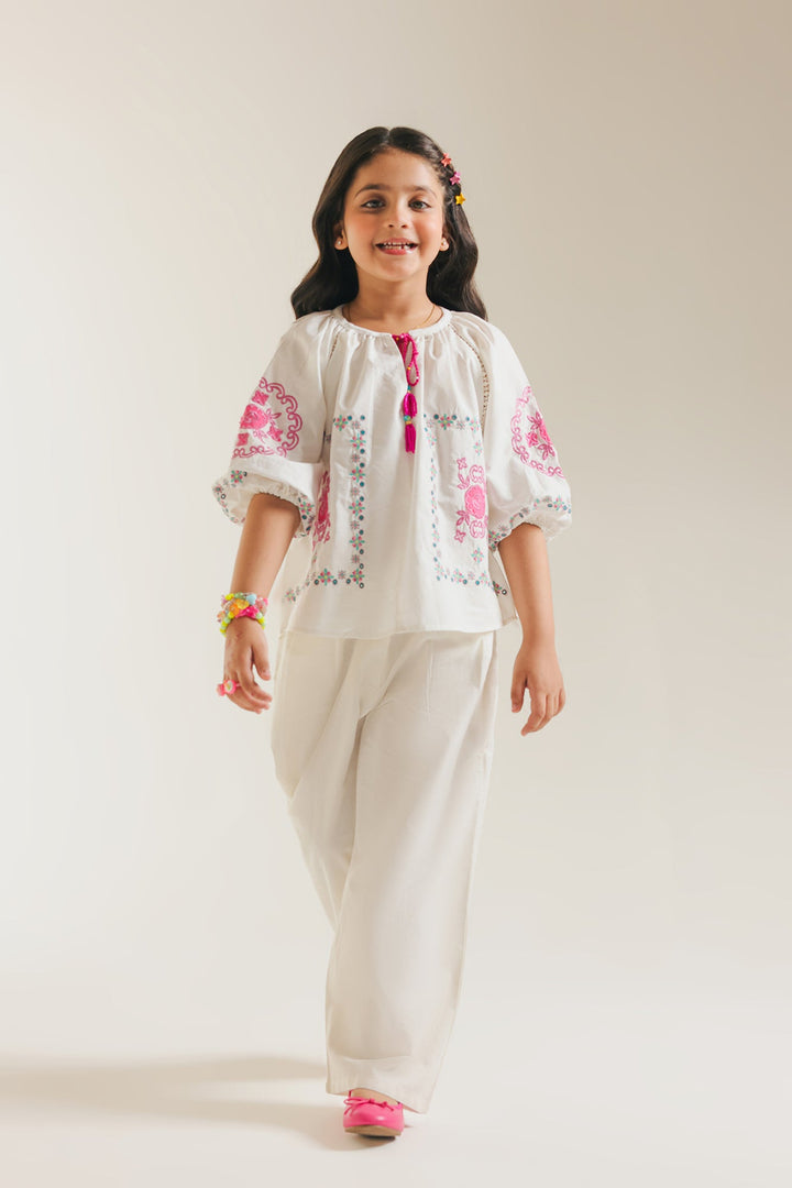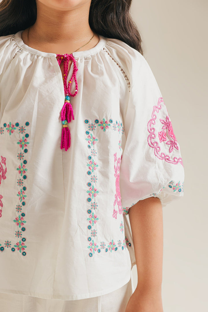 Embrace timeless bohemian elegance with our enchanting white embroidered blouse! The top features delicate pink and blue floral and geometric embroidery cascading down the front and adorning the voluminous puff sleeves. The playful tassel tie-up at the gathered neckline add to its enchanting appeal, while the relaxed fit ensures comfortable wear. Perfect for adding a touch of free-spirited grace and artistry to her wardrobe, making it ideal for both casual outings and special occasions.