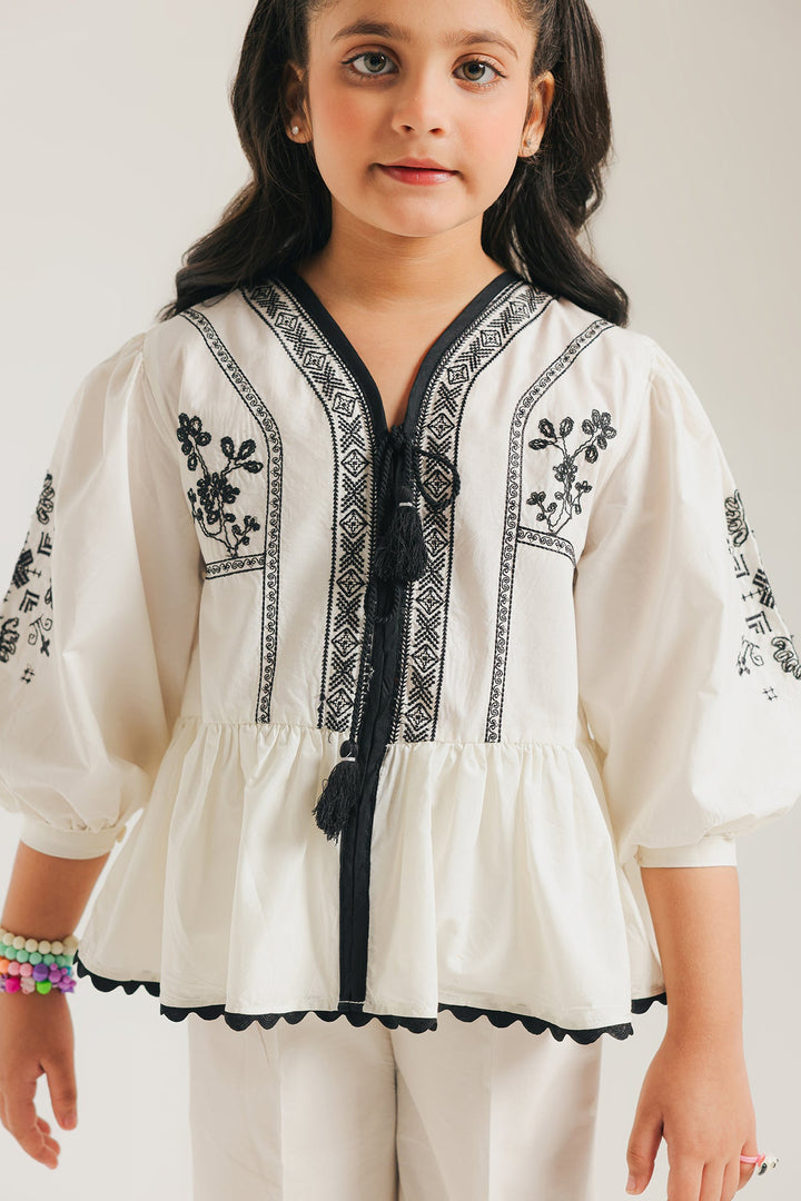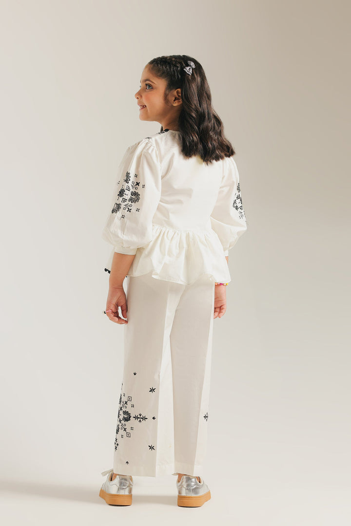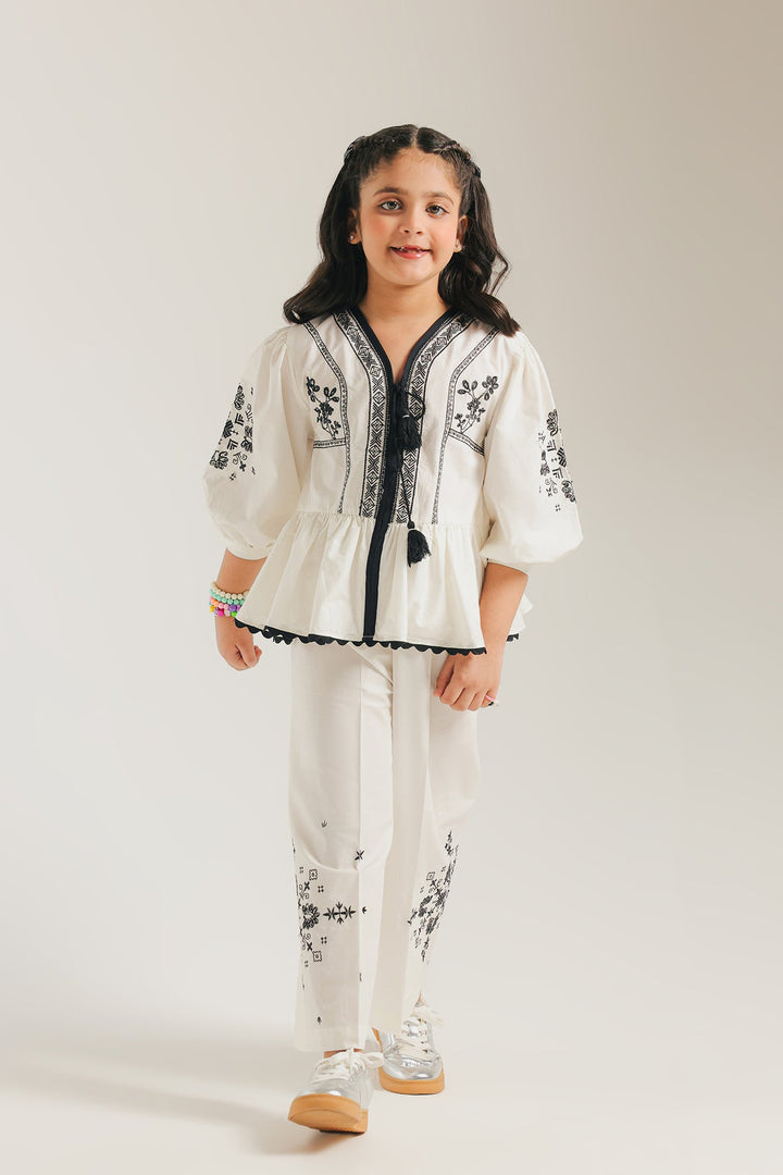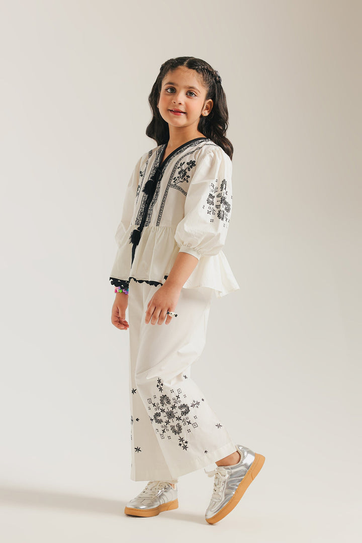 This co-ord set is a modern take on classic folk-inspired design. The ensemble features an elegant off-white top with intricate black embroidery, a V-neckline with tassel ties, and a playful ruffled hem. The sleeves are designed with a graceful puff style, also adorned with detailed embroidery. The set is completed with matching wide-leg trousers that feature a comfortable elastic waistband and bold, symmetrical black embroidery at the hem, creating a striking and cohesive look that is both stylish and timeless.