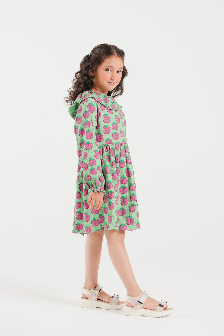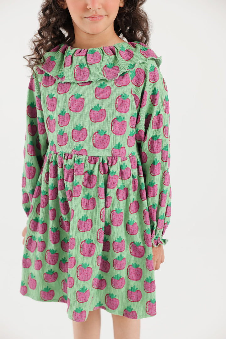 Look stunning at fun parties with this resplendent outfit. This elegant dress is designed in a luscious green colors and adorned with refreshing strawberry prints in mesmerizing tones, with a gorgeous silhouette featuring frill at neck and gathers below yoke. Look radiant and stand out from the crowd with this fashionable piece.
