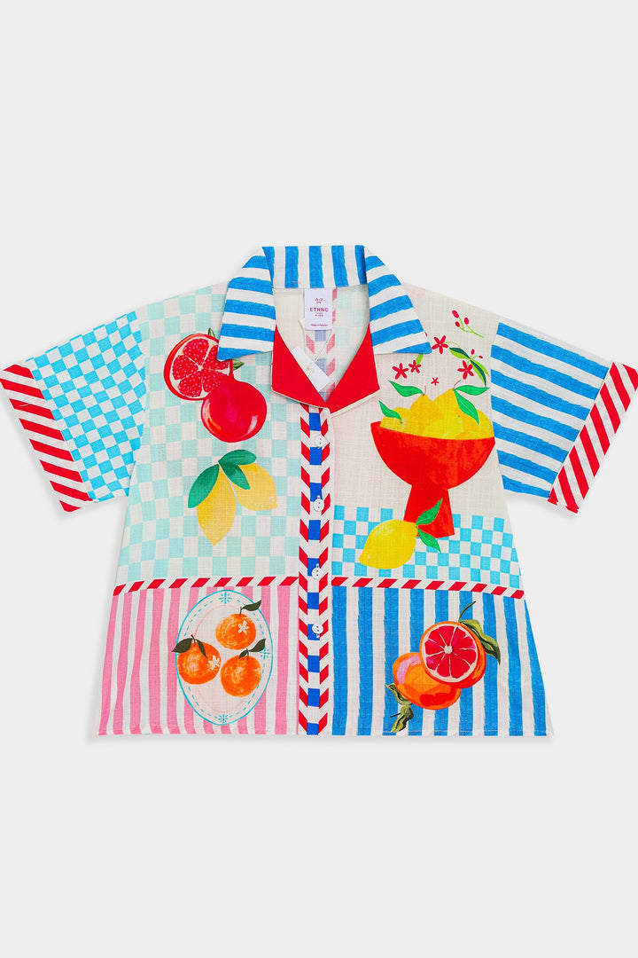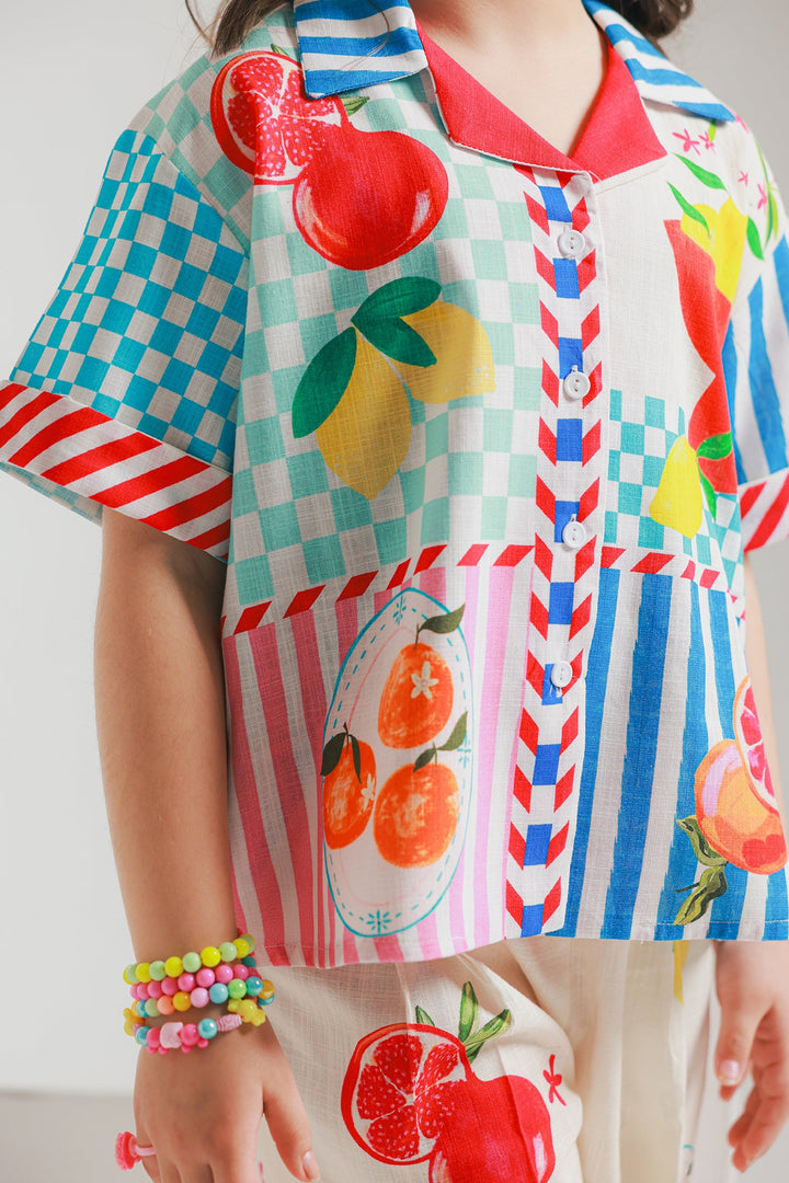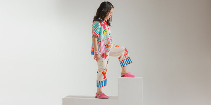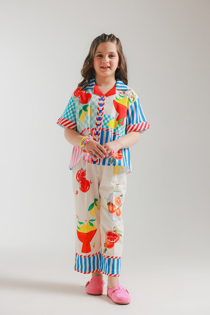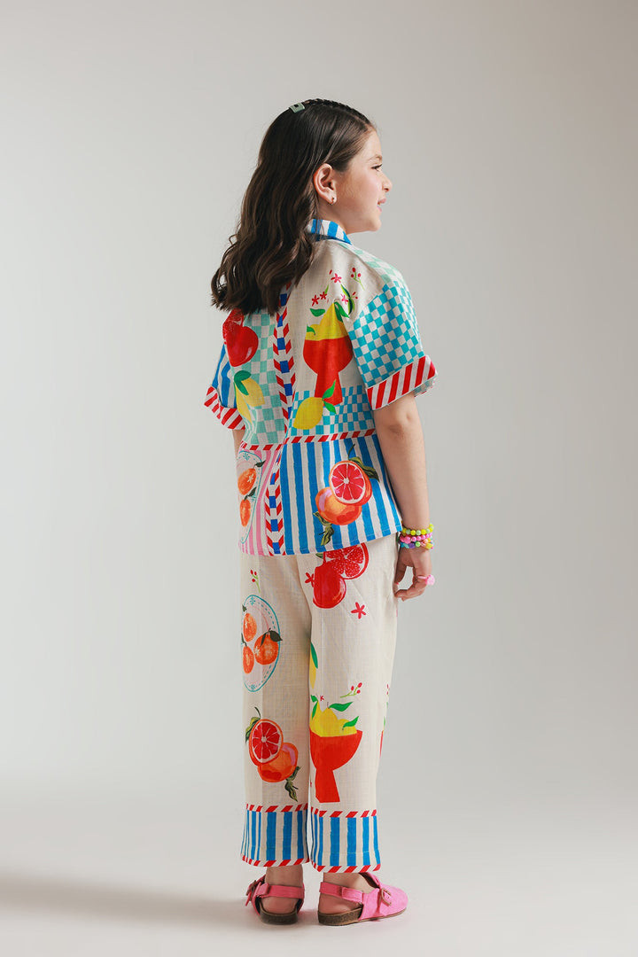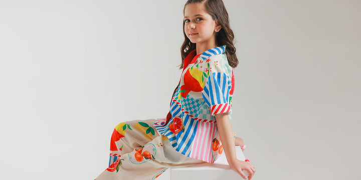 A contemporary composition crafted in a trendy silhouette button down top beautifully adorned with captivating artistic abstract prints in vibrant colors with mesmerizing patterns. Paired with a matching trouser, this style statement outfit is a perfect option for your girls to embrace this spring season.
