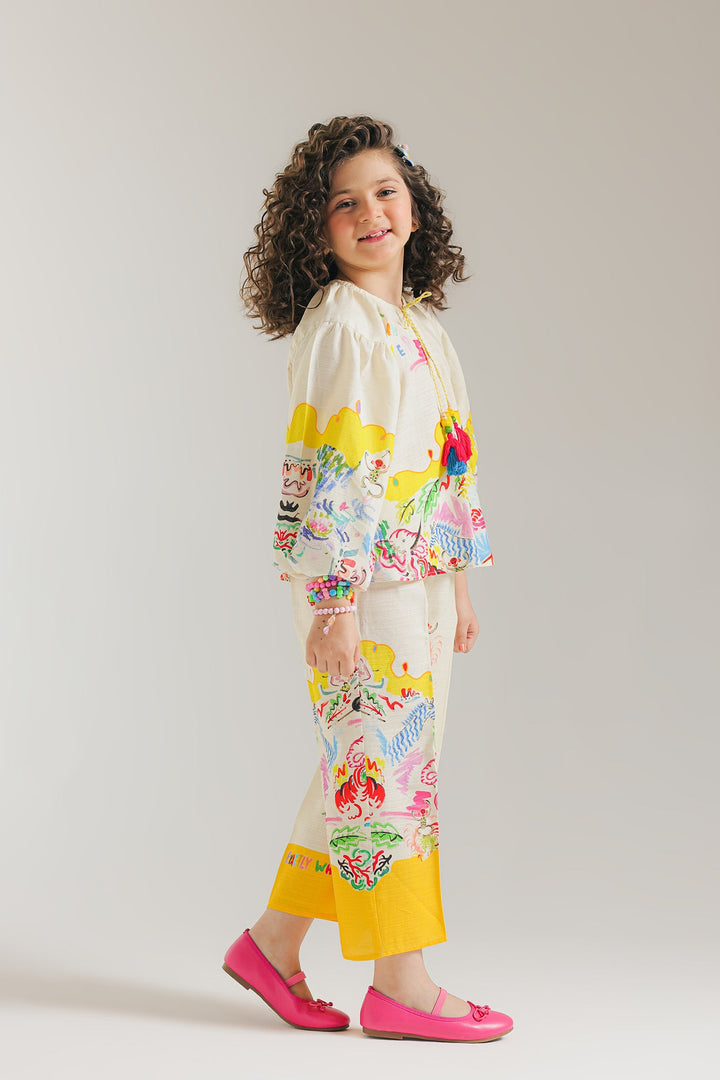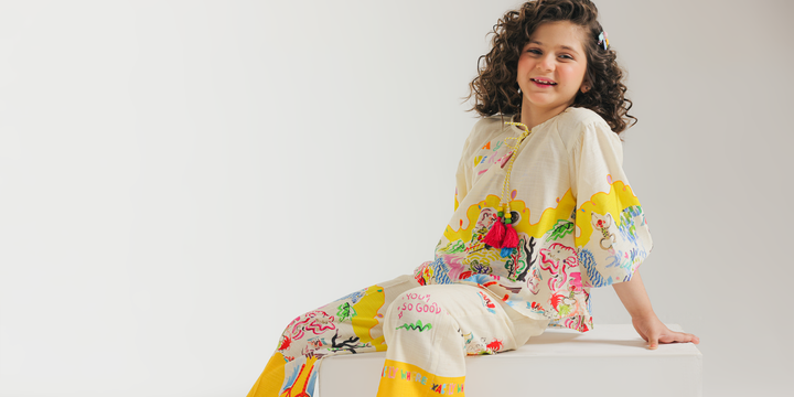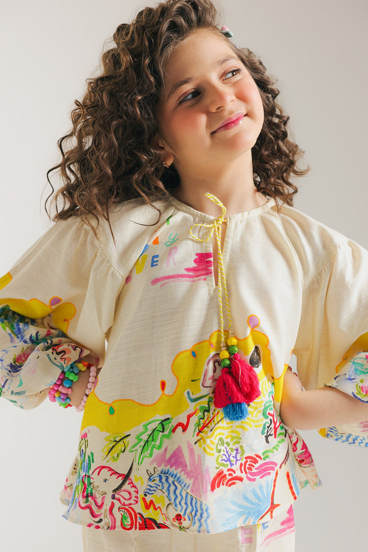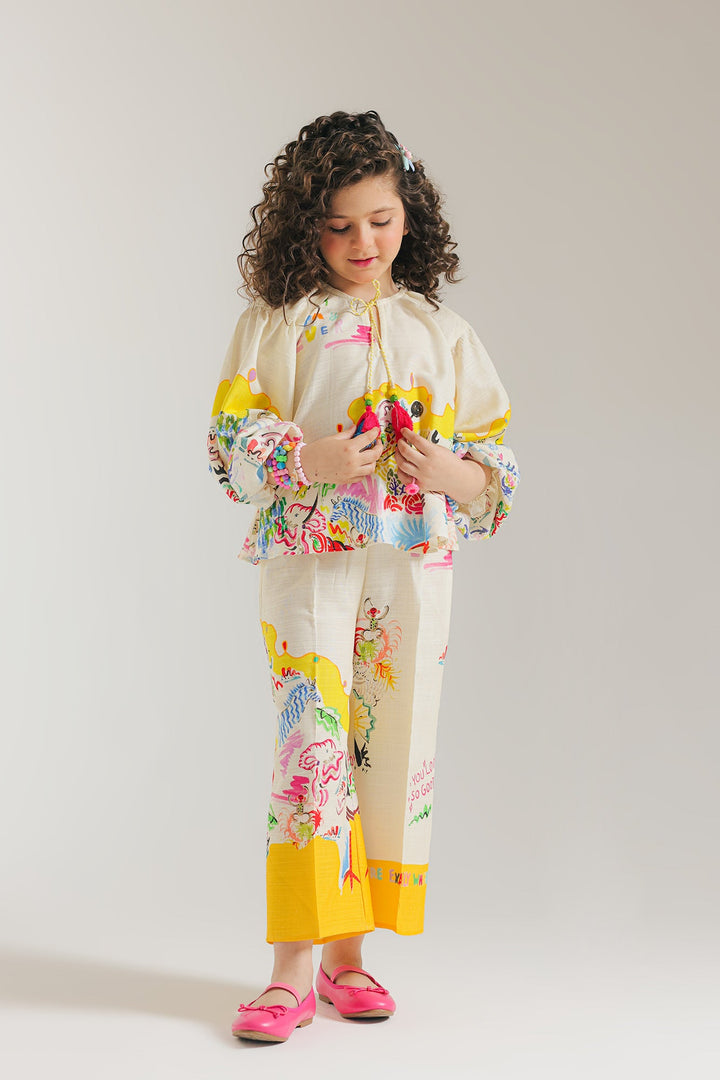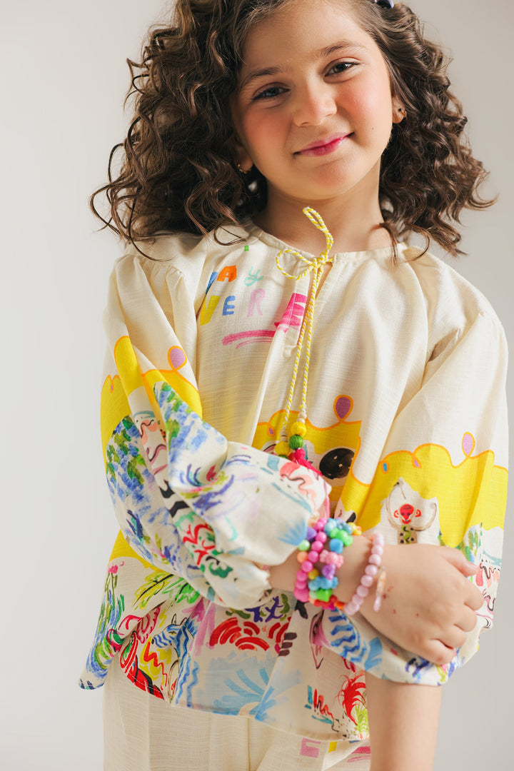 Crafted to perfection, the elegant co-ord set oozes sophistication and style. The classy loose fit printed top adorned with abstract designs in vibrant colors radiates confidence, while the wide-leg trousers feature a gleaming artistic pattern. This versatile and chic ensemble will elevate your girls' style for any occasion..
