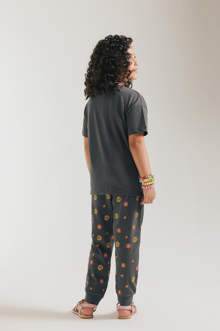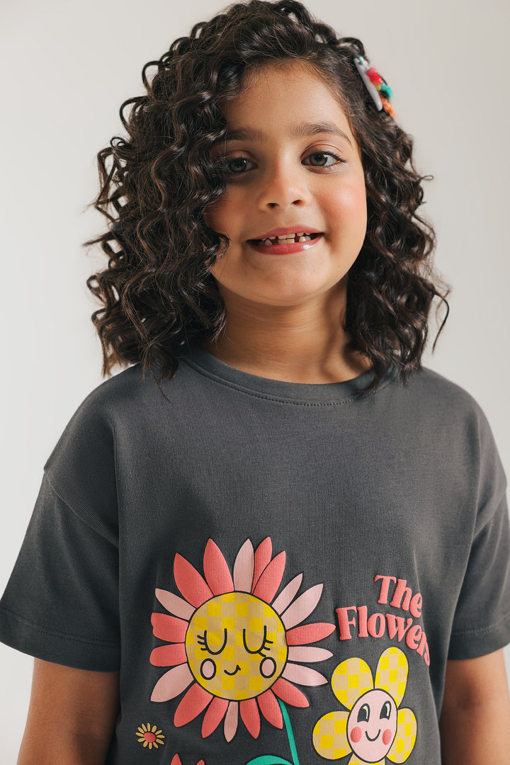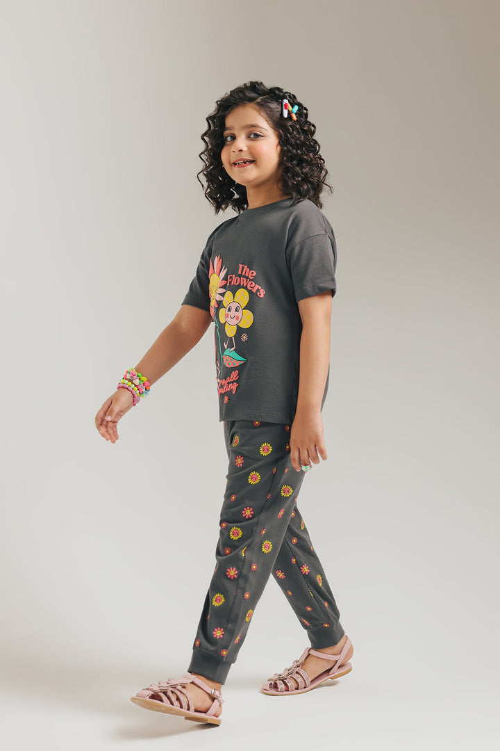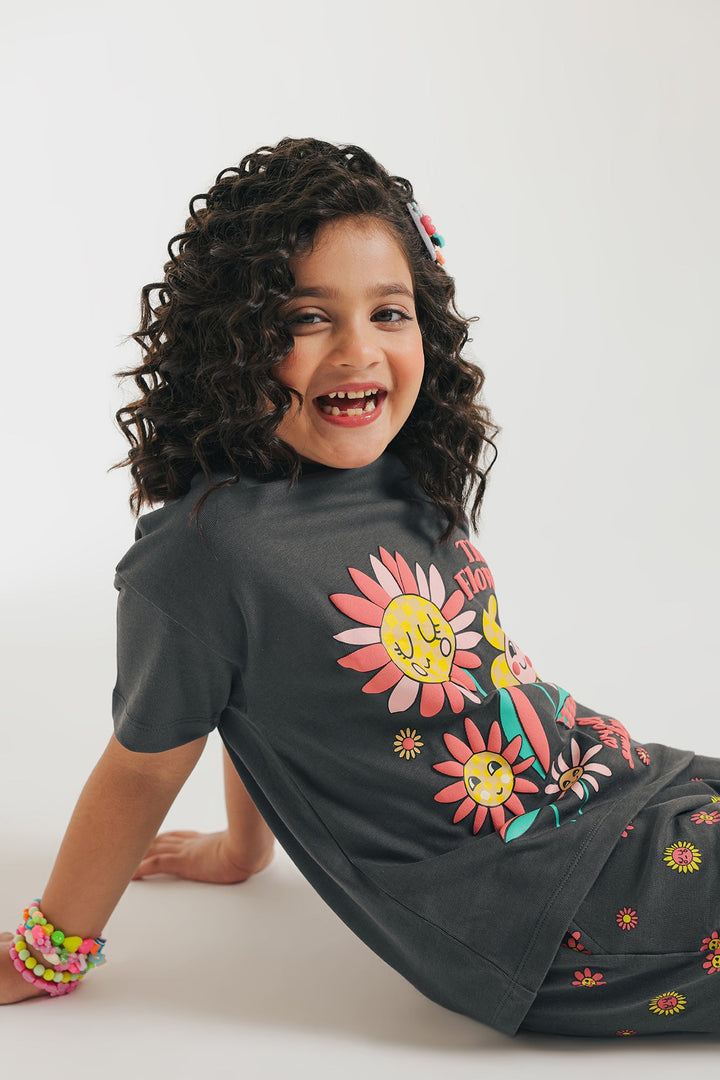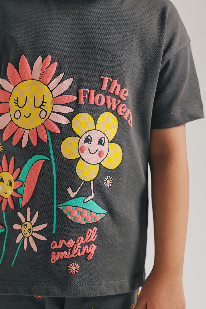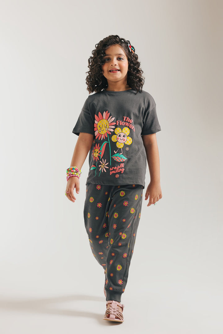 Bring endless smiles to your little one's day with this delightful grey coord set, a perfect blend of comfort and playful positivity! The charming dark grey T-shirt features a vibrant graphic print surrounded by whimsical colorful flowers in yellow, pink, and orange. It is perfectly complemented by coordinating dark grey trousers adorned with an all-over print of bright, smiling floral motifs, creating a cohesive and joyful look. This set is ideal for casual outings, playdates, or adding a distinctive and happy flair to your child's everyday style.