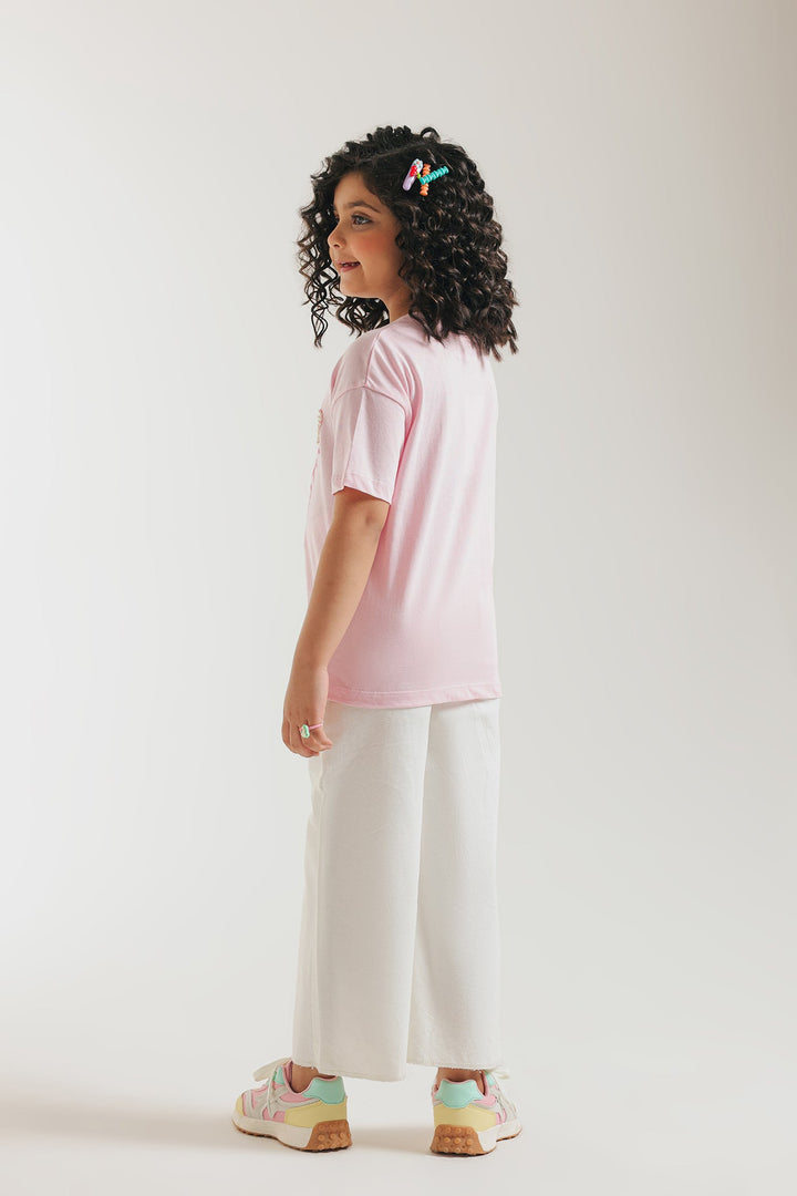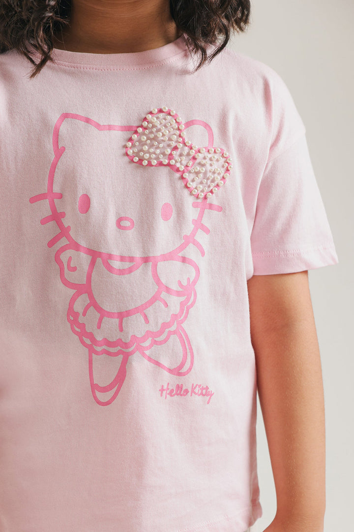 Dress your little one in delightful charm of this adorable pink graphic tee, a perfect blend of comfort and playful style! This short-sleeved top features a charming illustration of Hello Kitty, with a glittery polka-dot bow, adding a touch of sparkle and iconic fun.