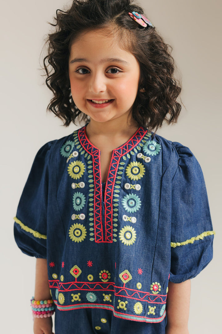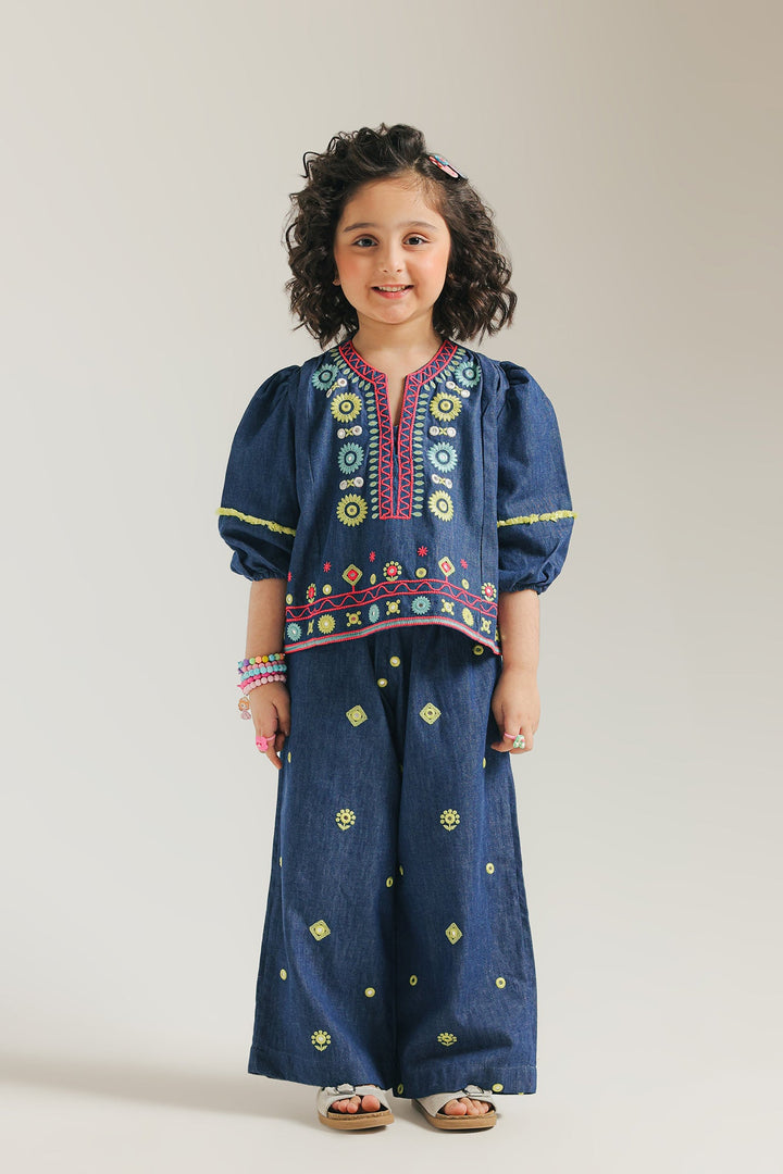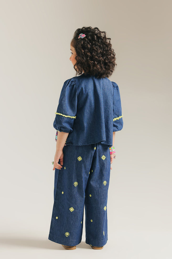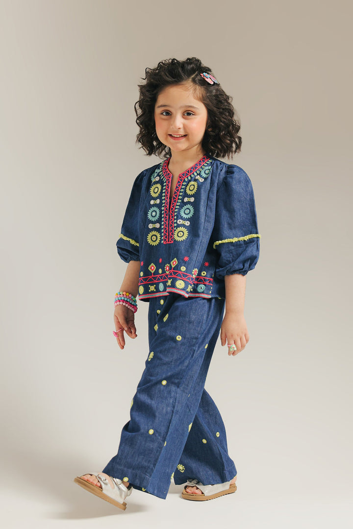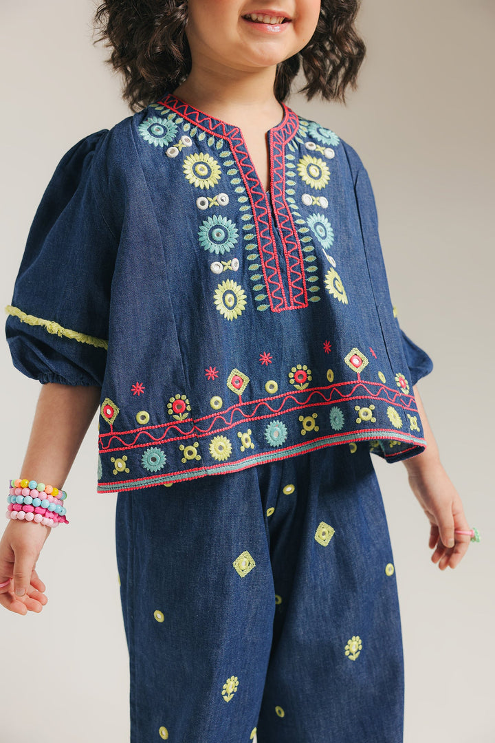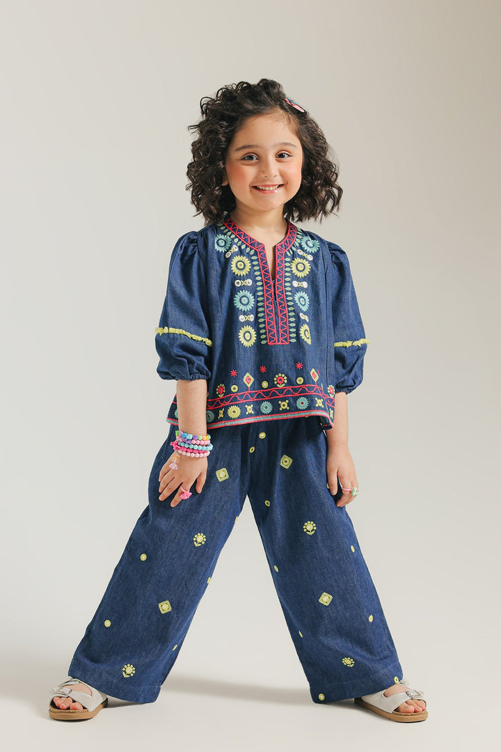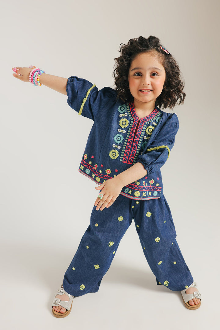 This charming co-ord set is a delightful blend of vibrant folk-inspired embroidery. The ensemble features a relaxed-fit top with a V-neckline and intricate, multi-colored floral and geometric embroidery that creates a beautiful focal point. The sleeves are designed with a gentle puff and elastic cuffs, adding a touch of volume and comfort. The set is completed with matching wide-leg trousers that have a comfortable elastic waistband and are subtly embellished with scattered floral embroidery, making this outfit a perfect choice for a fun and stylish day out.