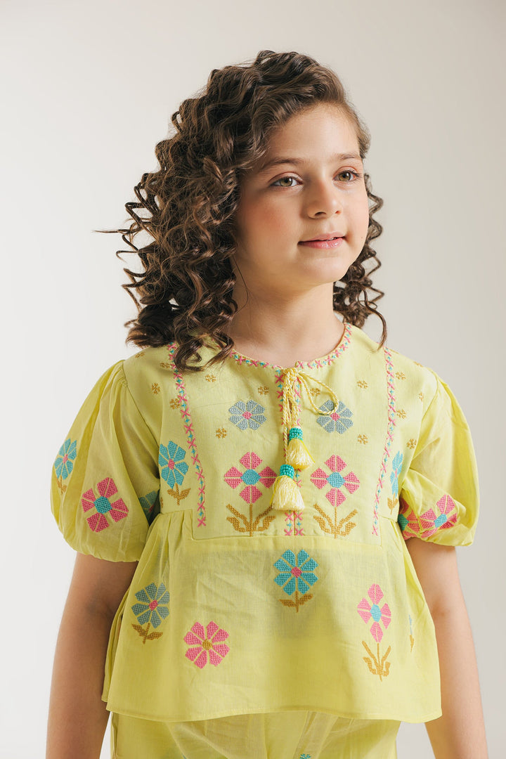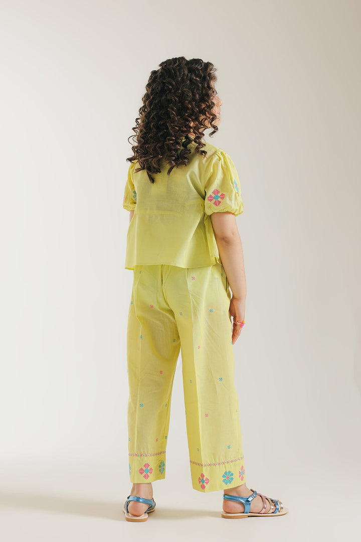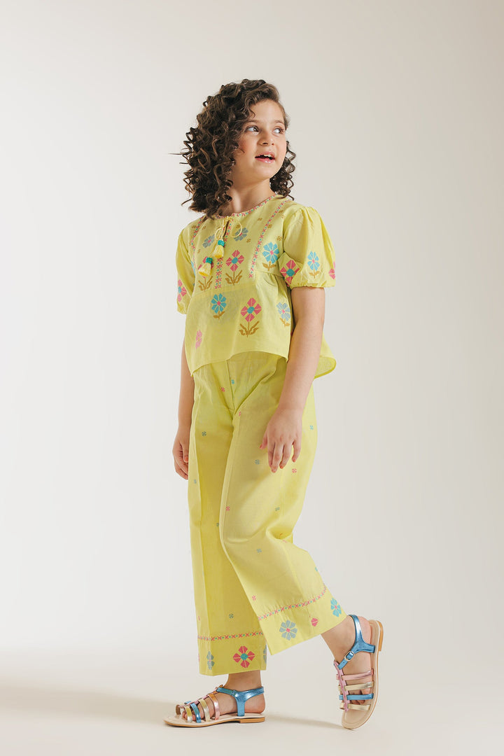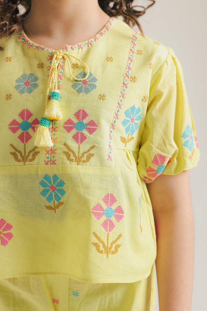 This classy co-ord set combines contemporary design with captivating floral embroidery, perfect for the summer season. The trendy silhouette peplum top and matching trouser are crafted in vibrant yellow beige hue and enriched with beautiful floral embroidery with cross stitch technique in mesmerizing colors for a stylish and sophisticated look. A must-have for any fashion-forward individual.