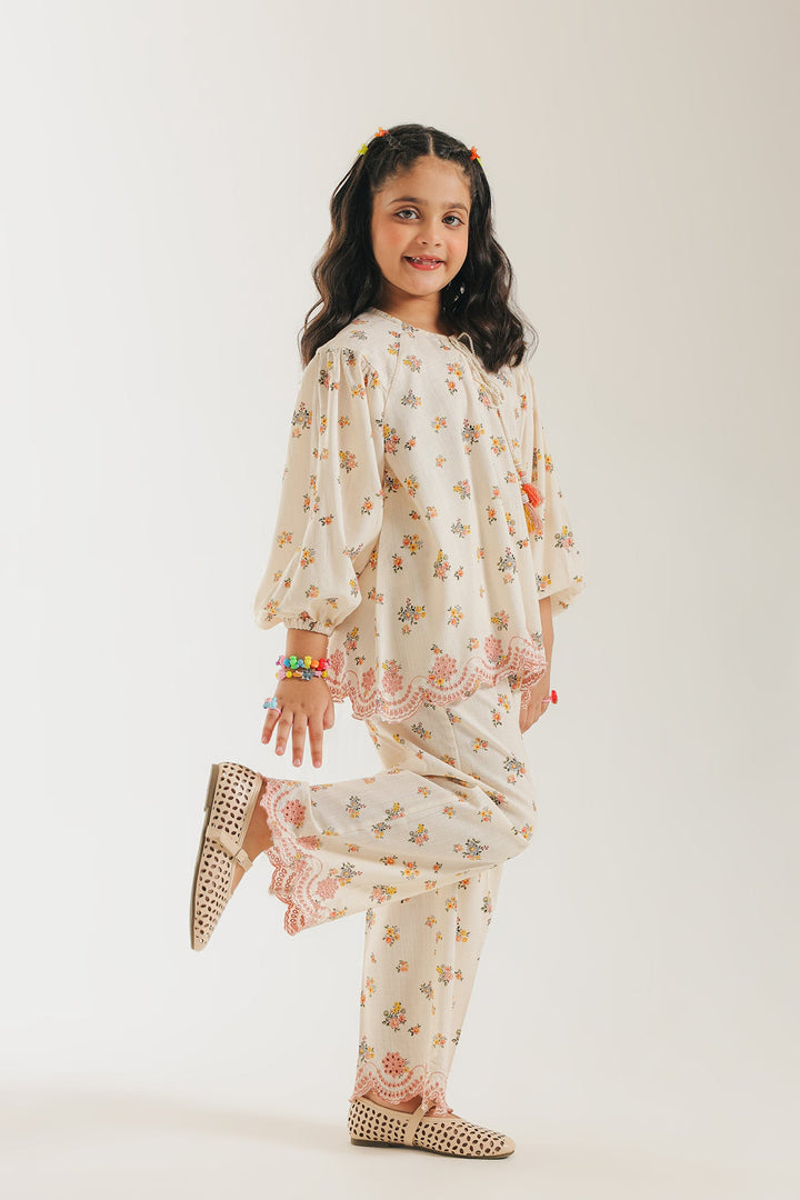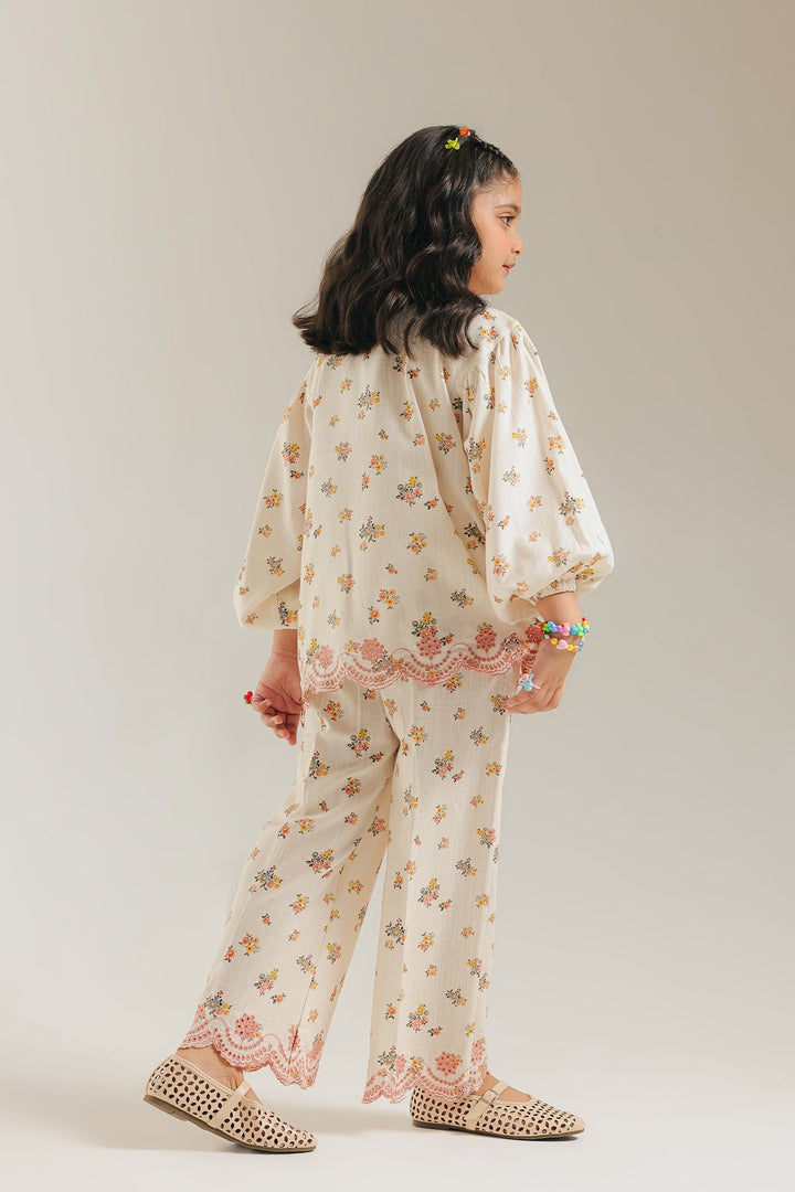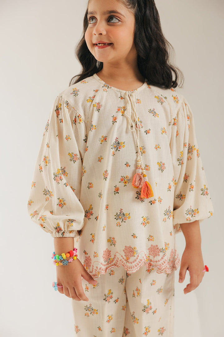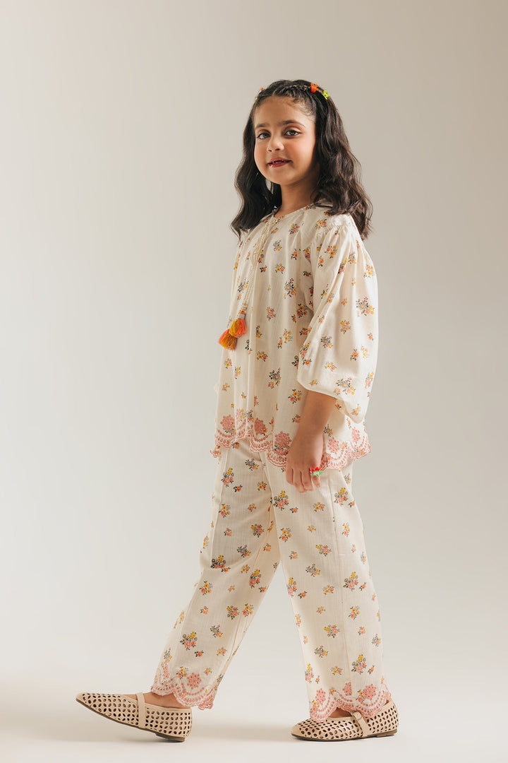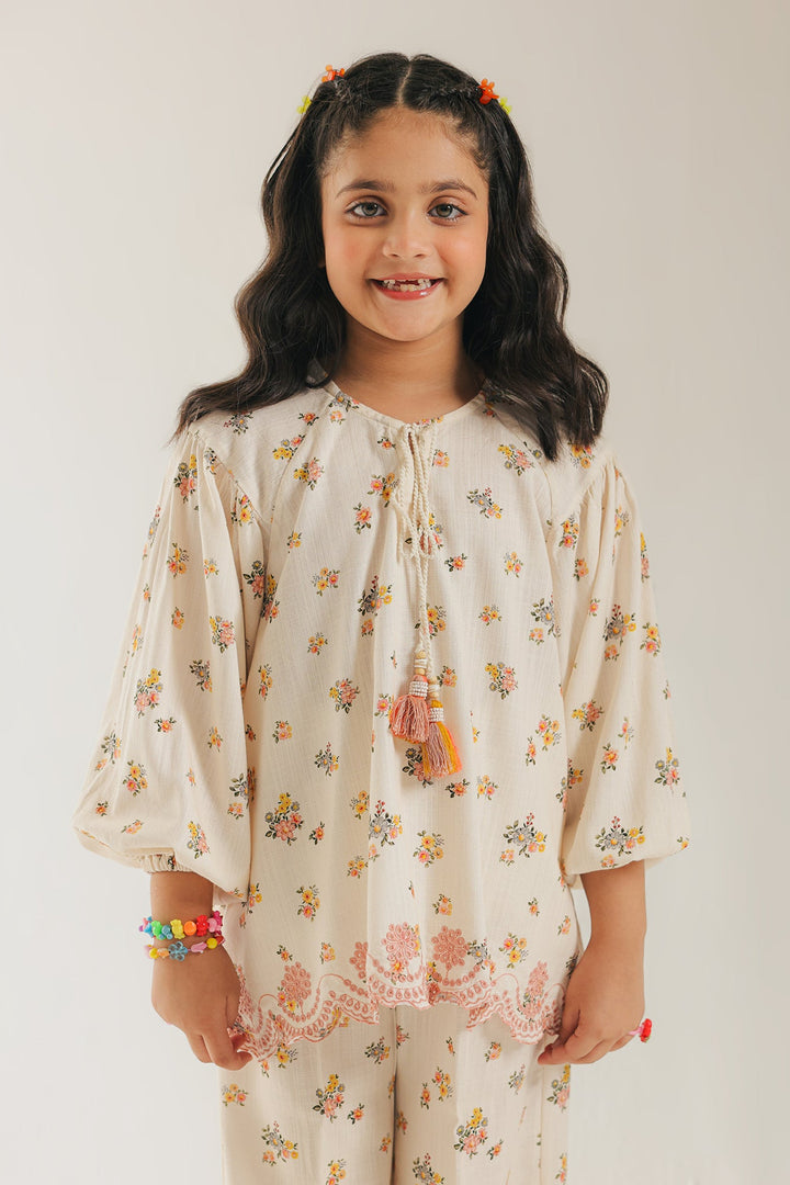 Delight her wardrobe with this charming and playful co-ord set, crafted from a soft, off-white fabric adorned with an all-over print of cheerful floral bouquets in shades of pink, yellow, and orange. The ensemble features a relaxed-fit blouse with voluminous sleeves and a tassel-tied neckline, beautifully finished with a scalloped, embroidered border at the hem. Completing the look are the matching wide-leg trousers, which share the same delicate floral print and are finished with a beautiful, scalloped embroidered trim at the hemline, making this a perfect set for a stylish and comfortable day out.