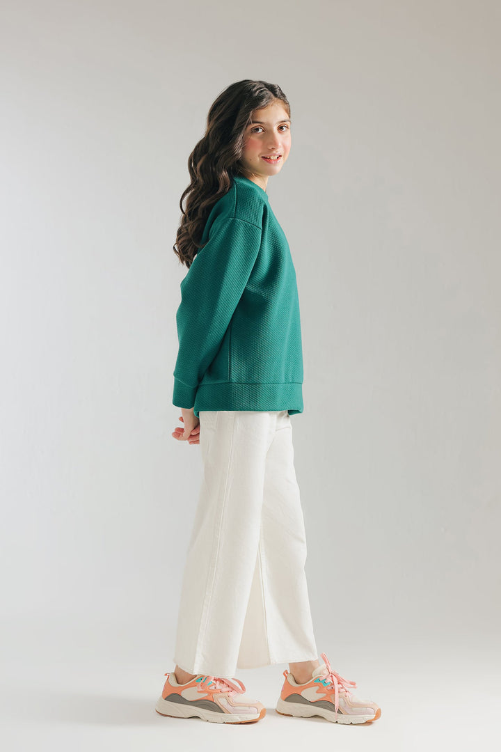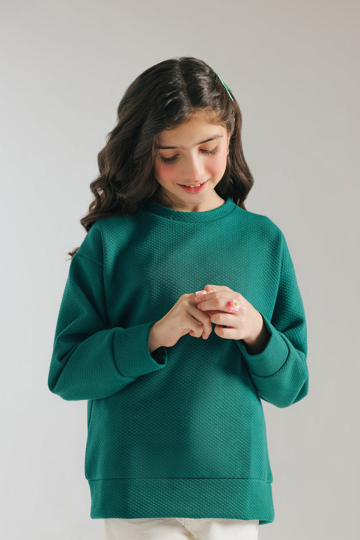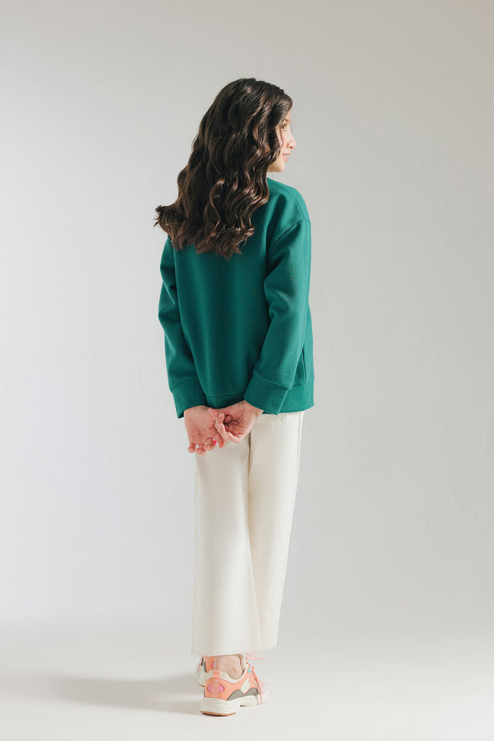 A contemporary composition is portrayed on this trendy sweatshirt rendered in an luscious emerald color. Enhanced with textured fabric and crafted in a fashionable silhouette, this chic sweatshirt is a perfect option for fun gatherings this winter season.