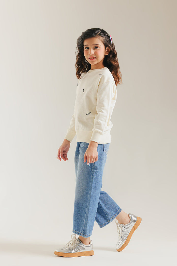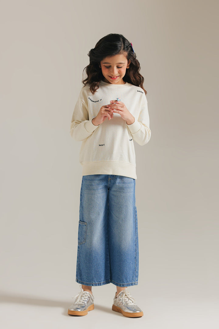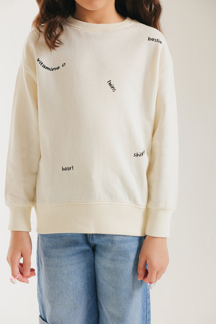 Celebrate cozy, casual comfort with this charming cream sweat shirt. This classic, crew-neck sweat shirt is made from a soft, off-white fabric. It features playful, scattered black text details like "vitamin a," "hello," and "shine" across the chest. The simple, straight cut and ribbed cuffs make it perfect for layering and everyday adventures.