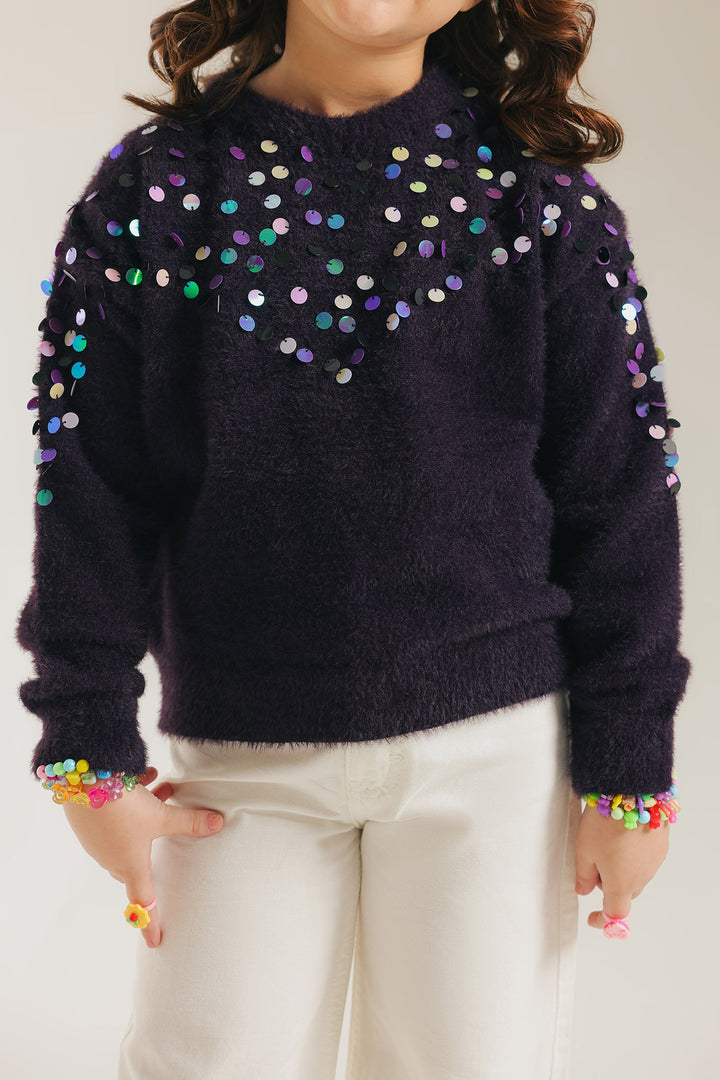 Bring playful sparkle to chilly days with this charming sweater. The plush, dark plum knit is generously embellished with colorful, oversized sequins that shimmer across the shoulders and sleeves, creating a festive, confetti-like effect. With its cozy, relaxed fit and bright embellishments, this sweater is the perfect fun and fashionable piece to pair with wide-leg trousers for a stylish, warm winter look.