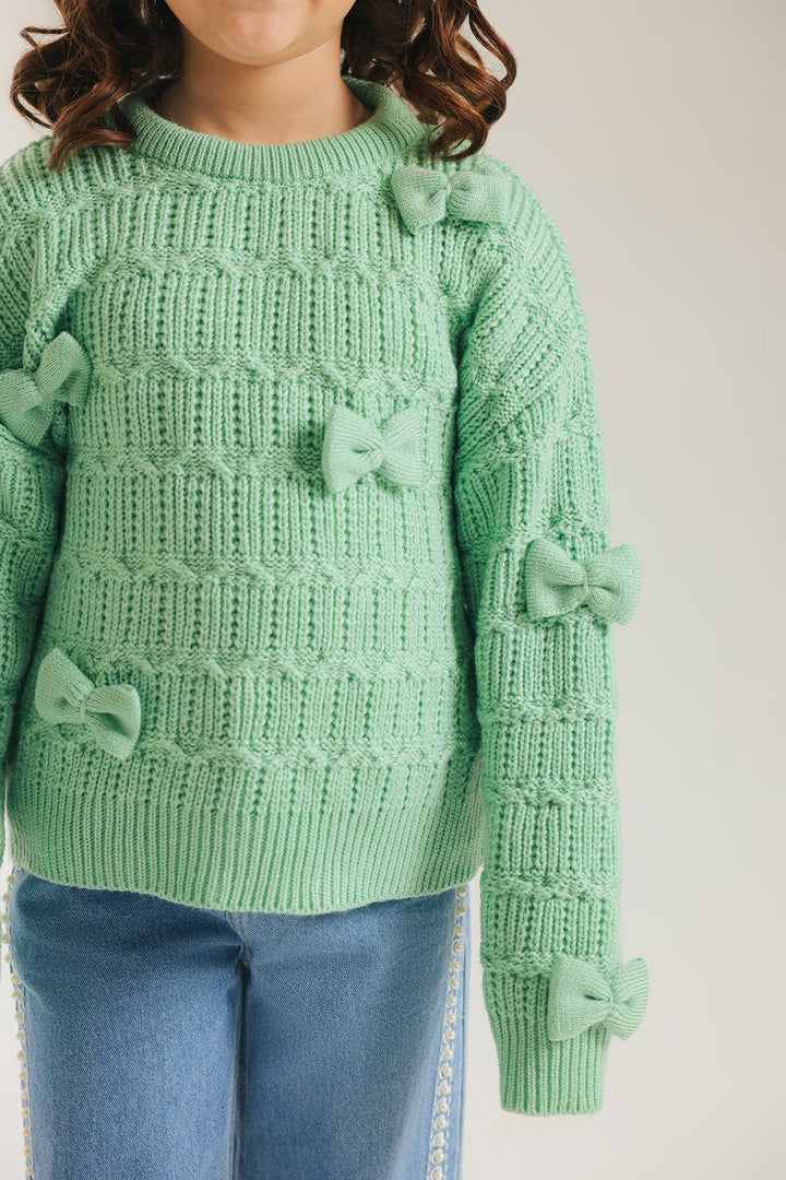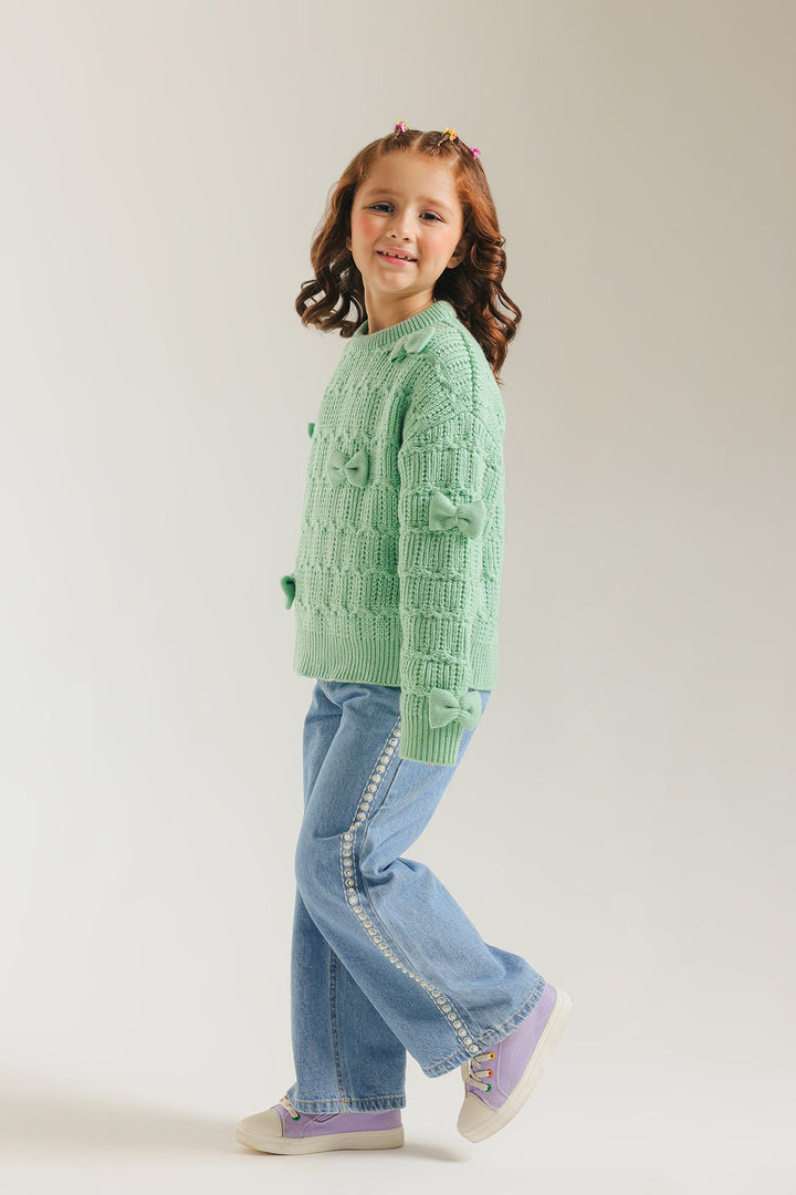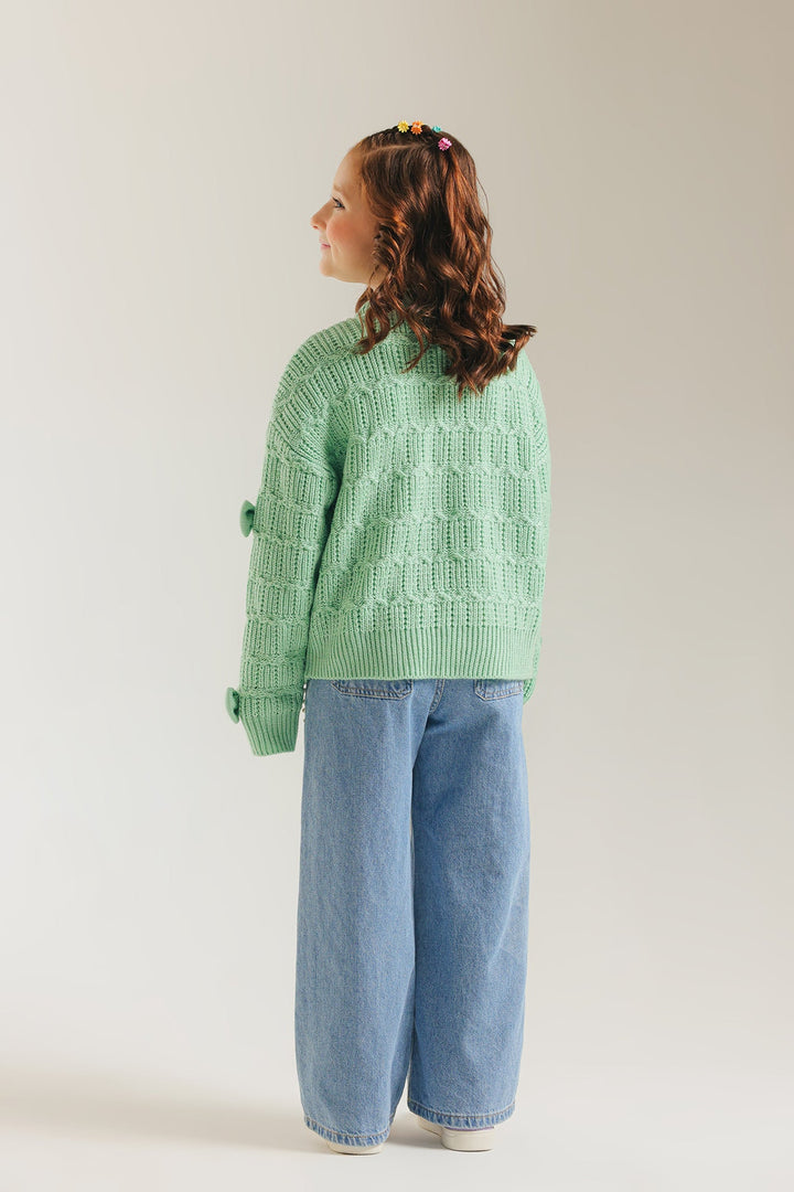 Embrace cozy chic with this delightful mint green sweater. The soft, chunky knit features a beautiful honeycomb texture and is playfully adorned with charming mint green bows along the sleeves and front. With its relaxed fit, crew neckline, and whimsical embellishments, this sweater is the perfect statement piece to layer over jeans for a warm and stylish look.