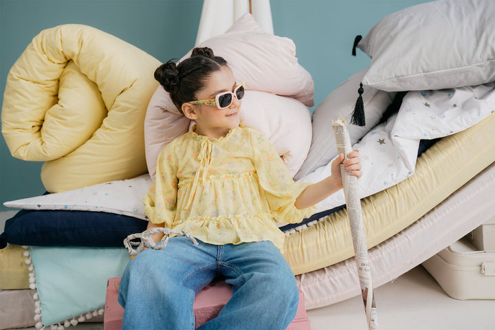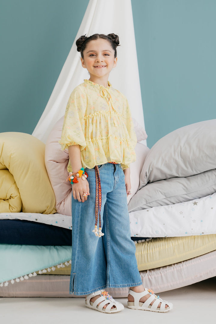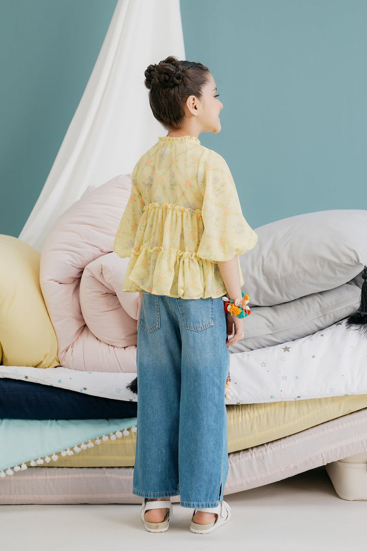 This gleaming yellow shade top is perfect for a fashionable look. Its peplum silhouette and cheerful floral prints in vibrant hues will make you stand out from the crowd. This contemporary top is a perfect for you girls to style for fun gatherings.