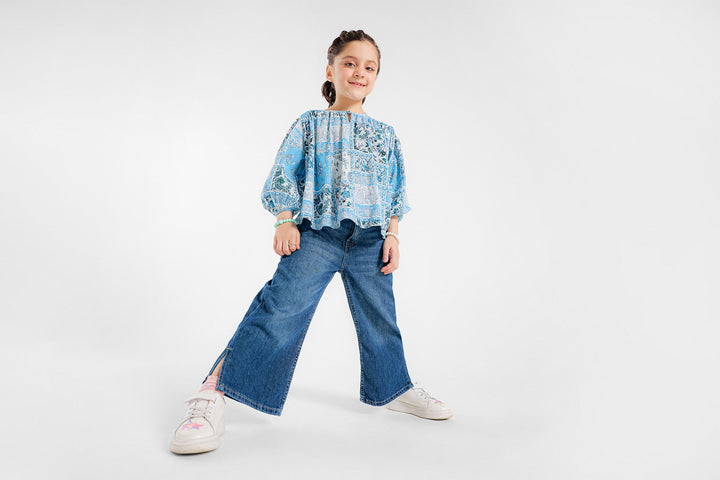 Let your little one's style shine with this delightful blue and white printed top, a charming addition to their wardrobe! This unique piece features a captivating patchwork-style print, blending various floral and geometric patterns in refreshing shades of blue, white, and subtle green. The round neckline with a small keyhole detail adds a touch of sophistication, while the elegant pleats on the bodice create a lovely texture and comfortable fit. Designed with full, gathered sleeves that cinch at the wrist, this top offers a stylish silhouette perfect for active play and casual outings. Pair it with jeans, shorts, or a skirt for an effortlessly charming look.