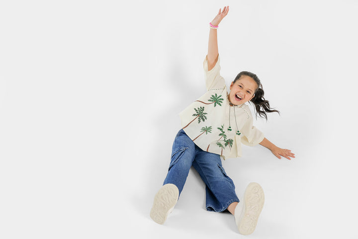 A graceful composition is portrayed on this elegant top portrayed in off white shade. It features a mesmerizing kimono silhouette and enriched with captivating embroidery illustrating palm tree designs in vibrant colors. Let your girls enjoy this happening season in this trendy top.