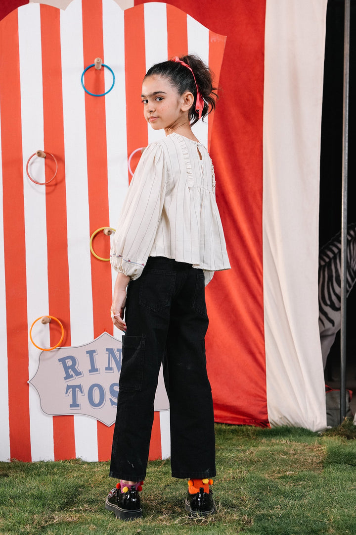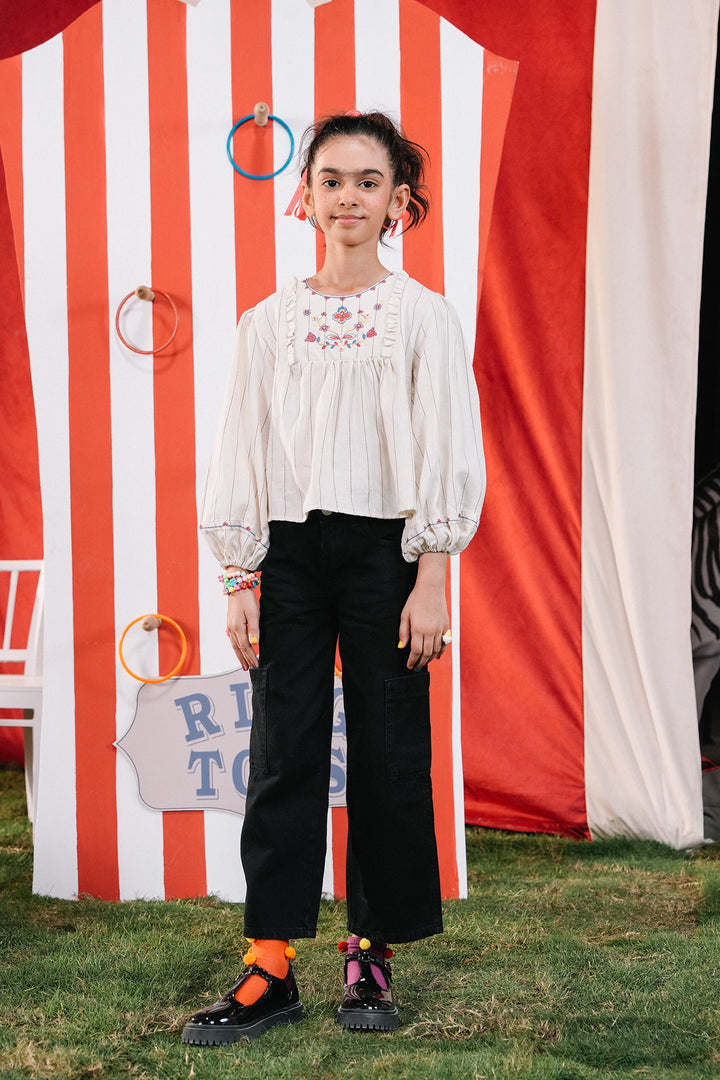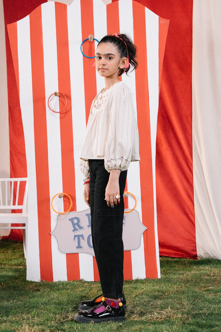 A classically chic design is portrayed on this elegant top rendered in coconut milk white shade. Crafted in a contemporary peplum silhouette with elasticated sleeves opening and adorned with intricate embroidery with floral designs illustrated in vibrant hues, let your kids look trendy this season in this statement top.