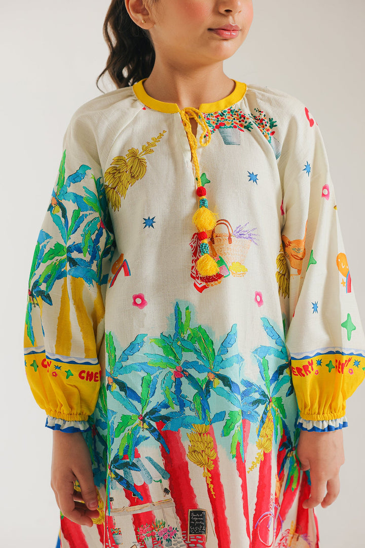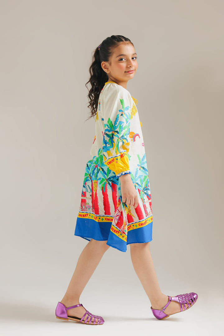 A colorful knee-length dress with long, puffy sleeves. The dress has a vibrant, tropical-inspired design with palm trees, red columns, and other artistic elements printed on a light-colored fabric, and the neckline has a small tie-up detail. The hem of the dress has a blue border, a cute addition to your kid's wardrobe.