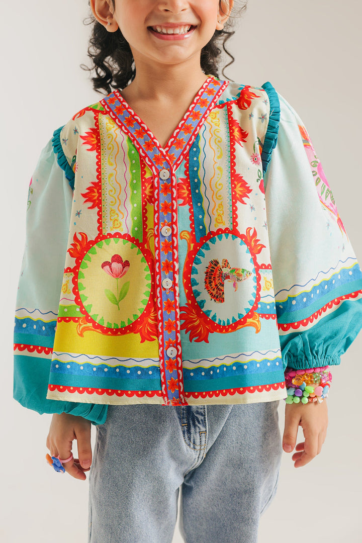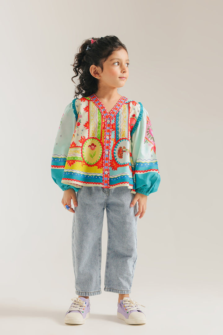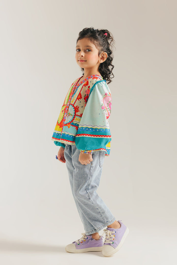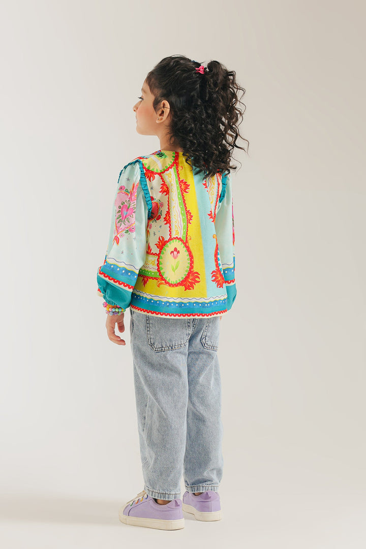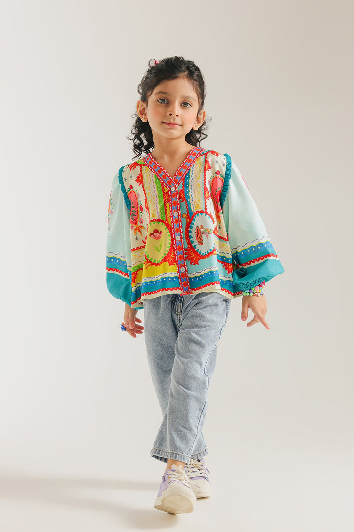 This vibrant top is a delightful explosion of color and pattern. It features a whimsical print of folkloric motifs, including flowers and animals, on a light blue and yellow background. The V-neckline is beautifully highlighted with a bright red and pink border. The full, balloon-style sleeves are cinched at the cuff with a solid turquoise band, creating a playful silhouette. This comfortable and stylish top is perfect for adding a pop of personality to any outfit.